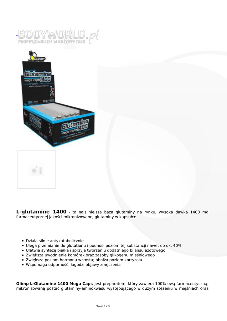 L-glutamine 1400 - to najsilniejsza baza glutaminy na rynku, wysoka dawka 1400 mg farmaceutycznej jakości mikronizowanej glutaminy w kapsułce. Działa silnie antykatabolicznie Ulega przemianie do glutationu i podnosi poziom tej substancji nawet do ok. 40% Ułatwia syntezę białka i sprzyja tworzeniu dodatniego bilansu azotowego Zwiększa uwodnienie komórek oraz zasoby glikogenu mięśniowego Zwiększa poziom hormonu wzrostu; obniża poziom kortyzolu Wspomaga odporność, łagodzi objawy zmęczenia Olimp L-Glutamine 1400 Mega Caps jest preparatem, który zawiera 100%-ową farmaceutyczną, mikronizowaną postać glutaminy-aminokwasu występującego w dużym stężeniu w mięśniach oraz Strona 1 z 3 plaźmie. Glutamina jest najważniejszym aminokwasem dla adaptacji tkanki mięśniowej. Magazynuje azot organiczny, sprzyja tworzeniu dodatniego bilansu azotowego. Dystrybuuje grupy aminowe do transaminacji i ostatecznie syntezy białek mięśniowych. Glutamina stanowi ponad 60% zasobów wolnych aminokwasów w komórkach mięśniowych i ponad 20% wszystkich aminokwasów występujących w organizmie. Mikronizowana L-glutamina jest formą łatwiej wchłanialną i znacznie aktywniejszą od tradycyjnej glutaminy oraz peptydu glutaminowego. Ideą rozpoczęcia i kontynuowania wysiłku sportowego jest poprawa zdolności wysiłkowych i generowanie postępów treningowych. Są one bezpośrednio uzależnione od siły i wielkości mięśni mających decydujące znacznie (najbardziej obciążanych) w danej dyscyplinie sportowej. Aby zapewnić im optymalne warunki do wzrostu i regeneracji, koniecznym jest utrzymanie w nich dodatniego bilansu azotowego, będącego miarą zgromadzonego w mięśniach, pełniącego funkcje budulcowe, białka. Olimp L-glutamina stanowi ponad 60% zasobów wolnych aminokwasów w komórkach mięśniowych i ponad 20% wszystkich aminokwasów występujących w organizmie. W sytuacji, kiedy inne narządy lub tkanki potrzebują azotu, czerpią go z tkanki mięśniowej. Białka mięśniowe ulegają wtedy rozpadowi (katabolizmowi), zaś uwolniony z nich azot zostaje przeniesiony na L-glutaminę 1400, która dystrybuuje ten pierwiastek do innych tkanek. Glutamina mikronizowana zwiększa przyrost siły i beztłuszczowej masy mięśniowej. Działa silnie antykatabolicznie - hamuje aktywność enzymów niszczących białka mięśniowe. Ulega przemianie do glutationu i podnosi poziom tej substancji nawet o 40%; glutation - jako antyoksydant - stabilizuje błony organelli komórkowych i hamuje uwalnianie enzymów katabolicznych, natomiast - jako transporter aminokwasów w cyklu gamma glutamylowym - ułatwia syntezę białka i sprzyja tworzeniu dodatniego bilansu azotowego. Glutamina zwiększa uwodnienie komórek, zasoby glikogenu mięśniowego i poziom anabolicznego hormonu wzrostu - obniżając jednocześnie poziom katabolicznego kortyzolu. Przyspiesza redukcje tkanki tłuszczowej. Łagodzi objawy zmęczenia obniżając poziom zakwaszenia komórek mięśniowych. Wspomaga organizm w kształtowaniu właściwej odporności. Spożywanie jej w 100%-owej, farmaceutycznie czystej, wolnej postaci, dodatkowo, odpowiednio mikronizowanej, dokładnie takiej formie, jak występuje w produkcie Olimp glutamina, prowadzi do tworzenia wysokiej wartości bilansu azotowego, czyli takiego stanu środowiska wewnętrznego organizmu, który sprzyja procesom anabolicznym i jednoczesnemu hamowaniu reakcji katabolicznych, wpływając na aktywność enzymów biorących udział w tych procesach. Mikronizacja maksymalne skraca czas przyswajania L-glutaminy zawartej w produkcie, czyniąc ten preparat wyjątkowo skutecznym „narzędziem” służącym przywracaniu równowagi i nadkompensacji azotu komórkowego. Badania na ludziach dowiodły wysokiej skuteczności L-glutaminy we wpływie na poprawę gospodarki azotowej (białkowej) organizmu. Mikronizowana L-glutamina zwiększa przyrost siły i beztłuszczowej masy mięśniowej. Dodatkowo, bierze udział w syntezie jednego z najsilniejszych antyoksydantów w organizmie człowieka – glutationu - podnosi jego poziom nawet o 40%. Glutation bardzo wydajnie stabilizuje błony organelli komórkowych, skutecznie obniżając niszczącą moc działania wolnych rodników oraz hamuje uwalnianie enzymów katabolicznych. L-glutamine 1400 zwiększa także uwodnienie komórek, zasoby glikogenu mięśniowego oraz łagodzi objawy zmęczenia - obniża poziom zakwaszenia komórek mięśniowych (dostarcza grup aminowych do cyklu mocznikowego). Olimp l-glutamine to doskonałe, ekonomiczne rozwiązanie dla wszystkich osób obciążonych każdą formą wysiłku fizycznego. Ten najwyższej jakości produkt marki Olimp Sport Nutrition niezwykle efektywnie przyczyni się do stworzenia i utrzymania optymalnych warunków regeneracji obciążonych treningiem mięśni oraz szybkiego przywrócenia równowagi kwasowo-zasadowej organizmu. Będzie również niezrównaną pomocą dla osób z osłabionym układem immunologicznym, które chcą skutecznie podnieść odporność swojego organizmu. Strona 2 z 3 Strona 3 z 3