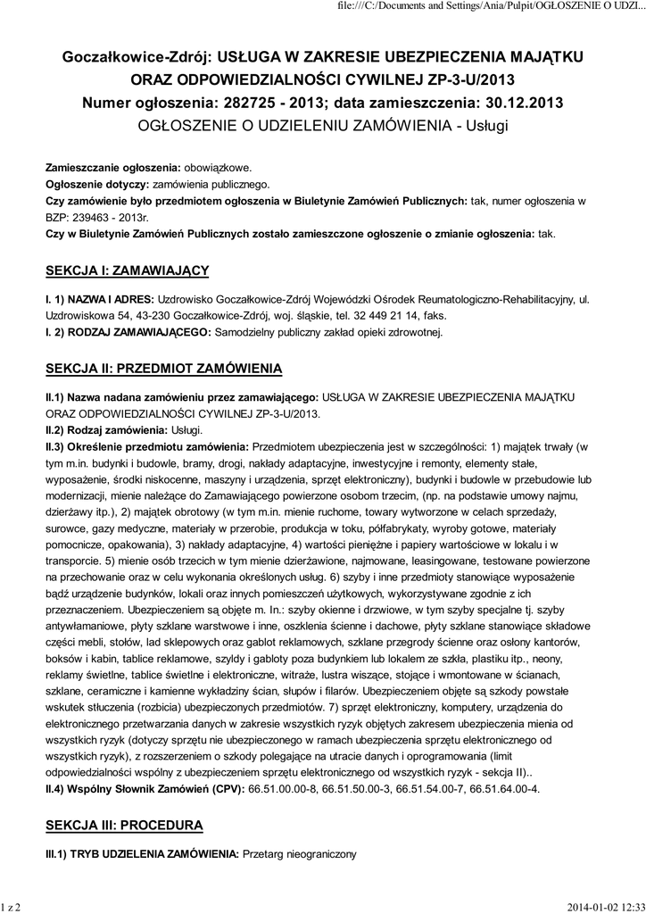 1z2 file:///C:/Documents and Settings/Ania/Pulpit/OGŁOSZENIE O UDZI... Goczałkowice-Zdrój: USŁUGA W ZAKRESIE UBEZPIECZENIA MAJĄTKU ORAZ ODPOWIEDZIALNOŚCI CYWILNEJ ZP-3-U/2013 Numer ogłoszenia: 282725 - 2013; data zamieszczenia: 30.12.2013 OGŁOSZENIE O UDZIELENIU ZAMÓWIENIA - Usługi Zamieszczanie ogłoszenia: obowiązkowe. Ogłoszenie dotyczy: zamówienia publicznego. Czy zamówienie było przedmiotem ogłoszenia w Biuletynie Zamówień Publicznych: tak, numer ogłoszenia w BZP: 239463 - 2013r. Czy w Biuletynie Zamówień Publicznych zostało zamieszczone ogłoszenie o zmianie ogłoszenia: tak. SEKCJA I: ZAMAWIAJĄCY I. 1) NAZWA I ADRES: Uzdrowisko Goczałkowice-Zdrój Wojewódzki Ośrodek Reumatologiczno-Rehabilitacyjny, ul. Uzdrowiskowa 54, 43-230 Goczałkowice-Zdrój, woj. śląskie, tel. 32 449 21 14, faks. I. 2) RODZAJ ZAMAWIAJĄCEGO: Samodzielny publiczny zakład opieki zdrowotnej. SEKCJA II: PRZEDMIOT ZAMÓWIENIA II.1) Nazwa nadana zamówieniu przez zamawiającego: USŁUGA W ZAKRESIE UBEZPIECZENIA MAJĄTKU ORAZ ODPOWIEDZIALNOŚCI CYWILNEJ ZP-3-U/2013. II.2) Rodzaj zamówienia: Usługi. II.3) Określenie przedmiotu zamówienia: Przedmiotem ubezpieczenia jest w szczególności: 1) majątek trwały (w tym m.in. budynki i budowle, bramy, drogi, nakłady adaptacyjne, inwestycyjne i remonty, elementy stałe, wyposażenie, środki niskocenne, maszyny i urządzenia, sprzęt elektroniczny), budynki i budowle w przebudowie lub modernizacji, mienie należące do Zamawiającego powierzone osobom trzecim, (np. na podstawie umowy najmu, dzierżawy itp.), 2) majątek obrotowy (w tym m.in. mienie ruchome, towary wytworzone w celach sprzedaży, surowce, gazy medyczne, materiały w przerobie, produkcja w toku, półfabrykaty, wyroby gotowe, materiały pomocnicze, opakowania), 3) nakłady adaptacyjne, 4) wartości pieniężne i papiery wartościowe w lokalu i w transporcie. 5) mienie osób trzecich w tym mienie dzierżawione, najmowane, leasingowane, testowane powierzone na przechowanie oraz w celu wykonania określonych usług. 6) szyby i inne przedmioty stanowiące wyposażenie bądź urządzenie budynków, lokali oraz innych pomieszczeń użytkowych, wykorzystywane zgodnie z ich przeznaczeniem. Ubezpieczeniem są objęte m. In.: szyby okienne i drzwiowe, w tym szyby specjalne tj. szyby antywłamaniowe, płyty szklane warstwowe i inne, oszklenia ścienne i dachowe, płyty szklane stanowiące składowe części mebli, stołów, lad sklepowych oraz gablot reklamowych, szklane przegrody ścienne oraz osłony kantorów, boksów i kabin, tablice reklamowe, szyldy i gabloty poza budynkiem lub lokalem ze szkła, plastiku itp., neony, reklamy świetlne, tablice świetlne i elektroniczne, witraże, lustra wiszące, stojące i wmontowane w ścianach, szklane, ceramiczne i kamienne wykładziny ścian, słupów i filarów. Ubezpieczeniem objęte są szkody powstałe wskutek stłuczenia (rozbicia) ubezpieczonych przedmiotów. 7) sprzęt elektroniczny, komputery, urządzenia do elektronicznego przetwarzania danych w zakresie wszystkich ryzyk objętych zakresem ubezpieczenia mienia od wszystkich ryzyk (dotyczy sprzętu nie ubezpieczonego w ramach ubezpieczenia sprzętu elektronicznego od wszystkich ryzyk), z rozszerzeniem o szkody polegające na utracie danych i oprogramowania (limit odpowiedzialności wspólny z ubezpieczeniem sprzętu elektronicznego od wszystkich ryzyk - sekcja II).. II.4) Wspólny Słownik Zamówień (CPV): 66.51.00.00-8, 66.51.50.00-3, 66.51.54.00-7, 66.51.64.00-4. SEKCJA III: PROCEDURA III.1) TRYB UDZIELENIA ZAMÓWIENIA: Przetarg nieograniczony 2014-01-02 12:33 2z2 file:///C:/Documents and Settings/Ania/Pulpit/OGŁOSZENIE O UDZI... III.2) INFORMACJE ADMINISTRACYJNE Zamówienie dotyczy projektu/programu finansowanego ze środków Unii Europejskiej: nie SEKCJA IV: UDZIELENIE ZAMÓWIENIA Część NR: 1 Nazwa: Zadanie i ubezpieczenie mienia od wszystkich ryzyk,ubezpieczenie sprzętu elektronicznego od wszystkich ryzyk IV.1) DATA UDZIELENIA ZAMÓWIENIA: 18.12.2013. IV.2) LICZBA OTRZYMANYCH OFERT: 4. IV.3) LICZBA ODRZUCONYCH OFERT: 0. IV.4) NAZWA I ADRES WYKONAWCY, KTÓREMU UDZIELONO ZAMÓWIENIA: UNIQA Towarzystwo Ubezpieczeń S.A. z siedzibą w łodzi ul.Gdańska 132 Oddział w Katowicach , al.Roździeńskiego 88A, Al.Roździeńskiego 88A, 40-203 Katowice, kraj/woj. śląskie. IV.5) Szacunkowa wartość zamówienia (bez VAT): 80000,00 PLN. IV.6) INFORMACJA O CENIE WYBRANEJ OFERTY ORAZ O OFERTACH Z NAJNIŻSZĄ I NAJWYŻSZĄ CENĄ Cena wybranej oferty: 30406,00 Oferta z najniższą ceną: 30406,00 / Oferta z najwyższą ceną: 143652,00 Waluta: PLN. Część NR: 2 Nazwa: Ubezpieczenie pojazdów IV.1) DATA UDZIELENIA ZAMÓWIENIA: 18.12.2013. IV.2) LICZBA OTRZYMANYCH OFERT: 2. IV.3) LICZBA ODRZUCONYCH OFERT: 0. IV.4) NAZWA I ADRES WYKONAWCY, KTÓREMU UDZIELONO ZAMÓWIENIA: UNIQA Towarzystwo Ubezpieczeń S.A. z siedzibą w Łodzi, ul.Gdańska 132,Oddział w Katowicach, Al. Roździeńskiego 88A, 40-203 Katowice, Al.Roździeńskiego 88A, 40-203 Katowice, kraj/woj. śląskie. IV.5) Szacunkowa wartość zamówienia (bez VAT): 4000,00 PLN. IV.6) INFORMACJA O CENIE WYBRANEJ OFERTY ORAZ O OFERTACH Z NAJNIŻSZĄ I NAJWYŻSZĄ CENĄ Cena wybranej oferty: 1850,00 Oferta z najniższą ceną: 1850,00 / Oferta z najwyższą ceną: 2801,00 Waluta: PLN. Część NR: 3 Nazwa: Obowiązkowe ubezpieczenie odpowiedzialności cywilnej podmiotu wykonującego działalność leczniczą za szkody będące następstwem udzielenia świadczeń zdrowotnych albo niezgodnego z prawem zaniechania udzielenia świadczeń zdrowotnych IV.1) DATA UDZIELENIA ZAMÓWIENIA: 18.12.2013. IV.2) LICZBA OTRZYMANYCH OFERT: 3. IV.3) LICZBA ODRZUCONYCH OFERT: 0. IV.4) NAZWA I ADRES WYKONAWCY, KTÓREMU UDZIELONO ZAMÓWIENIA: Powszechny Zakład Ubezpieczeń S.A. Oddział Regionalny w Katowicach, ul. Mickiewicza 5, ul. Mickiewicza 5, 40-953 Katowice, kraj/woj. śląskie. IV.5) Szacunkowa wartość zamówienia (bez VAT): 75000,00 PLN. IV.6) I