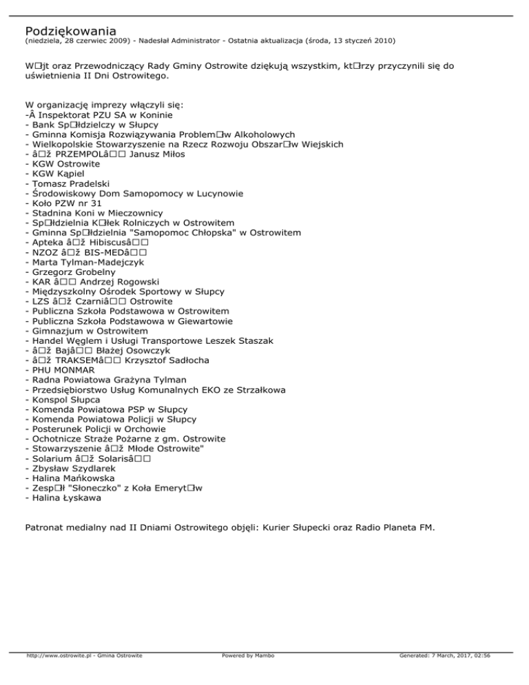 Podziękowania (niedziela, 28 czerwiec 2009) - Nadesłał Administrator - Ostatnia aktualizacja (środa, 13 styczeń 2010) WÃłjt oraz Przewodniczący Rady Gminy Ostrowite dziękują wszystkim, ktÃłrzy przyczynili się do uświetnienia II Dni Ostrowitego. W organizację imprezy włączyli się: - Inspektorat PZU SA w Koninie - Bank SpÃłłdzielczy w Słupcy - Gminna Komisja Rozwiązywania ProblemÃłw Alkoholowych - Wielkopolskie Stowarzyszenie na Rzecz Rozwoju ObszarÃłw Wiejskich - „PRZEMPOL― Janusz Miłos - KGW Ostrowite - KGW Kąpiel - Tomasz Pradelski - Środowiskowy Dom Samopomocy w Lucynowie - Koło PZW nr 31 - Stadnina Koni w Mieczownicy - SpÃłłdzielnia KÃłłek Rolniczych w Ostrowitem - Gminna SpÃłłdzielnia "Samopomoc Chłopska" w Ostrowitem - Apteka „Hibiscus― - NZOZ „BIS-MED― - Marta Tylman-Madejczyk - Grzegorz Grobelny - KAR – Andrzej Rogowski - Międzyszkolny Ośrodek Sportowy w Słupcy - LZS „Czarni― Ostrowite - Publiczna Szkoła Podstawowa w Ostrowitem - Publiczna Szkoła Podstawowa w Giewartowie - Gimnazjum w Ostrowitem - Handel Węglem i Usługi Transportowe Leszek Staszak - „Baj― Błażej Osowczyk - „TRAKSEM― Krzysztof Sadłocha - PHU MONMAR - Radna Powiatowa Grażyna Tylman - Przedsiębiorstwo Usług Komunalnych EKO ze Strzałkowa - Konspol Słupca - Komenda Powiatowa PSP w Słupcy - Komenda Powiatowa Policji w Słupcy - Posterunek Policji w Orchowie - Ochotnicze Straże Pożarne z gm. Ostrowite - Stowarzyszenie „Młode Ostrowite" - Solarium „Solaris― - Zbysław Szydlarek - Halina Mańkowska - ZespÃłł "Słoneczko" z Koła EmerytÃłw - Halina Łyskawa Patronat medialny nad II Dniami Ostrowitego objęli: Kurier Słupecki oraz Radio Planeta FM. http://www.ostrowite.pl - Gmina Ostrowite Powered by Mambo Generated: 7 March, 2017, 02:56