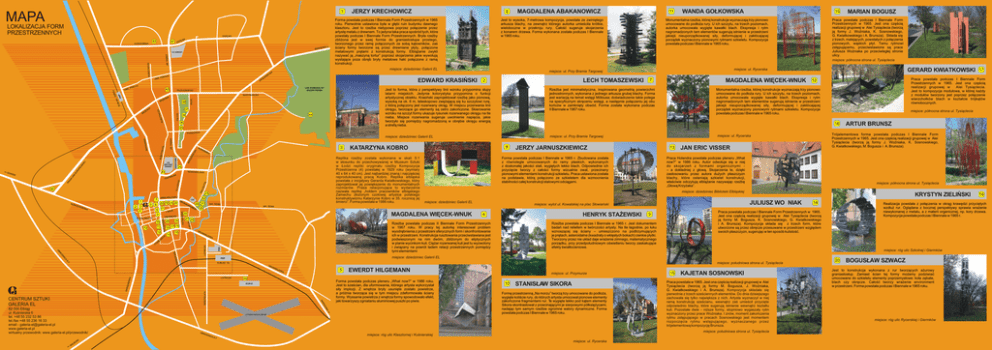 MAPA LOKALIZACJA FORM PRZESTRZENNYCH JERZY KRECHOWICZ MAGDALENA ABAKANOWICZ Forma powsta³a podczas I Biennale Form Przestrzennych w 1965 roku. Pierwotnie ustawiona by³a w g³êbi ruin budynku dawnego klasztoru. Jest to rzeŸba nietypowa poprzez po³¹czenie przez artystê metalu z drewnem. To jedyna taka praca spoœród tych, które powsta³y podczas I Biennale Form Przestrzennych. Bry³a rzeŸby zbli¿ona jest w swej formie do graniastos³upa prostego, tworzonego przez ramê po³¹czonych ze sob¹ k¹towników, zaœ œciany formy tworzone s¹ przez drewniane p³yty, po³¹czone metalowymi prêtami z konstrukcj¹ formy. Elbl¹¿anie zwykli nazywaæ j¹ „maszyn¹ tortur” poprzez skojarzenia jakie wywo³uj¹ wystaj¹ce poza obrêb bry³y metalowe haki po³¹czone z ram¹ konstrukcji. miejsce: dziedziniec Galerii EL Jest to wysoka, 7-metrowa kompozycja, powsta³a ze zwiniêtego arkusza blachy, na zewn¹trz którego autorka umieœci³a krótkie, wieloboczne w przekroju rury. Ca³oœæ sugeruje skojarzenia z konarem drzewa. Forma wykonana zosta³a podczas I Biennale w 1965 roku. LECH TOMASZEWSKI Jest to forma, która z perspektywy linii wzroku przypomina s³upy latarni miejskich. Jedynie kolorystyka przypomina o funkcji artystycznej obiektu. Krasiñski zaprojektowa³ rzeŸbê jako pionow¹, wysok¹ na ok. 6 m, teleskopowo zwê¿aj¹c¹ siê ku szczytowi rurê, z któr¹ po³¹czony jest rozerwany okr¹g. W miejscu przerwania linii okrêgu, tworz¹ce go elementy s¹ ostro zakoñczone. Skierowanie wzroku na szczyt formy ukazuje rysunek rozerwanego okrêgu na tle nieba. Miejsce rozerwania sugeruje uwolnienie napiêcia, jakie tworzy³o siê pomiêdzy nagromadzon¹ w obrêbie okrêgu energi¹ a stref¹ nieba. RzeŸba jest minimalistyczna, inspirowana geometri¹ powierzchni jednostronnych, wykonana z jednego arkusza grubej blachy. Forma jest wariacj¹ na temat wstêgi Möbiusa; doœwiadczenie takie polega na specyficznym skrêceniu wstêgi, a nastêpnie po³¹czeniu jej obu koñców w zamkniêty obwód. Forma zosta³a wykonana podczas II Biennale w 1967 roku. miejsce: dziedziniec Galerii EL miejsce: ul. Przy Bramie Targowej Replika rzeŸby zosta³a wykonana w skali 5:1 w stosunku do przechowywanej w Muzeum Sztuki w £odzi repliki orygina³u rzeŸby Kompozycja Przestrzenna (4) powsta³ej w 1929 roku (wymiary 40 x 64 x 40 cm). Jest najbardziej znan¹ i najczêœciej reprodukowan¹ prac¹ Kobro. Replika elbl¹ska powsta³a z inicjatywy Gerarda Kwiatkowskiego, który zaprojektowa³ jej powiêkszenie do monumentalnych rozmiarów. Prasa relacjonuj¹ca to wydarzenie nazwa³a replikê „ho³dem pracowników elbl¹skiego Zamechu z³o¿onym czo³owej artystce polskiego konstruktywizmu Katarzynie Kobro w 35. rocznicê jej œmierci”. Forma powsta³a w 1986 roku. MARIAN BOGUSZ Monumentalna rzeŸba, której konstrukcje wyznaczaj¹ trzy pionowo umocowane do pod³o¿a rury. U ich szczytu, na trzech poziomach, autorka umocowa³a wygiête kawa³ki blach. Ekspresja i rytm nagromadzonych tam elementów sugeruj¹ istnienie w przestrzeni jakiejœ nieuporz¹dkowanej si³y, deformuj¹cej i zak³ócaj¹cej porz¹dek wyznaczony pionowymi rytmami szkieletu. Kompozycja powsta³a podczas I Biennale w 1965 roku. JERZY JARNUSZKIEWICZ Forma powsta³a podczas I Biennale w 1965 r. Zbudowana zosta³a z równolegle umocowanych do ramy p³askich, wykonanych z doskona³ej jakoœci stali, wygiêtych lekko blach. Odpowiednie ich przyciêcie tworzy z ca³oœci formy wizualnie owal, przecinany pionowymi elementami konstrukcji szkieletu. Praca ustawiona zosta³a na podstawie, któr¹ po³¹czono ze szkieletem dla wzmocnienia stabilnoœci ca³ej konstrukcji stalowymi odci¹gami. Praca powsta³a podczas I Biennale Form Przestrzennych w 1965. Jest ona czêœci¹ realizacji grupowej w Alei Tysi¹clecia. Jest to kompozycja modu³owa, w której ka¿dy z modu³ów tworzony jest poprzez po³¹czenie wierzcho³ków blach w kszta³cie trójk¹tów równobocznych. MAGDALENA WIÊCEK-WNUK Monumentalna rzeŸba, której konstrukcje wyznaczaj¹ trzy pionowo umocowane do pod³o¿a rury. U ich szczytu, na trzech poziomach, autorka umocowa³a wygiête kawa³ki blach. Ekspresja i rytm nagromadzonych tam elementów sugeruj¹ istnienie w przestrzeni jakiejœ nieuporz¹dkowanej si³y, deformuj¹cej i zak³ócaj¹cej porz¹dek wyznaczony pionowymi rytmami szkieletu. Kompozycja powsta³a podczas I Biennale w 1965 roku. miejsce: pó³nocna strona ul. Tysi¹clecia miejsce: ul. Rycerska JAN ERIC VISSER Praca Holendra powsta³a podczas pleneru „What now?” w 1986 roku. Autor odwo³uje siê w niej do skojarzeñ z formami organicznymi – a dok³adniej z g³ow¹. Skojarzenia te, dziêki zastosowaniu przez autora du¿ych p³aszczyzn blachy, które os³aniaj¹ szkielet konstrukcji, w³aœciwie odczytuj¹ elbl¹¿anie nazywaj¹c rzeŸbê „G³ow¹ Krzy¿aka”. Trójelementowa forma powsta³a podczas I Biennale Form Przestrzennych w 1965. Jest ona czêœci¹ realizacji grupowej w Alei Tysi¹clecia (tworz¹ j¹ formy J. WoŸniaka, K. Sosnowskiego, G. Kwiatkowskiego, M. Bogusza i A. Brunsza). miejsce: pó³nocna strona ul. Tysi¹clecia miejsce: dziedziniec Biblioteki Elbl¹skiej miejsce: dziedziniec Galerii EL RzeŸba powsta³a podczas II Biennale Form Przestrzennych w 1967 roku. W pracy tej autorkê interesowa³ problem wyodrêbnienia z przestrzeni sferycznych form i skonfrontowanie ich w przestrzeni. Konstrukcja rusztowania przeciwstawiana jest podwieszonym na nim dwóm, zbli¿onym do eliptycznych w planie wycinkom kuli. Ciê¿ar rozerwanej kuli jest tu wyzwolony i zwi¹zany na powrót ³adem relacji przestrzennych pomiêdzy tymi elementami JULIUSZ WO•NIAK miejsce: wylot ul. Kowalskiej na plac S³owiañski HENRYK STA¯EWSKI RzeŸba powsta³a podczas I Biennale w 1965 r. Jest dokumentem badañ nad reliefem w twórczoœci artysty. Na tle ³agodnie, po ³uku wznosz¹cej siê œciany – umieszczono na podtrzymuj¹cych je prêtach, asteroidalne (kwadraty o wklês