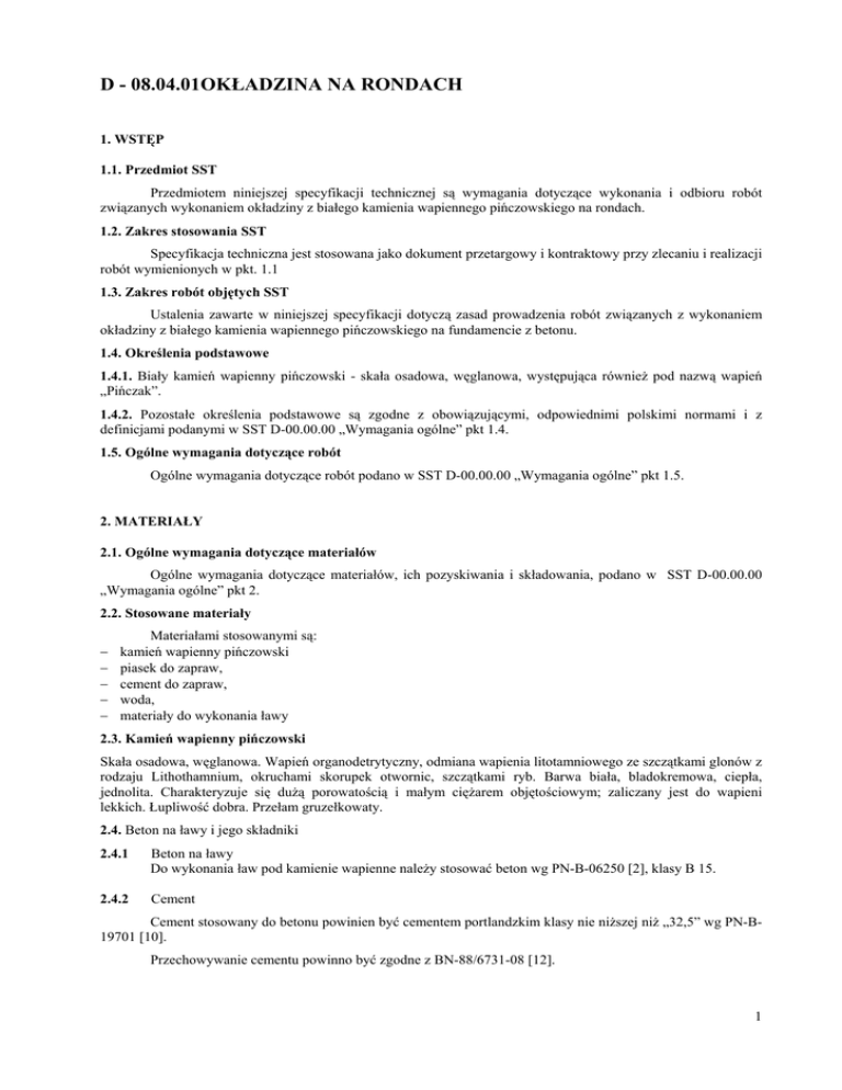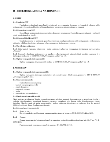 D - 08.04.01OKŁADZINA NA RONDACH 1. WSTĘP 1.1. Przedmiot SST Przedmiotem niniejszej specyfikacji technicznej są wymagania dotyczące wykonania i odbioru robót związanych wykonaniem okładziny z białego kamienia wapiennego pińczowskiego na rondach. 1.2. Zakres stosowania SST Specyfikacja techniczna jest stosowana jako dokument przetargowy i kontraktowy przy zlecaniu i realizacji robót wymienionych w pkt. 1.1 1.3. Zakres robót objętych SST Ustalenia zawarte w niniejszej specyfikacji dotyczą zasad prowadzenia robót związanych z wykonaniem okładziny z białego kamienia wapiennego pińczowskiego na fundamencie z betonu. 1.4. Określenia podstawowe 1.4.1. Biały kamień wapienny pińczowski - skała osadowa, węglanowa, występująca również pod nazwą wapień „Pińczak”. 1.4.2. Pozostałe określenia podstawowe są zgodne z obowiązującymi, odpowiednimi polskimi normami i z definicjami podanymi w SST D-00.00.00 „Wymagania ogólne” pkt 1.4. 1.5. Ogólne wymagania dotyczące robót Ogólne wymagania dotyczące robót podano w SST D-00.00.00 „Wymagania ogólne” pkt 1.5. 2. MATERIAŁY 2.1. Ogólne wymagania dotyczące materiałów Ogólne wymagania dotyczące materiałów, ich pozyskiwania i składowania, podano w SST D-00.00.00 „Wymagania ogólne” pkt 2. 2.2. Stosowane materiały − − − − − Materiałami stosowanymi są: kamień wapienny pińczowski piasek do zapraw, cement do zapraw, woda, materiały do wykonania ławy 2.3. Kamień wapienny pińczowski Skała osadowa, węglanowa. Wapień organodetrytyczny, odmiana wapienia litotamniowego ze szczątkami glonów z rodzaju Lithothamnium, okruchami skorupek otwornic, szczątkami ryb. Barwa biała, bladokremowa, ciepła, jednolita. Charakteryzuje się dużą porowatością i małym ciężarem objętościowym; zaliczany jest do wapieni lekkich. Łupliwość dobra. Przełam gruzełkowaty. 2.4. Beton na ławy i jego składniki 2.4.1 Beton na ławy Do wykonania ław pod kamienie wapienne należy stosować beton wg PN-B-06250 [2], klasy B 15. 2.4.2 Cement Cement stosowany do betonu powinien być cementem portlandzkim klasy nie niższej niż „32,5” wg PN-B19701 [10]. Przechowywanie cementu powinno być zgodne z BN-88/6731-08 [12]. 1 2.4.3 Kruszywo Kruszywo powinno odpowiadać wymaganiom PN-B-06712 [5]. Kruszywo należy przechowywać w warunkach zabezpieczających je przed zanieczyszczeniem, zmieszaniem z kruszywami innych asortymentów, gatunków i marek. 2.4.4 Woda Woda powinna być odmiany „1” i odpowiadać wymaganiom PN-B-32250 [11]. 3. SPRZĘT 3.1. Ogólne wymagania dotyczące sprzętu Ogólne wymagania dotyczące sprzętu podano w OST D-M-00.00.00 „Wymagania ogólne” pkt 3. 3.2. Sprzęt Roboty wykonuje się ręcznie przy zastosowaniu: − betoniarek do wytwarzania betonu i zapraw oraz przygotowania podsypki cementowo-piaskowej, − pił do kamienia, łuparek, siekier, dłut, kilofów, młotów. 4. TRANSPORT 4.1. Ogólne wymagania dotyczące transportu Ogólne wymagania dotyczące transportu podano w SST D-M-00.00.00 „Wymagania ogólne” pkt 4. 4.2. Transport materiałów kamiennych Materiały kamienne mogą być przewożone dowolnymi środkami transportu w sposób zabezpieczony przed przemieszczaniem się i uszkodzeniami. 4.3. Transport pozostałych materiałów Transport cementu powinien się odbywać w warunkach zgodnych z BN-88/6731-08 [12]. Kruszywa można przewozić dowolnym środkiem transportu, w warunkach zabezpieczających je przed zanieczyszczeniem i zmieszaniem z innymi materiałami. Podczas transportu kruszywa powinny być zabezpieczone przed wysypaniem, a kruszywo drobne - przed rozpyleniem. 5. WYKONANIE ROBÓT 5.1. Ogólne zasady wykonania robót Ogólne zasady wykonania robót podano w SST D-M-00.00.00 „Wymagania ogólne” pkt 5. 5.2. Wykonanie ław Wykonanie ław powinno być zgodne z BN-64/8845-02 [16]. 5.2.1. Ława betonowa Ławy betonowe z oporem wykonuje się w szalowaniu. Beton rozścielony w szalowaniu lub bezpośrednio w korycie powinien być wyrównywany warstwami. Betonowanie ław należy wykonywać zgodnie z wymaganiami PN-B-06251 [3], przy czym należy stosować co 50 m szczeliny dylatacyjne wypełnione bitumiczną masą zalewową. 6. KONTROLA JAKOŚCI ROBÓT 6.1. Ogólne zasady kontroli jakości robót Ogólne zasady kontroli jakości robót podano w SST D-M-00.00.00 „Wymagania ogólne” pkt 6. 6.2. Kontrola ławy Profil podłużny górnej powierzchni ławy powinien być zgodny z projektowaną niweletą wyspy środkowej. Dopuszczalne odchylenia mogą wynosić ± 1 cm na każde 20 m ławy 2 Wymiary ławy należy sprawdzać w dwóch dowolnie wybranych punktach na każde 20m ławy. Tolerancje wymiarów wynoszą: - dla wysokości ± 10 % wysokości projektowanej, - dla szerokości ławy ± 20 % szerokości projektowanej. 7. OBMIAR ROBÓT 7.1. Ogólne zasady obmiaru robót Ogólne zasady obmiaru robót podano w SST D-M-00.00.00 „Wymagania ogólne” pkt 7. 7.2. Jednostka obmiarowa Jednostką obmiarową jest m (metr) wykonanej okładziny liczony po obwodzie wyspy ronda . 8. ODBIÓR ROBÓT 8.1. Ogólne zasady odbioru robót Ogólne zasady odbioru robót podano w SST D-M-00.00.00 „Wymagania ogólne” pkt 8. Roboty uznaje się za wykonane zgodnie z dokumentacją projektową, SST i wymaganiami Inżyniera, jeżeli wszystkie pomiary i badania z zachowaniem tolerancji wg pkt 6 dały wyniki pozytywne. 8.2. Odbiór robót zanikających i ulegających zakryciu Odbiorowi robót zanikających i ulegających zakryciu podlegają: − wykonanie koryta pod ławę, − wykonanie ławy, 9. PODSTAWA PŁATNOŚCI 9.1. Ogólne ustalenia dotyczące podstawy płatności Ogólne ustalenia dotyczące podstawy płatności podano w SST D-M-00.00.00 „Wymagania ogólne” pkt 9. 9.2. Cena jednostki obmiarowej − − − − − − − Cena wykonania 1m okładziny obejmuje : prace pomiarowe i roboty przygotowawcze, dostarczenie materiałów na miejsce wbudowania, wykonanie koryta pod ław