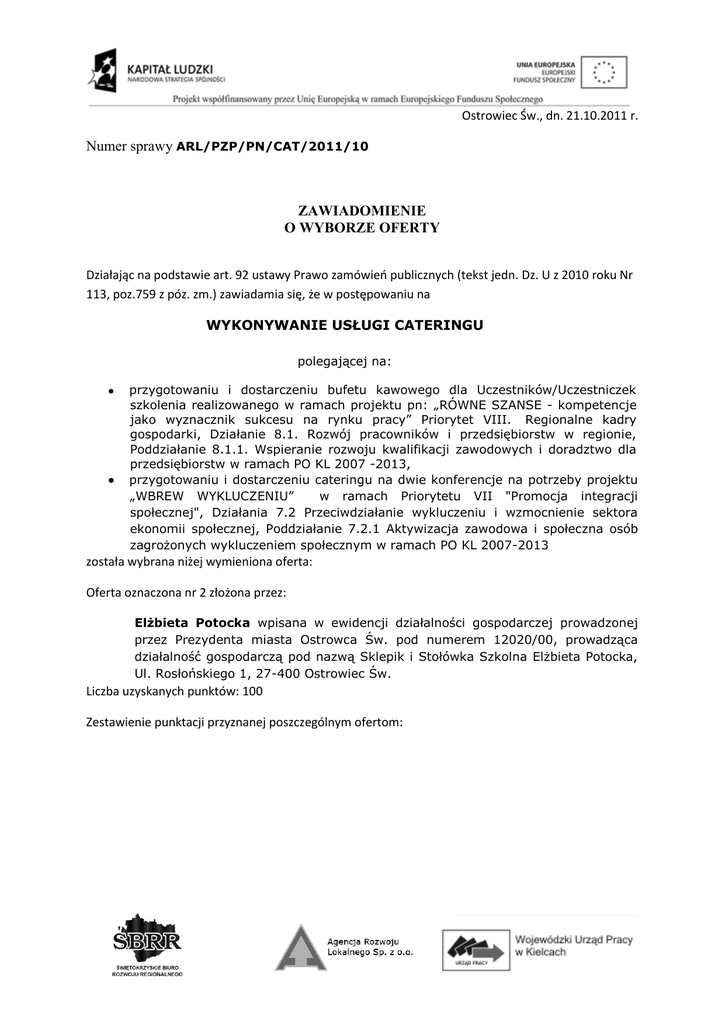 Ostrowiec Św., dn. 21.10.2011 r. Numer sprawy ARL/PZP/PN/CAT/2011/10 ZAWIADOMIENIE O WYBORZE OFERTY Działając na podstawie art. 92 ustawy Prawo zamówieo publicznych (tekst jedn. Dz. U z 2010 roku Nr 113, poz.759 z póz. zm.) zawiadamia się, że w postępowaniu na WYKONYWANIE USŁUGI CATERINGU polegającej na: przygotowaniu i dostarczeniu bufetu kawowego dla Uczestników/Uczestniczek szkolenia realizowanego w ramach projektu pn: „RÓWNE SZANSE - kompetencje jako wyznacznik sukcesu na rynku pracy” Priorytet VIII. Regionalne kadry gospodarki, Działanie 8.1. Rozwój pracowników i przedsiębiorstw w regionie, Poddziałanie 8.1.1. Wspieranie rozwoju kwalifikacji zawodowych i doradztwo dla przedsiębiorstw w ramach PO KL 2007 -2013, przygotowaniu i dostarczeniu cateringu na dwie konferencje na potrzeby projektu „WBREW WYKLUCZENIU” w ramach Priorytetu VII "Promocja integracji społecznej", Działania 7.2 Przeciwdziałanie wykluczeniu i wzmocnienie sektora ekonomii społecznej, Poddziałanie 7.2.1 Aktywizacja zawodowa i społeczna osób zagrożonych wykluczeniem społecznym w ramach PO KL 2007-2013 została wybrana niżej wymieniona oferta: Oferta oznaczona nr 2 złożona przez: Elżbieta Potocka wpisana w ewidencji działalności gospodarczej prowadzonej przez Prezydenta miasta Ostrowca Św. pod numerem 12020/00, prowadząca działalność gospodarczą pod nazwą Sklepik i Stołówka Szkolna Elżbieta Potocka, Ul. Rosłońskiego 1, 27-400 Ostrowiec Św. Liczba uzyskanych punktów: 100 Zestawienie punktacji przyznanej poszczególnym ofertom: Punkty uzyskane w poszczególnych kryteriach oceny ofert WYKONAWCA Oferta oznaczona nr 1złożona przez: Tomasz Soczomski wpisany w ewidencji działalności gospodarczej prowadzonej przez Wójta Gminy Miedziana Góra pod numerem 16980/07, prowadzący działalność gospodarczą pod nazwą P.H.U. CARLA, ul. Ciosowa 39, Ciosowa,26-085 Miedziana Góra Oferta oznaczona nr 2złożona przez: Elżbieta Potocka wpisana w ewidencji działalności gospodarczej prowadzonej przez Prezydenta miasta Ostrowca Św. pod numerem 12020/00, prowadząca działalność gospodarczą pod nazwą Sklepik i Stołówka Szkolna Elżbieta Potocka, Ul. Rosłońskiego 1, 27-400 Ostrowiec Św. Łącznie Kryterium – cena C= najniższa cena ofertowa ------------------------x 100 cena oferty badanej C= 2.650,00 zł ------------------------4.752,00 zł x 100 C= 2.650,00 zł ------------------------2.650,00 zł x 100 55,70 100 Uzasadnienie: Wybrana oferta spełnia wszystkie wymagania zamawiającego określone w treści SIWZ. Oferta uzyskała najwyższą ilość punktów – zawiera najniższą cenę wykonania usługi. Oferta najkorzystniejsza w rozumieniu art. 2 pkt. 5 PZP Wobec faktu, że w postępowaniu nie odrzucono żadnej oferty oraz nie wykluczono żadnego z wykonawców, zgodnie z zapisem art. 94 ust. 2 pkt 3a umowa w sprawie udzielenia zamówienia publicznego może być zawarta niezwłocznie. 2 ZAWIADOMIENIE O WYBORZE NAJKORZYSTNIEJSZEJ OFERTY ZOSTAŁO ZAMIESZCZONE NA STRONIE INTERNETOWEJ ZAMAWIAJĄCEGO JAK RÓWNIEŻ NA TABLICY OGŁOSZEOW SIEDZIBIE ZAMAWIAJĄCEGO W DNIU 21.10.2010 ROKU Umowa z wybranym Wykonawcą zostanie podpisana w dniu 24.10.2011r. w siedzibie Agencji Rozwoju Lokalnego Sp. z o.o. w Ostrowcu Św. Prokurent ARL Sp. z o.o. Janusz Nowak 3