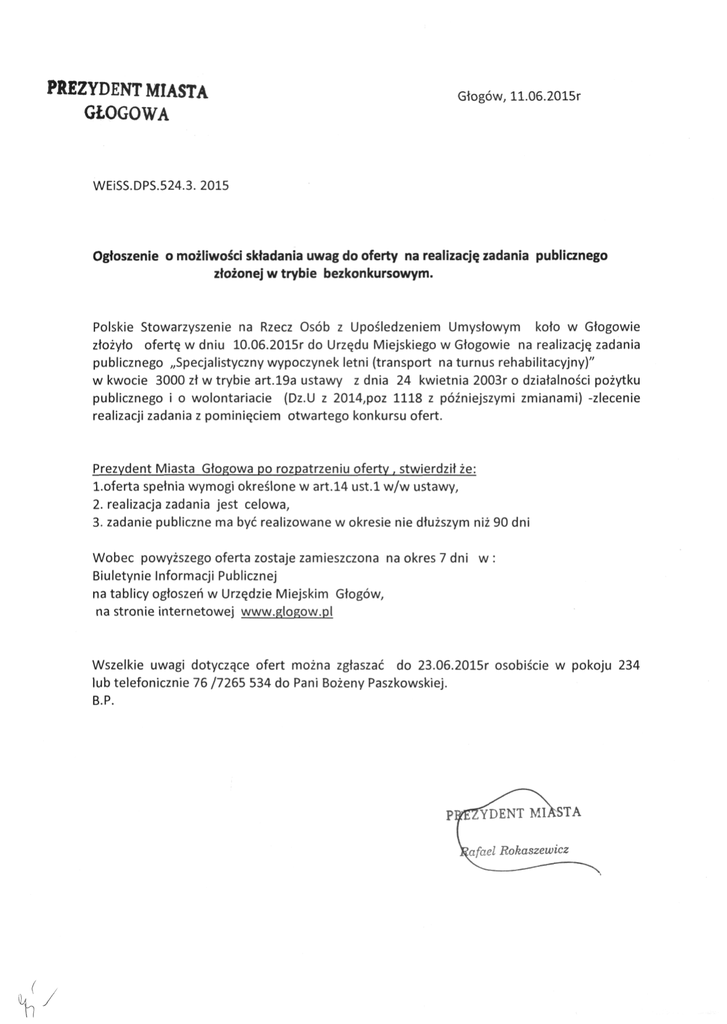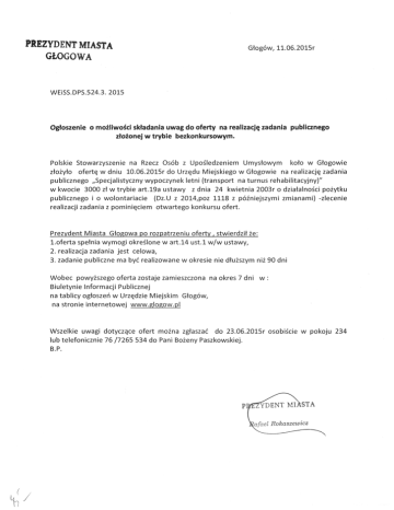 PREZYDENT MIASTA GŁOGOWA Głogów, n.o6.20i5r WEiSS.DPS.524.3. 2015 Ogłoszenie o możliwości składania uwag do oferty na realizację zadania publicznego złożonej w trybie bezkonkursowym. Polskie Stowarzyszenie na Rzecz Osób z Upośledzeniem Umysłowym koło w Głogowie złożyło ofertę w dniu 10.06.2015r do Urzędu Miejskiego w Głogowie na realizację zadania publicznego „Specjalistyczny wypoczynek letni (transport na turnus rehabilitacyjny)" w kwocie 3000 zł w trybie art.!9a ustawy z dnia 24 kwietnia 2003r o działalności pożytku publicznego i o wolontariacie (Dz.U z 2014,poz 1118 z późniejszymi zmianami) -zlecenie realizacji zadania z pominięciem otwartego konkursu ofert. Prezydent Miasta Głogowa po rozpatrzeniu oferty, stwierdził że: 1.oferta spełnia wymogi określone w art.14 ust.l w/w ustawy, 2. realizacja zadania jest celowa, 3. zadanie publiczne ma być realizowane w okresie nie dłuższym niż 90 dni Wobec powyższego oferta zostaje zamieszczona na okres 7 dni w : Biuletynie Informacji Publicznej na tablicy ogłoszeń w Urzędzie Miejskim Głogów, na stronie internetowej www.gloRow.pl Wszelkie uwagi dotyczące ofert można zgłaszać do 23.06.2015r osobiście w pokoju 234 lub telefonicznie 76 /7265 534 do Pani Bożeny Paszkowskiej. B.P. Data i miejsce złożenia oferty (wypełnia organ administracji publicznej) OFERTA/OFERTA WSPÓLNA^ ORGANIZACJI POZARZĄDOWEJ O KTÓREJ MOWA WART. 3 UST. 3 USTAWY Z DNIA 24 KWIETNIA 2003 r. O DZIAŁALNOŚCI POŻYTKU PUBLICZNEGO I O WOLONTARIACIE (Dz. U. z 2010 r. Nr 234, póz. 1536)U, REALIZACJI ZADANIA PUBLICZNEGO ZAPOBIEGANIA WYKLUCZENIU SPOŁECZNEMU I ŁAGODZENIE NEGATYWNYCH SKUTKÓW MARGINALIZACJI SPOŁECZNEJ ORAZ PRZECIWDZIAŁANIA PRZEMOCY W RODZINIE (rodzaj zadania publicznego2') SPECJALISTYCZNY WYPOCZYNEK LETNI (TRANSPORT NA TURNUS REHABILITACYJNY). (tytuł zadania publicznego) w okresie od 25 czerwca do 15 sierpnia 2015r. W FORMIE POWIERZENIA REALIZACJI ZADANIA PUBLICZNEGO/ WSPIERANIA REALIZACJI ZADANIA PUBLICZNEGO PRZEZ GMINĘ MIEJSKĄ GŁOGÓW (organ administracji publicznej) składana na podstawie przepisów działu II rozdziału 2 ustawy z dnia 24 kwietnia 2003 r. o działalności pożytku publicznego i o wolontariacie I. Dane oferenta/oferentów 1) nazwa: POLSKIE STOWARZYSZENIE NA RZECZ OSÓB Z UPOŚLEDZENIEN UMYSŁOWYM (PSOUU) - KOŁO w GŁOGOWIE 2) forma prawna:4) (X) stowarzyszenie ( ) kościelna osoba prawna ( ) spółdzielnia socjalna ( ) fundacja ( ) kościelna jednostka organizacyjna ( ) inna 3) numer w Krajowym Rejestrze Sądowym, w innym rejestrze lub ewidencji:5' KRS 0000090988 Sąd Rejonowy dla Wrocławia Fabrycznej 4) data wpisu, rejestracji lub utworzenia:6' KRS 12.02.2002r. 5) nr NIP: 693-10-25-844 nr REGON: 390310008 6) adres: miejscowość: GŁOGÓW ul.: PERSEUSZA9 dzielnica lub inna jednostka pomocnicza:7' gmina: GŁOGÓW powiat:8' GŁOGOWSKI województwo: DOLNOŚLĄ KIE kod pocztowy: 67-200 poczta: GŁOGÓW 7)tel./fax: 768346501, 768346517 e-mail: [email protected] http://psouu.glogow.org.pl/ 8) numer rachunku bankowego: nr 55 10902079 0000 0005 4400 0578 nazwa banku: Bank Zach. WBKI O/Głogów 9) nazwiska i imiona osób upoważnionych do reprezentowania oferenta/oferentów1' a) PALIGA Jadwiga - Przewodnicząca Zarządu PSOUU Koła b) CHWAŁEK Danuta - Skarbnik PSOUU Koła c) WIELICZKO Ewa - Główna Księgowa PSOUU Koła 10) nazwa, adres i telefon kontaktowy jednostki organizacyjnej bezpośrednio w tonującej zadanie, o którym mowa w ofercie:9' PSOUU Koło w Głogowie, Głogów, Perseusza 9, tel./fax 76 8346501; 7 8346517 11) osoba upoważniona do składania wyjaśnień dotyczących oferty (imię i nazwi o oraz nr telefonu kontaktowego) Jadwiga Paliga 76 8346501; 12) przedmiot działalności pożytku publicznego: a) działalność nieodpłatna pożytku publicznego Prowadzenie placówek: • Warsztaty Terapii Zajęciowej „Arka" dla 55 osób niepełnosprawnych intelek alnie, • Ośrodek Wsparcia Rodzin i Osób z Niepełnosprawnością Intelektualną, • Mieszkania chronione dla osób niepełnosprawnych intelektualnie, • Mieszkania Treningowe • Centrum Doradztwa Zawodowego i Wspierania Osób Niepełnosprawnych In elektualnie (Centrum DZWONI) realizujące program aktywizacji zawodowej z PO KL. Inne formy działalności: • Imprezy i pikniki integracyjne, w tym Dni Godności Osób z Niepełnosprawne cią Intelektualną, • Współpraca z władzą samorządową w zakresie zaspokajania potrzeb osób n p ełnosprawnych, • Rzecznictwo interesów osób niepełnosprawnych i ich rodzin, • Promocja działalności PSOUU oraz możliwości twórczych osób niepełnospra nych. b) działalność odpłatna pożytku publicznego - nie dotyczy. 13) jeżeli oferent /oferenci1' prowadzi/prowadzą1' działalność gospodarczą: a) numer wpisu do rejestru przedsiębiorców b) przedmiot działalności gospodarczej Stowarzyszenie nie prowadzi działalności gospodarczej. II. Informacja o sposobie reprezentacji oferentów wobec organu administracji publicznej wraz z przytoczeniem podstawy prawnej10' Zasady reprezentacji określa Statut PSOUU Art. 29, § l 1 : 1. Koło reprezentowane jest przez 2 osoby: przewodniczącego i wiceprzewodniczącego, bądź przewodniczącego lub wiceprzewodniczącego oraz skarbnika lub sekretarza, 2. Przy czynnościach prawnych powodujących powstanie zobowiązań finansowych oraz czynnościach prawnych powodujących zmianę składników majątkowych Koło reprezentują obie osoby wymienione w ust, l oraz główny księgowy Koła. I. Szczegółowy zakres rzeczowy zadania publicznego proponowanego do realizacji 1. Krótka charakterystyka zadania publicznego PSOUU Koło tradycyjnie w miesiącu lipcu organizuje grupowy wyjazd podopiecznych i opiekunów na turnus rehabilitacyjny nad morze. Zarząd Koła w uzgodnieniu z rodzinami dokonuje wyboru ośrodka rehabilitacyjnego spełniającego określone warunki i posiadającego bazę rehabilitacyjno-rekreacyjną. Na prośbę rodziców spec