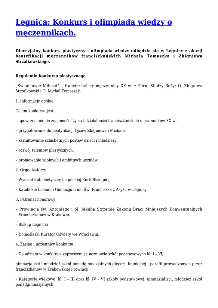 Legnica: Konkurs i olimpiada wiedzy o męczennikach. Diecezjalny konkurs plastyczny i olimpiada wiedzy odbędzie się w Legnicy z okazji beatyfikacji męczenników franciszkańskich Michała Tomaszka i Zbigniewa Strzałkowskiego. Regulamin konkursu plastycznego „Świadkowie Miłości” – franciszkańscy męczennicy XX w. z Peru, Słudzy Boży: O. Zbigniew Strzałkowski i O. Michał Tomaszek. 1. Informacje ogólne Celem konkursu jest: – upowszechnienie znajomości życia i działalności franciszkańskich męczenników XX w. – przygotowanie do beatyfikacji Ojców Zbigniewa i Michała, – kształtowanie szlachetnych postaw dzieci i młodzieży, – rozwój talentów plastycznych, – promowanie zdolnych i ambitnych uczniów. 2. Organizatorzy – Wydział Katechetyczny Legnickiej Kurii Biskupiej, – Katolickie Liceum i Gimnazjum im. Św. Franciszka z Asyżu w Legnicy. 3. Patronat honorowy – Prowincja św. Antoniego i bł. Jakuba Strzemię Zakonu Braci Mniejszych Konwentualnych – Franciszkanów w Krakowie, – Biskup Legnicki – Dolnośląski Kurator Oświaty we Wrocławiu. 4. Zasięg i uczestnicy konkursu – Do udziału w konkursie zaproszeni są uczniowie szkół podstawowych kl. I – VI, gimnazjaliści i młodzież szkół ponadgimnazjalnych diecezji legnickiej i parafii prowadzonych przez franciszkanów w Krakowskiej Prowincji. – Kategorie wiekowe: kl. I – III oraz kl. IV – VI szkoły podstawowej, gimnazjaliści, młodzież szkół ponadgimnazjalnych. 5. Wymagania – uczestnicy wykonują pracę plastyczną, prezentującą heroiczną posługę polskich franciszkanów – męczenników Sług Bożych: Ojców Zbigniewa i Michała, – można wybrać dowolnie jedną postać, np. tylko O. Zbigniewa, obu lub jednego z Ojców, – można przysłać tylko jedną pracę, – do wykonania pracy dozwolone są wszelkie środki artystyczne: farby, kredki, pastele, tusz, węgiel itp., – technika prac dowolna: różnego rodzaju grafiki, rysunek, malarstwo, collage, witraż, wydzieranka i inne, – prace należy wykonać samodzielnie, – format prac plastycznych: A4 lub A3, – prace powinny być bez oprawy w passe-partout, – każda praca na odwrocie powinna mieć przyklejoną kartę zgłoszenia według załączonego wzoru, – prace oceniać będzie Komisja Konkursowa powołana przez organizatorów, – oceniane będzie najbardziej trafne ukazanie chrześcijańskiej miłości i heroizmu Ojców, ukazanie najważniejszych dzieł Ojców, pomysłowość, oryginalność i piękno prac. 6. Etapy konkursu – konkurs jest jednoetapowy, jednak komisja szkolna może wybrać najlepsze prace albo wysłać wszystkie do organizatora: ul. Ojców Zbigniewa i Michała 1, 59-220 Legnica lub do Wydziału Katechetycznego, – prace należy przysłać do 24 listopada 2015 r., – uroczyste wręczenie nagród będzie w uroczystość Niepokalanego Poczęcia Najśw. Maryi Panny po Mszy św. dziękczynnej za beatyfikację, 8 grudnia, wtorek, g. 11.00 w Legnicy, – nagrody funduje Katolickie Liceum Ogólnokształcące prowadzone przez Krakowską Prowincję Franciszkanów, do której należeli Ojcowie Męczennicy, – nagrody i wyróżnienia przyznawane będą dla najlepszych w każdej grupie (kategorii wiekowej). 7. Podajemy literaturę, która może być pomocna w inspiracji plastycznych prac: O. W. Bar, Słudzy Boży Zbigniew Strzałkowski i Michał Tomaszek, Męczennicy z Peru O. Jerzy Domański, Św. Maksymilian Maria Kolbe www.meczennicy.franciszkanie.pl Wskazujemy na św. O. Maksymiliana, również franciszkanina, ponieważ Ojcowie Franciszkanie Męczennicy wpatrzeni byli w ten święty wzór umiłowania Chrystusa Pana i Niepokalanej. Uwaga: Gimnazjaliści mogą brać także udział wraz z licealistami w olimpiadzie wiedzy, która ma osobny regulamin. Regulamin olimpiady wiedzy „Świadkowie Miłości” – franciszkańscy męczennicy XX w. z Peru: Słudzy Boży O. Zbigniew Strzałkowski i O. Michał Tomaszek. 1. Zasady ogólne Celem konkursu jest: – upowszechnienie znajomości życia i działalności franciszkańskich męczenników XX w., – przygotować się do beatyfikacji Męczenników – Ojców Zbigniewa i Michała, – kształtowanie szlachetnych postaw dzieci i młodzieży, – poznanie prawdy o zgubnych ideologiach XX wieku, – pogłębienie umiejętności samodzielnego korzystania z tekstów historycznych i biograficznych. 2. Organizatorzy – Wydział Katechetyczny Legnickiej Kurii Biskupiej, – Katolickie Liceum i Gimnazjum im. Św. Franciszka z Asyżu w Legnicy. 3. Patronat honorowy – Prowincja św. Antoniego i bł. Jakuba Strzemię Zakonu Braci Mniejszych Konwentualnych – Franciszkanów w Krakowie, – Biskup Legnicki, – Dolnośląski Kurator Oświaty we Wrocławiu. 4. Zasięg i uczestnicy konkursu – Do udziału w konkursie zaproszeni są gimnazjaliści oraz uczniowie wszystkich szkół licealnych i technicznych diecezji legnickiej oraz parafii prowadzonych przez franciszkanów w Krakowskiej Prowincji. – Kategorie wiekowe: kl. I – III Gimnazjum oraz kl. I – III szkół ponadgimnazjalnych. 5. Etapy konkursu – Na etapie szkolnym katecheci wybierają po dwie osoby na finał diecezjalny. Dane tych osób (imię, nazwisko uczniów, ich adres i telefon, e-mail) należy przesłać do końca października 2015 r. na adres Katolickiego Liceum Ogólnokształcącego im. św. Franciszka z Asyżu w Legnicy. Takie same dane podają o sobie nauczyciele przygotowujący uczniów do olimpiady. Na tym etapie wiedzę uczniów można zweryfikować i wyłonić kandydatów po przeprowadzeniu katechez o tematyce męczeństwa Ojców www.meczennicy.franciszkanie.pl – Pytania zostaną przesłane do szkół przed 16 października 2015 r. Należy je chronić przed przedwczesnym ujawnieniem. Zestawy pytań wyślemy tylko do tych szkół, które najpóźniej wcześniej zgłoszą gotowość przeprowadzenia eliminacji konkursowych i podadzą adres mailowy. Komisja szkolna może wybrać 