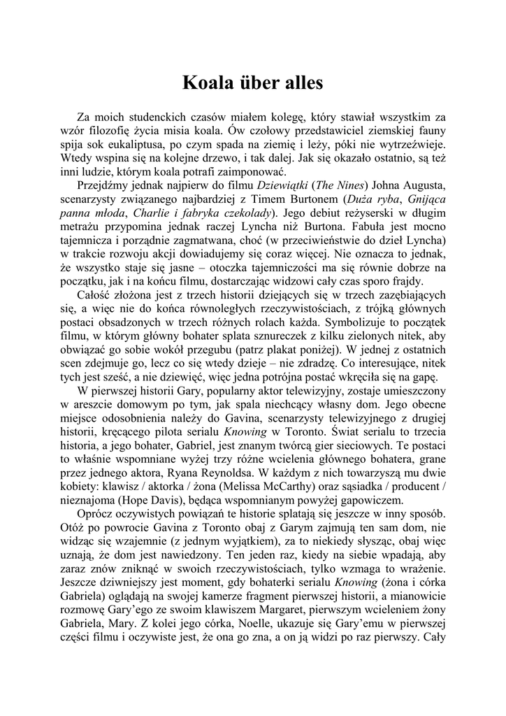 Koala über alles Za moich studenckich czasów miałem kolegę, który stawiał wszystkim za wzór filozofię Ŝycia misia koala. Ów czołowy przedstawiciel ziemskiej fauny spija sok eukaliptusa, po czym spada na ziemię i leŜy, póki nie wytrzeźwieje. Wtedy wspina się na kolejne drzewo, i tak dalej. Jak się okazało ostatnio, są teŜ inni ludzie, którym koala potrafi zaimponować. Przejdźmy jednak najpierw do filmu Dziewiątki (The Nines) Johna Augusta, scenarzysty związanego najbardziej z Timem Burtonem (DuŜa ryba, Gnijąca panna młoda, Charlie i fabryka czekolady). Jego debiut reŜyserski w długim metraŜu przypomina jednak raczej Lyncha niŜ Burtona. Fabuła jest mocno tajemnicza i porządnie zagmatwana, choć (w przeciwieństwie do dzieł Lyncha) w trakcie rozwoju akcji dowiadujemy się coraz więcej. Nie oznacza to jednak, Ŝe wszystko staje się jasne – otoczka tajemniczości ma się równie dobrze na początku, jak i na końcu filmu, dostarczając widzowi cały czas sporo frajdy. Całość złoŜona jest z trzech historii dziejących się w trzech zazębiających się, a więc nie do końca równoległych rzeczywistościach, z trójką głównych postaci obsadzonych w trzech róŜnych rolach kaŜda. Symbolizuje to początek filmu, w którym główny bohater splata sznureczek z kilku zielonych nitek, aby obwiązać go sobie wokół przegubu (patrz plakat poniŜej). W jednej z ostatnich scen zdejmuje go, lecz co się wtedy dzieje – nie zdradzę. Co interesujące, nitek tych jest sześć, a nie dziewięć, więc jedna potrójna postać wkręciła się na gapę. W pierwszej historii Gary, popularny aktor telewizyjny, zostaje umieszczony w areszcie domowym po tym, jak spala niechcący własny dom. Jego obecne miejsce odosobnienia naleŜy do Gavina, scenarzysty telewizyjnego z drugiej historii, kręcącego pilota serialu Knowing w Toronto. Świat serialu to trzecia historia, a jego bohater, Gabriel, jest znanym twórcą gier sieciowych. Te postaci to właśnie wspomniane wyŜej trzy róŜne wcielenia głównego bohatera, grane przez jednego aktora, Ryana Reynoldsa. W kaŜdym z nich towarzyszą mu dwie kobiety: klawisz / aktorka / Ŝona (Melissa McCarthy) oraz sąsiadka / producent / nieznajoma (Hope Davis), będąca wspomnianym powyŜej gapowiczem. Oprócz oczywistych powiązań te historie splatają się jeszcze w inny sposób. OtóŜ po powrocie Gavina z Toronto obaj z Garym zajmują ten sam dom, nie widząc się wzajemnie (z jednym wyjątkiem), za to niekiedy słysząc, obaj więc uznają, Ŝe dom jest nawiedzony. Ten jeden raz, kiedy na siebie wpadają, aby zaraz znów zniknąć w swoich rzeczywistościach, tylko wzmaga to wraŜenie. Jeszcze dziwniejszy jest moment, gdy bohaterki serialu Knowing (Ŝona i córka Gabriela) oglądają na swojej kamerze fragment pierwszej historii, a mianowicie rozmowę Gary’ego ze swoim klawiszem Margaret, pierwszym wcieleniem Ŝony Gabriela, Mary. Z kolei jego córka, Noelle, ukazuje się Gary’emu w pierwszej części filmu i oczywiste jest, Ŝe ona go zna, a on ją widzi po raz pierwszy. Cały czas zresztą zauwaŜamy, Ŝe wiele postaci filmu jest duŜo lepiej zorientowanych w tym, co się dzieje, niŜ jego główny, potrójny bohater. Przejdźmy teraz do tytułowych dziewiątek. Siedzący w areszcie domowym Gary wciąŜ natyka się na tę liczbę – w ogłoszeniach prasowych, rzutach kośćmi, słownych komunikatach. Ma takŜe w mieszkaniu czerwoną karteczkę z napisem Look for the NINES. Margaret twierdzi, Ŝe to podświadomość przypomina mu, kim naprawdę jest – a mianowicie Dziewiątką. Dziewiątką z amnezją, podobnie jak jego pozostałe dwie mutacje. Dalej rozmówczyni wyjawia mu, co następuje: Jesteś wielowymiarowym bytem o niemal nieskończonej mocy. Ciało, w którym przebywasz, to jedno z twoich wcieleń. Twój awatar. (…) Z ciekawości zstąpiłeś na świat, który stworzyłeś. Jedną myślą moŜesz go zniszczyć. UwaŜaj, nie myśl o tym. Masz w ręku wszystkie atuty. Ludzie modlą się do ciebie, Ŝebyś o nich nie zapomniał. I dalej: Wszyscy jesteśmy tam, gdzie powinniśmy być. Poza tobą. Czy więc nasz bohater jest Bogiem? Niezupełnie, bo Bóg jest Dziesiątką, zaś Gary / Gavin / Gabriel jest bogiem przez małe b, czy teŜ moŜe prawie bogiem. Recenzent FilmWeb odebrał to jako przenośnię: aktor stwarza jedną postać, scenarzysta wiele, a twórca gry sieciowej cały wirtualny świat, w którym jest bogiem, bo zna wszystkie kody. Oczywiście, z pewnością tak jest. Patrząc jednak z pozycji sf, moŜna bez trudu potraktować te historie dosłownie. Co więcej, nie jest to przecieŜ nowy pomysł. Czytałem swego czasu opowiadanie, w którym Bóg (Dziesiątka) wcielił się w człowieka i zapomniał, kim jest, ku zgryzocie niebian. Wszyscy pamiętamy teŜ faceta w białym garniturze z trylogii Matrix. W tej więc (najprostszej) interpretacji bohater filmu Dziewiątki byłby graczem z wyŜszego poziomu (co teŜ juŜ było wielokrotnie wałkowane, np. w filmie Trzynaste piętro, 1999). Graczem, którego przyjaciele (teŜ Dziewiątki) chcieliby zabrać ze sobą do domu. W trzeciej części Sierra mówi do niego: Jesteś uzaleŜniony od tej planety i jej mieszkańców. Bez trudu stworzyłeś wszechświat. Najpierw nie zaglądałeś tu często. Zerknąłeś na neandertalczyków, poprzesuwałeś kontynenty. Potem się wciągnąłeś. Zacząłeś tworzyć bohaterów. Niewolników, królów, mesjaszów. Grałeś bez przerwy. (…) Zapomniałeś, kim jesteś. Nic tu nie jest prawdziwe. Nie mogliśmy wyrwać cię siłą. To twój wszechświat i twoje zasady. Dlatego pokazaliśmy ci, jak zły jest ten projekt. Wróćmy jeszcze na zakończenie do Margaret i jej opisu rzeczywistości. Zdradza ona naszemu bohaterowi, Ŝe ludzie to Siódemki, a małpy są Szóstkami. Kim zatem są Ósemki? OtóŜ okazuje się, Ŝe są nimi misie koala, bo mają zdolności telepatyczne i kontrolują pogodę. Jak przełknąć 