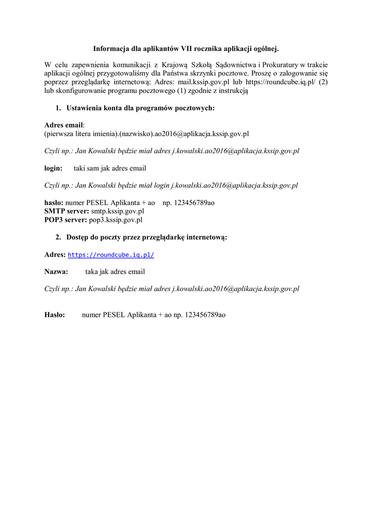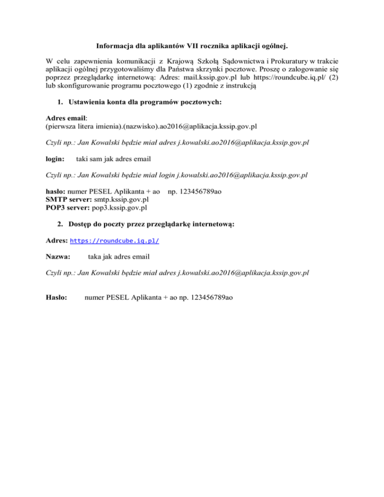 Informacja dla aplikantów VII rocznika aplikacji ogólnej. W celu zapewnienia komunikacji z Krajową Szkołą Sądownictwa i Prokuratury w trakcie aplikacji ogólnej przygotowaliśmy dla Państwa skrzynki pocztowe. Proszę o zalogowanie się poprzez przeglądarkę internetową: Adres: mail.kssip.gov.pl lub https://roundcube.iq.pl/ (2) lub skonfigurowanie programu pocztowego (1) zgodnie z instrukcją 1. Ustawienia konta dla programów pocztowych: Adres email: (pierwsza litera imienia).(nazwisko)[email protected] Czyli np.: Jan Kowalski będzie miał adres [email protected] login: taki sam jak adres email Czyli np.: Jan Kowalski będzie miał login [email protected] hasło: numer PESEL Aplikanta + ao SMTP server: smtp.kssip.gov.pl POP3 server: pop3.kssip.gov.pl np. 123456789ao 2. Dostęp do poczty przez przeglądarkę internetową: Adres: https://roundcube.iq.pl/ Nazwa: taka jak adres email Czyli np.: Jan Kowalski będzie miał adres [email protected] Hasło: numer PESEL Aplikanta + ao np. 123456789ao