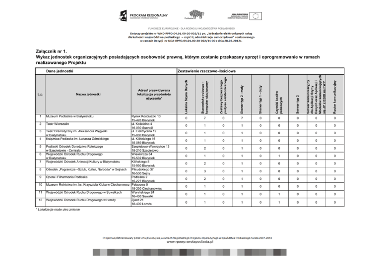 Załącznik nr 1. Wykaz jednostek organizacyjnych posiadających osobowość prawną, którym zostanie przekazany sprzęt i oprogramowanie w ramach realizowanego Projektu 8 9 10 11 12 * Lokalizacja może ulec zmianie Router komunikacyjny 7 Serwer komunikacyjny dla Aplikacji Szyny Danych oraz Aplikacji i Modułów komunikujących się JP z EBOI na PWP 6 Serwer typ 2 5 Czytniki kodów paskowych 4 Skaner typ 1 - duży 3 Rynek Kościuszki 10 15-426 Białystok Teatr Wierszalin ul. Kościelna 4 16-030 Supraśl Teatr Dramatyczny im. Aleksandra Węgierki ul. Elektryczna 12 w Białymstoku 15-080 Białystok Książnica Podlaska im. Łukasza Górnickiego ul. Kilińskiego 16 15-089 Białystok Podlaski Ośrodek Doradztwa Rolniczego Szepietowo-Wawrzyńce 13 w Szepietowie - Centrala 18-210 Szepietowo Wojewódzki Ośrodek Ruchu Drogowego Wiewiórcza 64 w Białymstoku 15-532 Białystok Wojewódzki Ośrodek Animacji Kultury w Białymstoku Kilińskiego 8 15-950 Białystok Ośrodek „Pogranicze –Sztuk, Kultur, Narodów” w Sejnach Piłsudskiego 37 16-500 Sejny Opera i Filharmonia Podlaska Podleśna 2 15-227 Białystok Muzeum Rolnictwa im. ks. Krzysztofa Kluka w Ciechanowcu Pałacowa 5 18-230 Ciechanowiec Wojewódzki Ośrodek Ruchu Drogowego w Suwałkach Waryńskiego 24 16-400 Suwałki Wojewódzki Ośrodek Ruchu Drogowego w Łomży Zjazd 21 18-400 Łomża Skaner typ 2 - mały 2 Muzeum Podlaskie w Białymstoku Adres/ przewidywana lokalizacja przedmiotu użyczenia* Zestawy bezpiecznego podpisu elektronicznego 1 Nazwa jednostki Stanowisko robocze komputer stacjonarny L.p. Zestawienie rzeczowo-ilościowe Lokalna Szyna Danych Dane jednostki 0 7 0 7 0 0 0 0 0 0 1 0 1 0 0 0 0 0 0 1 0 1 0 0 0 0 0 0 1 0 1 0 0 0 0 0 0 2 0 1 0 0 0 0 0 0 1 0 1 0 1 0 0 0 0 2 0 1 0 0 0 0 0 0 3 0 1 0 0 0 0 0 0 2 0 1 0 0 0 0 0 0 1 0 1 0 0 0 0 0 0 1 0 1 0 1 0 0 0 0 1 0 1 0 1 0 0 0