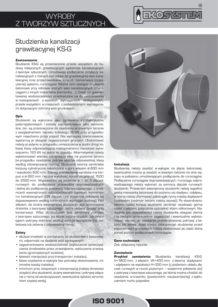 WYROBY Z TWORZYW SZTUCZNYCH Studzienka kanalizacji grawitacyjnej KS-G Zastosowanie Studzienki KS-G są przeznaczone przede wszystkim do budowy klasycznych grawitacyjnych systemów kanalizacyjnych z tworzyw sztucznych. Umożliwiają podłączenie przyłączy kanalizacyjnych z różnych kierunków do grawitacyjnej sieci kanalizacyjnej oraz przeprowadzanie kontroli i konserwacji (czyszczenia) systemu rurociągów. Można nimi zastąpić studzienki betonowe przy odnowie starych sieci kanalizacyjnych z rurociągami z innych materiałów (kamionka, ...). Dzięki ich gwarantowanej wodoszczelności przeznaczone są do zastosowania w rozwiązaniach o wysokich wymaganiach ekologicznych, przede wszystkim w miejscach z podwyższonymi wymaganiami dotyczącymi ochrony wód gruntowych. Opis Studzienki są wykonane jako zgrzewane z półfabrykatów polipropylenowych i zostały zaprojektowane jako samonośne, tzn. są przeznaczone do osadzenia w otwartym terenie z uwzględnieniem nacisku kołowego 30 kN przy przypadkowym najechaniu przez pojazd. Nie wymagają obetonowania, wystarczy je obsypać zagęszczonym gruntem. Obetonować należy je jedynie w przypadku umieszczenia w jezdni drogi kołowej klasy odpowiadającej maksymalnemu naciskowi wynoszącemu 120 kN na jedną oś pojazdu. Alternatywnie należy wybetonować wieniec odciążający właz na poziomie terenu (w przypadku osadzania pokryw włazów odpowiedniej klasy według obowiązującej normy). Studzienki tworzą zamknięte korpusy cylindryczne zakończone u góry włazem ø 600 mm i wysokości 600 mm. Szereg standardowy wyrobów ma korpus o ø 950 mm i łączną wysokość konstrukcyjną od 1500 do 2500 mm. Wyposażone są zmiennie w 1 do 3 złączek rurowych do podłączenia przewodów doprowadzających i jedną do podłączenia przewodu odprowadzającego, o średnicach wewnętrznych odpowiadających typowym wymiarom rur kanalizacyjnych (DN złączek i ich wzajemne położenie są dopasowywane według konkretnych wymagań budowy). Pod włazem, do ściany wewnętrznej studzienki, jest umocowana drabinka z tworzywa sztucznego, która ułatwia dostęp przy konserwacji. Właz do studzienki jest zamknięty pokrywą z tworzywa sztucznego, po której można chodzić, lub innym typem pokrywy dobranej według danego obciążenia (np. żelbetową lub żeliwną z odpowiednią ramą). Zalety • dłuższa trwałość w porównaniu ze studzienkami betonowymi, odporność na działanie wód agresywnych, • zagwarantowana wodoszczelność (wykluczenie zanieczyszczenia środowiska przez przesiąkanie, wykluczenie przesiąkania zgromadzonych ścieków), • łatwość manipulacji przy transporcie i instalacji, • łatwe osadzenie w wykopie bez potrzeby obetonowania, minimalne koszty instalacji, • minimum prac związanych z konserwacją (należy okresowo oczyścić dno studzienki, ściany wewnętrzne i pokrywę włącznie z ramą od zanieczyszczeń, ewentualnie spłukać strumieniem czystej wody). Instalacja Studzienkę należy osadzić w wykopie na płycie betonowej, ewentualnie można ją osadzić w świeżym betonie na dnie wykopu w położeniu umożliwiającym podłączenie do rurociągów. Podłączenie rurociągów doprowadzających i rurociągu odprowadzającego należy wykonać za pomocą złączek rurowych studzienki. Przestrzeń wewnętrzną studzienki należy wypełnić gęstą mieszanką betonową do poziomu osi dopływu i odpływu, w której należy uformować półokrągłe rynny między dopływami i odpływem (nadmiar betonu należy usunąć). Po stwardnieniu betonu należy korpus studzienki zamknąć osadzając górną część z włazem, połączenie uszczelnić kitem silikonowym. Następnie (po uszczelnieniu) należy studzienkę obsypać ziemią i na bieżąco umiarkowanie zagęszczać i ewentualnie wybetonować wieniec do osadzenia prefabrykowanej pokrywy z betonu lub żeliwa. Jeżeli trzeba zabezpieczyć studzienkę przed naporem wód gruntowych, należy obetonować jej część dolną ponad poziom podłączonych rurociągów. Dane techniczne Zob. dołączony rysunek Zamówienie Przykład zamówienia: Studzienka kanalizacji KS-G, V=1800 mm, z włazem VK=450 mm, z dwoma dopływami i odpływem na wysokości H=350 mm (z podaniem układu złączek rurowych w rzucie poziomym – wzajemne położenie osi) z pokrywą z tworzywa sztucznego, po której można chodzić do osadzenia w trawniku (powierzchni nieutwardzonej) z wykluczeniem ruchu pojazdów. ISO 9001 Warunki dotyczące dostawy Studzienki można transportować zwykłymi środkami transportu, należy jednak zabezpieczyć je przed przesuwaniem i uszkodzeniem (pasy mocujące, itp.). Na zamówienie odbiorcy producent zapewni transport do miejsca przeznaczenia. Termin dostawy wynosi 3 tygodnie od otrzymania zamówienia (lub według umowy). Gwarancja i serwis Okres gwarancyjny dla korpusu studzienki z tworzywa sztucznego wynosi 36 miesięcy od odbioru przez zamawiającego. Naprawy wyrobu w okresie gwarancyjnym i pogwarancyjnym zapewnia producent. Udokumentowanie jakości Deklaracja zgodności wydana przez producenta. Siedziba spółki EKOSYSTEM s.r.o., Podkvářská 6, 190 00 Praha 9 tel.: +420 284 818 790 •kom: (+420) 605 296 112 fax: (+420) 266 036 041 e-mail: [email protected] • www.ekosystem.cz sprzedający:
