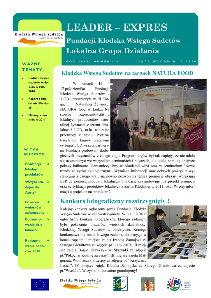 LEADER – EXPRES Fundacji Kłodzka Wstęga Sudetów — Lokalna Grupa Działania R O K WAŻNE TEMATY: 2 0 1 0 , N U M E R I I I D A T A W Y D A N I A 1 2 . 2 0 1 0 Kłodzka Wstęga Sudetów na targach NATURA FOOD Podsumowanie naborów wniosków w roku 2010 Raport z działalności Fundacji Nabory wniosków w 2011 W TYM NUMERZE: Promocja 2 lokalnych produktów Wizyta stu- 3 dyjna do Austrii IV nabór 4 wniosków zakończony Podsumo- 5 wanie działalności Podsumowanie naborów 2010 6 W dniach 15 17 października Fundacja Kłodzka Wstęga Sudetów LGD uczestniczyła w III Targach Naturalnej Żywności NATURA food w Łodzi. Na stoisku zaprezentowaliśmy lokalnych producentów naturalnej żywności z terenu działalności LGD, m.in. naturalne przetwory z aronii. Podczas trzech dni targów pracownicy biura LGD wraz z partnerami Fundacji próbowali ekologicznych przysmaków z całego kraju. Program targów był tak napięty, że nie udało się uczestniczyć we wszystkich seminariach i pokazach, ale udało nam się obejrzeć pokazy kulinarne. Uczestniczyliśmy w Akademii wina oraz w seminarium "Nowe trendy na rynku ekologicznym". Wymiana informacji oraz dobrych praktyk z wystawcami z całego kraju na pewno pozwoli na lepszą promocję obszaru wdrażania LSR za pomocą produktu lokalnego. Fundacja przygotowuje już projekt promocji oraz certyfikacji produktów lokalnych z Ziemi Kłodzkiej w 2011 roku. Więcej informacji o projekcie na stronie nr 2. Konkurs fotograficzny rozstrzygnięty ! Kolejny konkurs ogłoszony przez Fundację Kłodzka Wstęga Sudetów został rozstrzygnięty. W maju 2010 r. ogłosiliśmy konkurs fotograficzny, którego zadaniem było pokazanie obszarów wiejskich działalności Kłodzkiej Wstęgi Sudetów w obiektywie. Komisja konkursowa nie miała łatwego zadania, ale decyzja w końcu zapadła. I miejsce zajęła Izabela Zamojska ze Starego Gierałtowa za zdjęcie pt."Lato 2010". II miejsce zajęła Bogna Krawczyk ze Skrzynki za zdjęcie pt."Pokochaj Kotlinę za ciszę". III miejsce zajęła Małgorzata Wolniaczyk z Lesicy za zdjęcie pt." Krzyż nad Lesicą". IV miejsce zajęła Klaudia Zamojska ze Starego Gierałtowa za zdjęcie pt."Wschód". Wszystkim laureatom gratulujemy! STR. 2 Najwyższy czas promować lokalne produkty z Ziemi Kłodzkiej Nalewki z Sołectwa Skrzynka (Gmina Lądek Zdrój) Fundacja od dawna planowała projekt, który zwiększy zai nt er esowani e produktem lokalnym z terenu Lokalnej Grupy Działania. W styczniu Fundacja razem z LGD Qwsi z Powiatu Ząbkowickiego złoży projekt współpracy, dzięki któremu wspólnie będziemy promować produkt lokalny z naszych terenów. W ramach projektu przygotujemy całą strategię promocji produktów lokalnych pod wspólną marką „Made in Sudety”, gdzie wydzielimy Kłodzki Produkt Lokalny i Ząbkowicki Produkt Lokalny. Powstanie baza produktów lokalnych, system certyfikacji, dodatkowo planujemy stworzenie szafy (witryny) wystawienniczej z produktami lokalnymi, które będą stały w agroturystykach i pensjonatach, biorących udział w projekcie. Już znaleźliśmy firmy, które przygotują strategię promocyjną w ramach któ- rej powstanie projekt loga, projekty różnego typu opakowań, tablice informacyjne, prezentacja multimedialna, strona internetowa. Pierwszym etapem naszych działań będzie stworzenie bazy produktów i wytwórców lokalnych oraz ciekawych usług na terenie działania LGD. Będziemy Państwa informować na jakim etapie jest projekt, ale sukces projektu będzie zależał od wzajemnej współpracy z lokalnymi wytwórcami. Kolejne nabory wniosków w 2011 roku. W roku 2010 LGD ogłosiła 4 nabory wniosków na wszystkie działania. Duża część pieniędzy na nabory wniosków została już wykorzystana, ale planujemy jeszcze nabory w roku 2011. Na przełomie marca i kwietnia planujemy ogłosić nabór na Małe projekty i Różnicowanie w kierunku działalności nierolniczej. Natomiast jesienią ostatni już nabór na Małe projekty. Dodatkowo w przyszłych latach będą organizowane nabory wniosków w ramach środków, które nie zostały wykorzystane w wyniku np. oszczędności przetargowych, rezygnacji z realizacji operacji itp... Raport z działalności Fundacji Kłodzka Wstęga Sudetów — LGD Przez rok 2010 LGD intensywnie pracowała, ogłaszała nabory wniosków, udzielała doradztwa w zakresie dotacji unijnych oraz organizowała akcje promocyjne. Dlatego pomyśleliśmy aby zebrać te wszystkie informacje w jedno opracowanie. W pierwszym kwartale 2011 roku pojawi się „Raport z działalności Fundacji”, który będzie dostępny w biurze Fundacji, ale również będzie rozdawany na Posiedzeniu Zgromadzenia Partnerów. Zapraszamy wszystkich zainteresowanych do zapoznania się z treścią raportu, który będzie również umieszczony na naszej stronie www. ROK 2010, NUMER III STR. Wyjazd studyjny do Austrii W dniach 22-28.11.2010 r. pracownicy naszego LGD uczestniczyli w wyjeździe studyjnym do Styrii – kraju związkowego Austrii. Na terenie Styrii jest 21 LGD. Odwiedziliśmy kilka z nich. Pierwszy dzień wycieczki spędziliśmy w autobusie, natomiast już drugiego dnia zaczęły się atrakcje. Pierwszym punktem, który zwiedziliśmy było miasto Voitsberg w krainie Lipicjanów. W miasteczku zaproszono nas do LGD, gdzie przedstawiono nam prezentację o projektach, na które pozyskano dofinansowanie z UE. Obecnie bardzo intensywnie prowadzone tam są działania w kierunku odnawialnych źródeł energii. W tym kierunku składanych jest wiele projektów dot. zakładania małych firm energetycznych. Następnie udaliśmy się do serowarni, widzieliśmy cały proces produkcyjny, mieliśmy możliwość degustacji serów jak również zrobiliśmy małe zakupy w tym gospodarstwie. Tego dnia czekała nas jeszcze jedna atrakcja a mianowicie wizyta w Hiszpańskiej Szkole Jazdy, gdzie znajduje się stadnina lipicjanów (rasa koni, które rodzą się czarne, a z wiekiem ich maść zmienia 