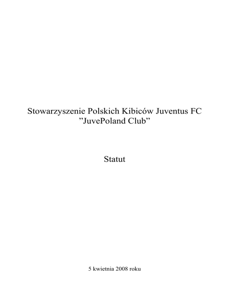 Stowarzyszenie Polskich Kibiców Juventus FC ”JuvePoland Club” Statut 5 kwietnia 2008 roku Spis treści 1. Postanowienia ogólne...........................................................................................3 2. Cele i środki działania..........................................................................................4 3. Członkowie - prawa i obowiązki..........................................................................5 4. Władze JuvePoland Club......................................................................................8 5. Majątek i fundusze.............................................................................................12 6. Postanowienia końcowe.....................................................................................13 2 1. Postanowienia ogólne 1. Stowarzyszenie nosi nazwę: Stowarzyszenie Polskich Kibiców Juventus FC „JuvePoland Club”, w dalszych postanowieniach statutu zwane JuvePoland Club. 2. JuvePoland Club jest zrzeszeniem osób fizycznych, zawiązanym dla jednoczenia polskich kibiców klubu piłkarskiego Juventus FC. 3. Siedzibą JuvePoland Club jest Poznań. 4. Nazwa i symbole JuvePoland Club, zawarte w załączniku nr 1, korzystają z ochrony prawnej. 5. Terenem działania jest Rzeczpospolita Polska. Dla właściwych realizacji swoich celów JuvePoland Club może prowadzić działalność także poza granicami Rzeczpospolitej Polskiej. 6. JuvePoland Club jest zawiązane na czas nieograniczony. 7. JuvePoland Club posiada osobowość prawną. Działa na podstawie przepisów ustawy Prawo o stowarzyszeniach (Dz. U. z 1989 r. nr 20, poz. 104 z późniejszymi zmianami) oraz niniejszego statutu. 8. JuvePoland Club może należeć do innych krajowych i międzynarodowych organizacji o podobnych celach. 9. Działalność JuvePoland Club oparta jest przede wszystkim na pracy społecznej członków. Do prowadzenia swych spraw JuvePoland Club może zatrudniać pracowników. 10. Oficjalna strona internetowa JuvePoland Club znajduje się pod adresem club.juvepoland.com. 3 2. Cele i środki działania 1. Cele JuvePoland Club to: (a) zrzeszanie polskich kibiców klubu Juventus FC, (b) propagowanie dobrego imienia oraz popularyzowanie tradycji i osiągnięć klubu Juventus FC na terenie Rzeczpospolitej Polskiej, (c) umożliwienie kontaktów między polskimi kibicami klubu Juventus FC, (d) nawiązywanie kontaktów z kibicami klubu Juventus FC z innych krajów, (e) umożliwianie wyjazdów na mecze klubu Juventus FC oraz spotkań z jego przedstawicielami. 2. JuvePoland Club realizuje swoje cele poprzez: (a) dialog ze społecznością polskiego Internetu, (b) współpracę z mediami, (c) prowadzenie strony internetowej, będącej głównym środkiem komunikacji członków JuvePoland Club, (d) organizację wyjazdów i spotkań polskich kibiców klubu Juventus FC. 3. JuvePoland Club nie prowadzi działalności gospodarczej. 4 3. Członkowie - prawa i obowiązki 1. Członkami JuvePoland Club mogą być osoby fizyczne i prawne. Osoba prawna może być jedynie członkiem wspierającym JuvePoland Club. 2. JuvePoland Club posiada członków: (a) zwyczajnych, (b) wspierających, (c) honorowych. 3. Członkiem zwyczajnym JuvePoland Club może być każda osoba fizyczna, która: (a) jest obywatelem Rzeczpospolitej Polskiej, (b) jest kibicem klubu Juventus FC, (c) nie jest członkiem żadnego stowarzyszenia zrzeszającego kibiców innej włoskiej drużyny, (d) złoży wypełniony formularz zgłoszeniowy, (e) w dniu składania deklaracji ma ukończone 16 lat. 4. Członek zwyczajny jest przyjmowany uchwałą Zarządu po złożeniu pisemnej deklaracji, której wzór jest zawarty w załączniku nr 2, oraz wpłaceniu pierwszej składki. 5. Przyjmowanie członków zwyczajnych rozpoczyna się wraz z podaniem terminu przyjmowania fanklubów przez Centro Coordinamento Juventus Club DOC i kończy się na dwa tygodnie przed zakończeniem zapisów do Centro Coordinamento Juventus Club DOC. 6. Członkiem wspierającym JuvePoland Club może zostać osoba fizyczna i prawna deklarująca pomoc finansową, rzeczową lub merytoryczną w realizacji celów JuvePoland Club. 7. Członkiem wspierającym staje się po złożeniu pisemnej deklaracji na podstawie uchwały Zarządu. 5 8. Członkowie honorowi są przyjmowani przez Walne Zgromadzenie Członków na wniosek co najmniej 15 członków JuvePoland Club. 9. Członkowie zwyczajni mają prawo: (a) biernego i czynnego uczestniczenia w wyborach do władz JuvePoland Club, (b) korzystania z dorobku, majątku i wszelkich form działalności JuvePoland Club, (c) udziału w zebraniach, spotkaniach, wyjazdach oraz imprezach organizowanych przez JuvePoland Club, (d) posiadania legitymacji JuvePoland Club i noszenia odznaki JuvePoland Club, (e) zgłaszania wniosków co do działalności JuvePoland Club, (f) współtworzenia strony internetowej JuvePoland Club. 10. Członkowie zwyczajni mają obowiązek: (a) brania udziału w działalności JuvePoland Club i realizacji jego celów, (b) przestrzegania statutu i uchwał władz JuvePoland Club, (c) regularnego opłacania składek, (d) dbania o dobre imię JuvePoland Club, przyczyniania się do wzrostu jego znaczenia. 11. Składki należy opłacać raz do roku, w nieprzekraczalnym terminie od pierwszego do ostatniego dnia miesiąca, w którym uzyskało się członkostwo. Wysokość składek jest ustalana uchwałą Walnego Zgromadzenia. 12. Członkowie wspierający i honorowi nie posiadają biernego oraz czynnego prawa wyborczego, mogą jednak brać udział z głosem doradczym w statutowych władzach JuvePoland Club, poza tym posiadają takie prawa jak członkowie zwyczajni. 13. Członek wspierający ma obowiązek wywiązywania się z zadeklarowanych świadczeń, przestrzegania statutu oraz uchwał władz JuvePoland Club. 14. Członkowie honorowi są zwolnieni ze składek członkowskich. 6 15. Utrata członkostwa następuje na skutek: (a) pisemnej rezygnacji złożonej na 