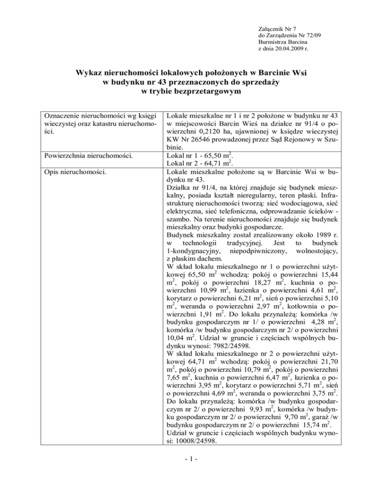 Załącznik Nr 7 do Zarządzenia Nr 72/09 Burmistrza Barcina z dnia 20.04.2009 r. Wykaz nieruchomości lokalowych położonych w Barcinie Wsi w budynku nr 43 przeznaczonych do sprzedaży w trybie bezprzetargowym Oznaczenie nieruchomości wg księgi wieczystej oraz katastru nieruchomości. Powierzchnia nieruchomości. Opis nieruchomości. Lokale mieszkalne nr 1 i nr 2 położone w budynku nr 43 w miejscowości Barcin Wieś na działce nr 91/4 o powierzchni 0,2120 ha, ujawnionej w księdze wieczystej KW Nr 26546 prowadzonej przez Sąd Rejonowy w Szubinie. Lokal nr 1 - 65,50 m2. Lokal nr 2 - 64,71 m2. Lokale mieszkalne położone są w Barcinie Wsi w budynku nr 43. Działka nr 91/4, na której znajduje się budynek mieszkalny, posiada kształt nieregularny, teren płaski. Infrastrukturę nieruchomości tworzą: sieć wodociągowa, sieć elektryczna, sieć telefoniczna, odprowadzanie ścieków szambo. Na terenie nieruchomości znajduje się budynek mieszkalny oraz budynki gospodarcze. Budynek mieszkalny został zrealizowany około 1989 r. w technologii tradycyjnej. Jest to budynek 1-kondygnacyjny, niepodpiwniczony, wolnostojący, z płaskim dachem. W skład lokalu mieszkalnego nr 1 o powierzchni użytkowej 65,50 m2 wchodzą: pokój o powierzchni 15,44 m2, pokój o powierzchni 18,27 m2, kuchnia o powierzchni 10,99 m2, łazienka o powierzchni 4,61 m2, korytarz o powierzchni 6,21 m2, sień o powierzchni 5,10 m2, weranda o powierzchni 2,97 m2, kotłownia o powierzchni 1,91 m2. Do lokalu przynależą: komórka /w budynku gospodarczym nr 1/ o powierzchni 4,28 m2, komórka /w budynku gospodarczym nr 2/ o powierzchni 10,04 m2. Udział w gruncie i częściach wspólnych budynku wynosi: 7982/24598. W skład lokalu mieszkalnego nr 2 o powierzchni użytkowej 64,71 m2 wchodzą: pokój o powierzchni 21,70 m2, pokój o powierzchni 10,79 m2, pokój o powierzchni 7,65 m2, kuchnia o powierzchni 6,47 m2, łazienka o powierzchni 3,95 m2, korytarz o powierzchni 5,71 m2, sień o powierzchni 4,69 m2, weranda o powierzchni 3,75 m2. Do lokalu przynależą: komórka /w budynku gospodarczym nr 2/ o powierzchni 9,93 m2, komórka /w budynku gospodarczym nr 2/ o powierzchni 9,70 m2, garaż /w budynku gospodarczym nr 2/ o powierzchni 15,74 m2. Udział w gruncie i częściach wspólnych budynku wynosi: 10008/24598. -1- Przeznaczenie nieruchomości i sposób jej zagospodarowania. Termin zagospodarowania nieruchomości. Cena nieruchomości. Działka nr 91/4, na której usytuowany jest budynek mieszkalny, oznaczona jest wg ewidencji gruntów symbolem B /tereny mieszkaniowe/. Zgodnie ze studium uwarunkowań i zagospodarowania przestrzennego Gminy Barcin znajduje się w strefie rolniczej przestrzeni produkcyjnej R4 - strefa rolnictwa niskoprodukcyjnego z wielofunkcyjnym rozwojem wsi. W strefie tej występują gleby słabe z niewielkim udziałem gleb dobrych. Duże zagrożenie bezrobociem. W strefie tej zaleca się: - sukcesywną zmianę funkcji typowo rolniczej na wielofunkcyjność wsi polegającej na wprowadzaniu usług, rzemiosła i innych form lokalnej przedsiębiorczości, która stanowić będzie uzupełniające źródło dochodu, - przygotowanie terenów ofertowych pod w/w formy inwestowania. --- Lokal nr 1 - 49.600,00 zł. Lokal nr 2 - 49.100,00 zł. Wysokość stawek procentowych opłat --z tytułu użytkowania wieczystego. Wysokość opłat z tytułu użytkowania --wieczystego, najmu lub dzierżawy. Terminy wnoszenia opłat. --Zasady aktualizacji opłat. --Informacje o przeznaczeniu do sprze- Sprzedaż nieruchomości w trybie bezprzetargowym na daży, do oddania w użytkowanie wie- rzecz najemcy. czyste, użytkowanie, najem lub dzierżawę. 6 tygodni, licząc od dnia wywieszenia wykazu. Termin do złożenia wniosku przez osoby, którym przysługuje pierwszeństwo w nabyciu nieruchomości na podstawie art. 34. ust. 1 pkt 1 i pkt 2 ustawy o gospodarce nieruchomościami. -2-