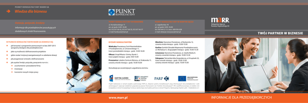 PUNKT KONSULTACYJNY MARR SA Wiedza dla biznesu Punkt Konsultacyjny w Krakowie Punkt Konsultacyjny w Nowym Sączu ul. Kordylewskiego 11 pn–pt godz. 8.00–16.00 tel. 012 617 66 42, 012 617 66 35, 012 617 66 37 e-mail: [email protected] ul. Jagiellońska 18 pn–pt godz. 8.00–16.00 tel. 018 444 21 31, kom. 608 056 628 e-mail: [email protected] W PUNKCIE KONSULTACYJNYM MARR SA DOWIESZ SIĘ: Dyżury Konsultantów jak korzystać z programów pomocowych na lata 2007-2013 (programy dostępne dla przedsiębiorców) Wieliczka: Powiatowy Cech Rzemieślników i Przedsiębiorców, ul. Limanowskiego 11, trzeci poniedziałek miesiąca - godz. 10.00-16.00 Miechów: Starostwo Powiatowe, ul Racławicka 12, czwarta środa miesiąca - godz. 10.00-15.00 Dotacje, pożyczki, kredyty Informacje dla przedsiębiorców poszukujących dodatkowych źródeł finansowania. jakie są możliwości dofinansowania projektów gdzie szukać instytucji zaangażowanych w udzielanie dotacji jak przygotować wniosek o dofinansowanie jak uzyskać kredyt, pożyczkę, poręczenie na m.in.: Olkusz: Urząd Miasta i Gminy, Rynek 1, trzeci piątek miesiąca - godz. 9.00-15.00 Proszowice: Lokalne Centrum Biznesu, ul. Krakowska 11, czwarty wtorek miesiąca - godz. 10.00-16.00 TWÓJ PARTNER W BIZNESIE Gorlice: Gorlicki Ośrodek Wspierania Przedsiębiorczości, ul. Michalusa 4, drugi piątek miesiąca - godz. 10.00-15.30 Limanowa: Starostwo Powiatowe, ul. Józefa Marka 9, czwarty czwartek miesiąca - godz. 10.00-15.30 Zakopane: Tatrzańska Izba Gospodarcza, ul. Krupówki 22, trzeci wtorek miesiąca - godz. 10.00-15.00 czwarty wtorek miesiąca - godz. 10.00-15.00 uruchomienie i prowadzenie firmy inwestycje Konsultacje po wcześniejszym uzgodnieniu terminu tworzenie nowych miejsc pracy Projekt realizowany w ramach projektu systemowego PARP pt. „Wsparcie systemu kompleksowych usług informacyjnych dla przedsiębiorców i osób zamierzających rozpocząć działalność gospodarczą poprzez finansowanie sieci Punktów Konsultacyjnych” (PK) współfinansowanego ze środków Unii Europejskiej w ramach Europejskiego Funduszu Społecznego oraz budżetu państwa w ramach Programu Operacyjnego Kapitał Ludzki – Poddziałanie 2.2.1. www.marr.pl Informacje dla przedsiębiorczych PUNKT KONSULTACYJNY MARR SA Wiedza dla biznesu PUNKT KONSULTACYJNY MARR SA Wiedza dla biznesu PUNKT KONSULTACYJNY MARR SA Wiedza dla biznesu Zakładasz własną firmę? Chcesz zdobyć mocną pozycję na rynku? Program Operacyjny Innowacyjna Gospodarka na lata 2007-2013 Nowoczesne rozwiązania dla Twojej firmy Konsultanci Małopolskiej Agencji Rozwoju Regionalnego SA pomogą znaleźć Sprawdź możliwości dofinansowania innowacyjnych projektów. Informacje dla przedsiębiorców promujących eksport i wdrażających nowe technologie. najlepsze rozwiązania dla Twojego biznesu. BEZPŁATNE INFORMACJE: Działanie 1.4 - 4.1 Działanie 6.1 DLA ZAKŁADAJĄCYCH FIRMĘ projekty badawczo-rozwojowe (B+R) prowadzone przez przedsiębiorców oraz inwestycje niezbędne do wdrożenia ich wyników wprowadzenie rodzimej firmy na rynki zagraniczne zwiększenie udziału eksportu w ogólnej sprzedaży przedsiębiorstwa promocja polskiej marki na arenie międzynarodowej rejestracja działalności gospodarczej formy prawne przedsiębiorstw sposoby opodatkowania zewnętrzne źródła finansowania DLA PRZEDSIĘBIORCÓW informacje związane z działalnością o charakterze proeksportowym lub proinnowacyjnym możliwości dofinansowywania szkoleń (baza danych, warunki uczestnictwa) baza instytucji wspierających przedsiębiorczość Działanie 4.2 inwestycje umożliwiające rozwój działalności badawczo rozwojowej prowadzonej przez przedsiębiorców projekty w zakresie wzornictwa przemysłowego i użytkowego, zakończone wdrożeniem wzoru do produkcji Działanie 4.4 zakup lub wdrożenie nowych rozwiązań technologicznych, w efekcie których wprowadzony zostanie na rynek nowy lub znacząco ulepszony produkt Działanie 8.1 świadczenie usług drogą elektroniczną (usługi cyfrowe) wraz z wytworzeniem niezbędnych produktów cyfrowych Działanie 8.2 przedsięwzięcia o charakterze informatycznym i organizacyjnym prowadzące do realizacji procesów biznesowych (B2B) w formie elektronicznej Projekt współfinansowany ze środków Europejskiego Funduszu Rozwoju Regionalnego w ramach Programu Operacyjnego Innowacyjna Gospodarka