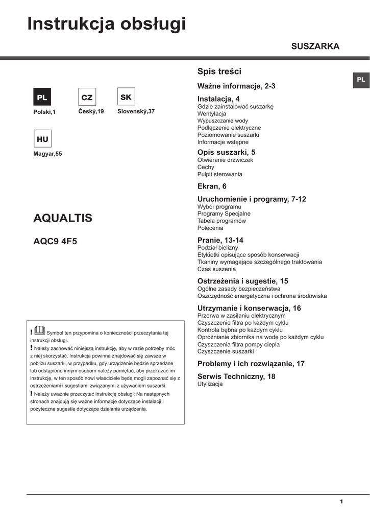 Instrukcja obsługi SUSZARKA Spis treści PL Ważne informacje, 2-3 PL Polski,1 CZ Český,19 SK Slovenský,37 Instalacja, 4 Gdzie zainstalować suszarkę Wentylacja Wypuszczanie wody HU Magyar,55 Podłączenie elektryczne Poziomowanie suszarki Informacje wstępne Opis suszarki, 5 Otwieranie drzwiczek Cechy Pulpit sterowania Ekran, 6 Uruchomienie i programy, 7-12 AQUALTIS Wybór programu Programy Specjalne Tabela programów Polecenia AQC9 4F5 Pranie, 13-14 Podział bielizny Etykietki opisujące sposób konserwacji Tkaniny wymagające szczególnego traktowania Czas suszenia Ostrzeżenia i sugestie, 15 Ogólne zasady bezpieczeństwa Oszczędność energetyczna i ochrona środowiska Utrzymanie i konserwacja, 16 ! Symbol ten przypomina o konieczności przeczytania tej instrukcji obslugi. ! Należy zachować niniejszą instrukcję, aby w razie potrzeby móc z niej skorzystać. Instrukcja powinna znajdować się zawsze w pobliżu suszarki, w przypadku, gdy urządzenie będzie sprzedane lub odstąpione innym osobom należy pamiętać, aby przekazać im instrukcję, w ten sposób nowi właściciele będą mogli zapoznać się z ostrzeżeniami i sugestiami związanymi z używaniem suszarki. Przerwa w zasilaniu elektrycznym Czyszczenie filtra po każdym cyklu Kontrola bębna po każdym cyklu Opróżnianie zbiornika na wodę po każdym cyklu Czyszczenia filtra pompy ciepła Czyszczenie suszarki Problemy i ich rozwiązanie, 17 Serwis Techniczny, 18 Utylizacja ! Należy uważnie przeczytać instrukcję obsługi: Na następnych stronach znajdują się ważne informacje dotyczące instalacji i pożyteczne sugestie dotyczące działania urządzenia. 1 Ważne informacje PL Aby zapewnić skuteczne działanie suszarki kondensacyjnej, należy przestrzegać podanego poniżej schematu regularnej konserwacji: Filtr na kłaczki kurzu – po każdym cyklu suszenia KONIECZNE JEST usunięcie kłaczków, które pozostają na filtrze. Zaniechanie czyszczenia filtra po każdym cyklu suszenia wpływa na wydajność pracy suszarki, która potrzebuje więcej czasu na suszenie i, w konsekwencji, zużywa więcej energii podczas suszenia. Zbiornik na wodę – Należy opróżniać zbiornik na wodę po każdym cyklu suszenia. Faza 1 Otworzyć drzwiczki suszarki. 2 Faza 2 Wyjąć filtr (używając dwóch palców) Faza 3 Otworzyć filtr odblokowując zacisk. Faza 4 Usunąć ewentualne meszki z wewnętrznej powierzchni siatki filtra. Faza 1 Pociągnąć do siebie zbiornik na wodę i wyciągnąć go całkowicie z suszarki. Faza 2 Wylać wodę ze zbiornika. Faza 3 Zainstalować zbiornik na wodę upewniając się, że został w całości umieszczony w osłonie. Nieopróżnianie zbiornika na wodę może spowodować: - Zatrzymanie ogrzewania maszyny, (wsad może być jeszcze wilgotny pod koniec cyklu suszenia). - mruganie wskaźnika „Wylać wodę”, w celu poinformowania, że zbiornik jest pełny. ! Wskaźnik „Wylać wodę” świeci nadal, aby przypomnieć, że należy opróżnić zbiornik na wodę na początku każdego programu. Faza 5 Zainstalować filtr – nigdy nie uruchamiać suszarki bez filtra w prawidłowej pozycji. Ładowanie systemu zbierania wody Gdy suszarka jest nowa zbiornik na wodę nie przyjmuje wody, dopóki system nie będzie załadowany. Operacja ta może trwać 1 lub 2 cykle suszenia. Gdy system jest załadowany, może zbierać wodę z każdego cyklu. 2 Filtr pompy ciepła - Dla zapewnienia jego prawidłowego działania, należy czyścić filtr co pięć cykli suszenia. PL Faza 1 Otworzyć pokrywę pompy ciepła. - złapać za uchwyt i pociągnąć go do siebie. Faza 2 Wyjąć zespół filtra obracając 4 zatrzaski i ustawiając je w położeniu pionowym, następnie pociągnąć filtr do siebie. (W filtrze może znajdować się woda, jest to normalne zjawisko). Dane produktu Pojemność znamionowa dla tkanin bawełnianych przy "standardowym programie suszenia tkanin bawełnianych" przy pełnym załadowaniu - kg Klasa efektywności energetycznej Faza 3 Rozdzielić dwie części filtra, usunąć osady włókien znajdujące się na wewnętrznej stronie siateczki filtra. Wyczyścić uszczelkę filtra. Ponownie złożyć obie części. Ważone roczne zużycie energii (AEc)* kWh 9.0 A+ 337.4 Niniejsza suszarka jest Automatyczna Niniejsza suszarka jest Kondensacyjna Zużycie energii przy pełnym załadowaniu; Edry - kWh 2.91 Zużycie energii przy częściowym załadowaniu; Edry½ - kWh 1.49 Zużycie energii: tryb wyłączenia (Po) - Watts 0.14 Zużycie energii: tryb czuwania (Pl) - Watts 2.68 Czas trwania "trybu czuwania" w systemie zarządzania energią minut 30 Standardowy Program Suszenia Tkanin Bawełnianych** odpowiedni do suszenia tkanin bawełnianych o normalnym poziomie wilgotności, który jest najbardziej oszczędnym programem pod względem zużycia energii w przypadku suszenia tkanin bawełnianych przy pełnym i częściowym załadowaniu; Prog. Średnia ważona w czasie (Tt) pełne & częściowe załadowanie - minut 191 Pełne załadowanie (Tdry) - minut 260 Częściowe załadowanie (Tdry) - minut 139 Klasa wydajności skraplania B Średnia wydajność skraplania - % Faza 4 Włożyć filtr na swoje miejsce - upewnić się, że zespół filtr jest prawidłowo wsunięty, obrócić 4 zatrzaski ustawiając je w położeniu poziomym. Nieprzeprowadzanie czyszczenia filtra pompy ciepła zmniejsza wydajność suszenia i może uszkodzić suszarkę. W celu oprawienia wydajności suszenia zaleca się czyszczenie filtra pompy ciepła po każdym cyklu suszenia. pełne zładowanie (Cdry) 78 częściowe załadowanie (Cdry½) 77 ważona (Ct) całkowite & częściowe załadowanie 77 Poziom emitowanego hałasu - dB(A) re 1 pW 70 Rozporz�dzenie delegowane Komisji (UE) nr 392/2012. http://www.hotpoint.eu/hotpoint/. *Zu�ycie roczne obliczone jest w oparciu o 160 cykli standardowego programu suszenia tkanin bawełnianych przy całkowitym i cz��ciowym załadowaniu i zu�yciu w trybach niskiego zu�ycia energii. Rz