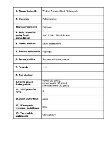 1. Nazwa jednostki Wydział Zdrowia i Nauk Medycznych 2. Kierunek Pielęgniarstwo Nazwa przedmiotu Fizjologia 3. Imię i nazwisko osoby /osób prowadzącej Prof. dr hab. Filip Gołkowski 4. Nazwa modułu: Nauki podstawowe 5. Poziom kształcenia Fizjologia 6. Forma studiów Stacjonarna/niestacjonarna 7. Semestr 1i2 8. Rok studiów 1 9. Forma zajęć i liczba godzin: wykład (30 godz.), konwersatoria (30 godz.), samokształcenie (30 godz.) 10. Ilość punktów ECTS 3 11.Język wykładowy polski 12. Wymagania wstępne i dodatkowe brak 13. Typ modułu kształcenia Obowiązkowy 14.Efekty kształcenia dla modułu: Szczegółowe efekty kształcenia EM1 EM2 Symbol Efektu kształcenia Stopień realizacji efektu w module/ Posługuje się mianownictwem anatomicznym AW1 + Omawia budowę ciała ludzkiego w podejściu topograficznym (kończyna górna i dolna, klatka piersiowa, brzuch, miednica, grzbiet, szyja, głowa) oraz czynnościowym (układ kostno--stawowy, układ mięśniowy, układ krążenia, układ oddechowy, układ pokarmowy, układ moczowy, układy płciowe, układ nerwowy i narządy zmysłów, powłoka wspólna) Rozumie neurohormonalną regulację procesów fizjologicznych oraz procesów elektrofizjologicznych Charakteryzuje specyfikację i znaczenie gospodarki wodno-elektrolitowej i kwasowo-zasadowej w utrzymaniu homeostazy ustroju Określa podstawowe reakcje związków nieorganicznych i organicznych w roztworach wodnych oraz prawa fizyczne wpływające na przepływ cieczy, a także czynniki oddziałujące na opór naczyniowy przepływu krwi Wyjaśnia podstawy fizykochemiczne działania zmysłów wykorzystujących fizyczne nośniki informacji (fale dźwiękowe i elektromagnetyczne) Różnicuje budowę aminokwasów, nukleozydów, monosacharydów, kwasów karboksylowych i ich pochodnych, wchodzących w skład makrocząsteczek obecnych w komórkach, macierzy zewnątrzkomórkowej i płynach ustrojowych, różnicuje witaminy Omawia funkcje genomu, transkyptomu i proteomu człowieka oraz podstawowe koncepcje regulacji ekspresji genów, w tym regulacji epigenetycznej Opisuje budowę chromosomów oraz molekularne podłoże mutagenezy, zna profile metaboliczne podstawowych narządów Wylicza enzymy biorące udział w trawieniu, objaśnia podstawowe defekty enzymów trawiennych oraz określą skutki tych zaburzeń Definiuje podstawowe pojęcia z zakresu patologii ogólnej, w tym zaburzeń w krążeniu, zmian wstecznych, zmian postępowych, zapaleń i nowotworów Omawia wybrane zagadnienia z zakresu patologii narządowej układu krążenia, układu oddechowego, trawiennego, moczowo-płciowego i nerwowego Posługuje się w praktyce mianownictwem anatomicznym oraz wykorzystuje znajomość topografii narządów ciała ludzkiego AW2 + AW3 +++ AW4 +++ AW5 + AW6 ++ AW9 + AW10 ++ AW11 + AW13 +++ AW19 + AW20 + AU1 + EM3 Wykazuje różnice w budowie i charakteryzuje funkcje życiowe człowieka dorosłego i dziecka Wykorzystuje znajomość praw fizyki do opisu zagadnień z zakresu biologii komórek, tkanek oraz procesów fizjologicznych, w szczególności do wyjaśnienia wpływu na organizm ludzki czynników zewnętrznych, takich jak: temperatura, grawitacja, ciśnienie, pole elektromagnetyczne oraz promieniowanie jonizujące Opisuje zmiany w funkcjonowaniu organizmu jako całości w sytuacji zaburzenia jego homeostazy Systematycznie wzbogaca wiedzę zawodową i kształtuje umiejętności, dążąc do profesjonalizmu Przestrzega wartości, powinności i sprawności moralnych w opiece Prezentuje otwartość na rozwój podmiotowości własnej i pacjenta AU2 +++ AU7 + AU11 +++ AK2 +++ AK3 + AK9 + 15. Stosowane Wykład informacyjny, wykład problemowy, dyskusja dydaktyczna, rozwiązywanie metody problemów i kazusów, uczenie innych, referat. dydaktyczne 16. Metody sprawdzania i kryteria oceny efektów kształcenia Efekt modułowy Formy sprawdzenia osiągnięcia efektu EM1 Test jednokrotnego wyboru, zaliczenie konwersatoriów, pozytywna ocena przygotowanego referatu EM2 Test jednokrotnego wyboru, zaliczenie konwersatoriów, pozytywna ocena przygotowanego referatu EM3 Obserwacja przez prowadzącego zajęcia, zaliczenie konwersatoriów 18. Bilans punktów ECTS. Obciążenie pracą studenta Forma aktywności Godziny kontaktowe Wykład Konwersatoria 19. Treści merytoryczne modułu Średnia liczba godzin na zrealizowanie aktywności 30 30 Przygotowanie się do konwersatoriów 30 Sumaryczna liczba punktów ECTS: 3 1. 2. 3. 4. 5. 60 godzin 90 godzin Fizjologia komórki Podstawy funkcjonowania genomu Mechanizm i kontrola syntezy białek Charakterystyka błon komórkowych i ich udziału w procesach fizjologicznych Fizjologia układu nerwowego a. budowa i funkcja neuronu b. zasady przewodzenia bodźców w układzie nerwowym c. podstawowe elementy układu nerwowego d. czynność ośrodkowego i obwodowego układu nerwowego e. charakterystyka funkcji układu somatycznego i autonomicznego f. mechanizm powstawania bólu g. rola fizjologiczna móżdżku h. fizjologia wzgórza oraz podwzgórza i. charakterystyka rytmów dobowych 20. Wykaz literatury obowiązkowej i uzupełniającej j. fizjologia snu k. pamięć i procesy uczenia 6. Rola krwi w fizjologii człowieka a. czynność układu białokrwinkowego b. podstawy fizjologii układu immunologiczneo c. rola erytrocytów d. charakterystyka układu krzepnięcia 7. Fizjologia układu endokrynnego a. znaczenie czynności podwzgórza dla wydzielania hormonów b. nadrzędna rola fizjologiczna przysadki c. czynność tarczycy d. czynność nadnerczy e. czynność gonad f. czynność wewnątrzwydzielnicza trzustki g. regulacja gospodarki wapniowo-fosforanowej 8. Fizjologia układu pokarmowego a. motoryka przewodu pokarmowego b. regulacja wydzielania żołądkowego c. czynność wydzielnicza wątroby i trzustki d. charakterystyka procesów wchłaniania w przewodzie pokarmowym e. regulacja procesu defekacji 9. Fizjologia układu moczowego a. charakterystyka filtracji kłębkowej b. proce