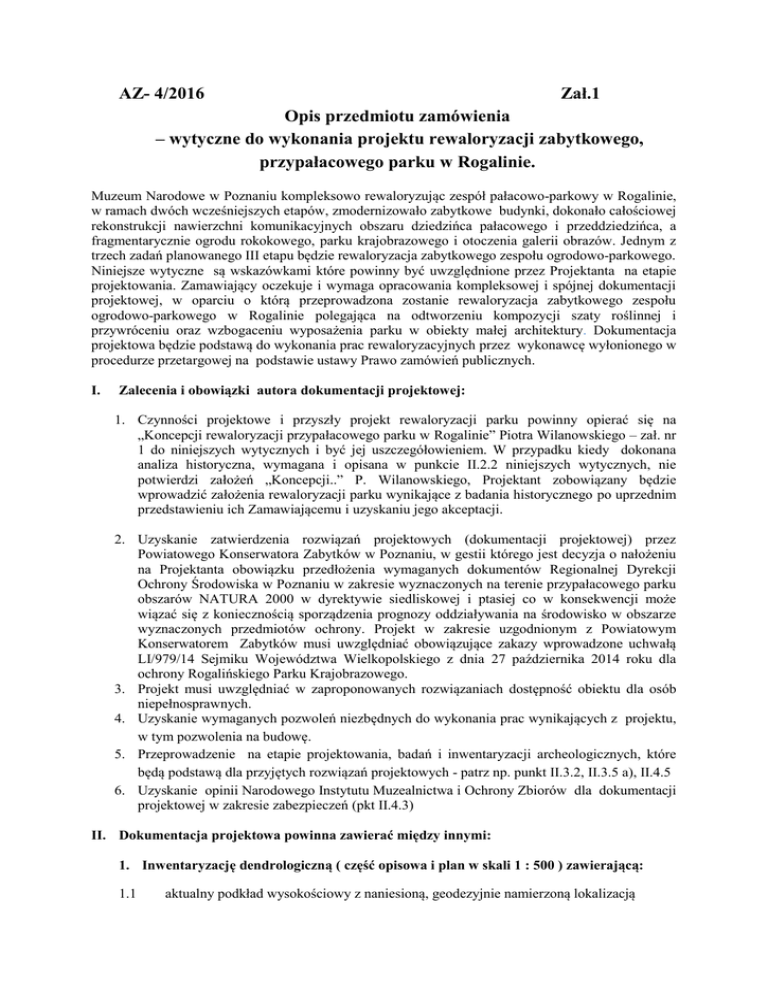 AZ- 4/2016 Zał.1 Opis przedmiotu zamówienia – wytyczne do wykonania projektu rewaloryzacji zabytkowego, przypałacowego parku w Rogalinie. Muzeum Narodowe w Poznaniu kompleksowo rewaloryzując zespół pałacowo-parkowy w Rogalinie, w ramach dwóch wcześniejszych etapów, zmodernizowało zabytkowe budynki, dokonało całościowej rekonstrukcji nawierzchni komunikacyjnych obszaru dziedzińca pałacowego i przeddziedzińca, a fragmentarycznie ogrodu rokokowego, parku krajobrazowego i otoczenia galerii obrazów. Jednym z trzech zadań planowanego III etapu będzie rewaloryzacja zabytkowego zespołu ogrodowo-parkowego. Niniejsze wytyczne są wskazówkami które powinny być uwzględnione przez Projektanta na etapie projektowania. Zamawiający oczekuje i wymaga opracowania kompleksowej i spójnej dokumentacji projektowej, w oparciu o którą przeprowadzona zostanie rewaloryzacja zabytkowego zespołu ogrodowo-parkowego w Rogalinie polegająca na odtworzeniu kompozycji szaty roślinnej i przywróceniu oraz wzbogaceniu wyposażenia parku w obiekty małej architektury. Dokumentacja projektowa będzie podstawą do wykonania prac rewaloryzacyjnych przez wykonawcę wyłonionego w procedurze przetargowej na podstawie ustawy Prawo zamówień publicznych. I. Zalecenia i obowiązki autora dokumentacji projektowej: 1. Czynności projektowe i przyszły projekt rewaloryzacji parku powinny opierać się na „Koncepcji rewaloryzacji przypałacowego parku w Rogalinie” Piotra Wilanowskiego – zał. nr 1 do niniejszych wytycznych i być jej uszczegółowieniem. W przypadku kiedy dokonana analiza historyczna, wymagana i opisana w punkcie II.2.2 niniejszych wytycznych, nie potwierdzi założeń „Koncepcji..” P. Wilanowskiego, Projektant zobowiązany będzie wprowadzić założenia rewaloryzacji parku wynikające z badania historycznego po uprzednim przedstawieniu ich Zamawiającemu i uzyskaniu jego akceptacji. 2. Uzyskanie zatwierdzenia rozwiązań projektowych (dokumentacji projektowej) przez Powiatowego Konserwatora Zabytków w Poznaniu, w gestii którego jest decyzja o nałożeniu na Projektanta obowiązku przedłożenia wymaganych dokumentów Regionalnej Dyrekcji Ochrony Środowiska w Poznaniu w zakresie wyznaczonych na terenie przypałacowego parku obszarów NATURA 2000 w dyrektywie siedliskowej i ptasiej co w konsekwencji może wiązać się z koniecznością sporządzenia prognozy oddziaływania na środowisko w obszarze wyznaczonych przedmiotów ochrony. Projekt w zakresie uzgodnionym z Powiatowym Konserwatorem Zabytków musi uwzględniać obowiązujące zakazy wprowadzone uchwałą LI/979/14 Sejmiku Województwa Wielkopolskiego z dnia 27 października 2014 roku dla ochrony Rogalińskiego Parku Krajobrazowego. 3. Projekt musi uwzględniać w zaproponowanych rozwiązaniach dostępność obiektu dla osób niepełnosprawnych. 4. Uzyskanie wymaganych pozwoleń niezbędnych do wykonania prac wynikających z projektu, w tym pozwolenia na budowę. 5. Przeprowadzenie na etapie projektowania, badań i inwentaryzacji archeologicznych, które będą podstawą dla przyjętych rozwiązań projektowych - patrz np. punkt II.3.2, II.3.5 a), II.4.5 6. Uzyskanie opinii Narodowego Instytutu Muzealnictwa i Ochrony Zbiorów dla dokumentacji projektowej w zakresie zabezpieczeń (pkt II.4.3) II. Dokumentacja projektowa powinna zawierać między innymi: 1. Inwentaryzację dendrologiczną ( część opisowa i plan w skali 1 : 500 ) zawierającą: 1.1 aktualny podkład wysokościowy z naniesioną, geodezyjnie namierzoną lokalizacją 1.2 1.3 1.4 drzew i krzewów w skali 1:500 (wszystkie drzewa od obwodu w pierśnicy co najmniej 20 cm) dane podstawowe (lokalizacja obiektu, dane zleceniodawcy, opis granic i sąsiadów, stan ogrodzeń, opis układu komunikacyjnego, opis historycznego wyposażenia parku, dane wysokościowe, data wykonania prac terenowych). gatunkowe i ilościowe zestawienie drzew i krzewów występujących w parku (egzemplarze namierzone pojedynczo i w grupach). wykaz inwentaryzacyjny zawierający kolejny numer punktu geodezyjnego namierzonego na terenie parku, nazwę polską i nazwę łacińską drzew i krzewów rosnących w danym punkcie, oraz odpowiadający im: obwód pnia (cm) ( mierzony na wysokości tzw. pierśnicy czyli na wysokości 1,3 m), orientacyjną wysokość (m), średnicę korony (m), a także uwagi dotyczące stanu zdrowotnego, które należy wyrazić za pomocą symboli o następującym znaczeniu : asym - drzewo o koronie asymetrycznej, Ch - drzewo obrośnięte chmielem zwyczajnym – Humulus lupulus, cob - ciała obce w tkance pnia i konarów, cw - cięcia gałęzi i konarów wadliwie wykonane – wymagają poprawy, drzp - drzewo pochylone, drzmp - drzewo mocno pochylone, dz(a,b,c) - dziupla (a- wysokość dziupli [cm], b- szerokość dziupli [cm], c- wysokość na drzewie [m]). dze - wiele dziupli, dw - drzewo wsparte na sąsiednim drzewie lub innej podporze, e – egzemplarz, em - egzemplarz martwy, ez - egzemplarz zamierający, fn-p forma wielopniowa, n = 1, 2, 3 … Przy formach o licznych drobnych przewodnikach należy podać obwody najgrubszych. grz - owocniki grzybów, Hh - drzewo porośnięte bluszczem pospolitym - Hedera helix, j - drzewo porażone jemiołą Viscum sp. Krz - drzewo krzywe, lj drzewo porażone jemiołą Viscum sp. w dużym nasileniu, lo - liczne odrosty od pnia lub od korzeni, mp - martwica pnia, mwsp - martwy współprzewodnik, n - narośla na pniu, konarach, ndk - naderwana karpa korzeniowa, n-e - liczba egzemplarzy w grupie, n = 1, 2, 3 … , nżg nieliczne żywe gałęzie, otk - otarcia w koronie (drzewo o drzewo lub konar o konar ), ow - ślady po owadach, otwory wylotowe, p - drzewo przywiązane do podpór, pk - próchnica konarów, pp próchnica pnia, ppp - próchnica podstawy pnia, pn - próchnica nabiegów korzeniowych, prg próchniejąca rana po gałęzi, prk - próchniejąca rana po konarze, prok - próchnica w rozwidleniu konarów, prowsp - próchnica