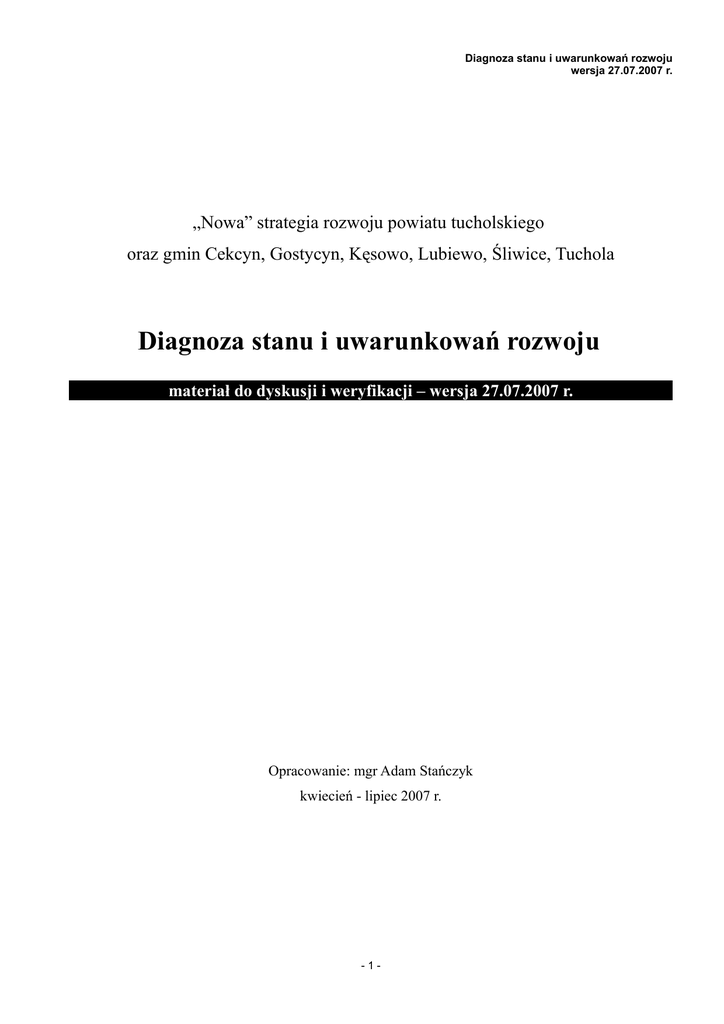 Diagnoza stanu i uwarunkowań rozwoju wersja 27.07.2007 r. „Nowa” strategia rozwoju powiatu tucholskiego oraz gmin Cekcyn, Gostycyn, Kęsowo, Lubiewo, Śliwice, Tuchola Diagnoza stanu i uwarunkowań rozwoju materiał do dyskusji i weryfikacji – wersja 27.07.2007 r. Opracowanie: mgr Adam Stańczyk kwiecień - lipiec 2007 r. -1- Diagnoza stanu i uwarunkowań rozwoju wersja 27.07.2007 r. Spis treści CEL, ZAKRES I METODOLOGIA OPRACOWANIA.....................................................................................3 INFORMACJE OGÓLNE O POWIECIE TUCHOLSKIM................................................................................4 SFERA PRZYRODNICZA...............................................................................................................................5 Środowisko przyrodnicze...........................................................................................................................5 Położenie...............................................................................................................................................5 Użytkowanie gruntów............................................................................................................................5 Rzeźba terenu i budowa geologiczna...................................................................................................6 Gleby...................................................................................................................................................10 Stosunki wodne...................................................................................................................................12 Ochrona przyrody i krajobrazu.................................................................................................................13 Ochrona przyrody na terenie powiatu.................................................................................................13 Podsumowanie. Najważniejsze problemy ekologiczne powiatu. Zasady ekopolityki..........................19 SFERA SPOŁECZNA...................................................................................................................................21 Procesy i struktury demograficzne...........................................................................................................21 Zmiany liczby ludności.........................................................................................................................21 Ruch naturalny....................................................................................................................................22 Ruch migracyjny..................................................................................................................................25 Małżeństwa i rozwody.........................................................................................................................27 Poziom wykształcenia ludności...........................................................................................................28 Prognoza demograficzna.....................................................................................................................31 Podsumowanie - najważniejsze wnioski wynikające z demograficznych uwarunkowań rozwoju gmin powiatu tucholskiego...........................................................................................................................32 Uwarunkowania demograficzne w poszczególnych gminach - synteza.............................................34 Osadnictwo...............................................................................................................................................36 Rozkład wielkościowy i przestrzenny sieci osadniczej........................................................................36 Hierarchia sieci osadniczej..................................................................................................................40 Jakość życia mieszkańców......................................................................................................................43 Obsługa ludności w zakresie usług.....................................................................................................43 Aktywność społeczna, kulturalna i sportowa.......................................................................................62 Bezpieczeństwo publiczne..................................................................................................................75 SFERA GOSPODARCZA.............................................................................................................................85 Przedsiębiorczość....................................................................................................................................85 Rolnictwo..................................................................................................................................................90 Struktura agrarna.................................................................................................................................90 Charakter produkcji rolnej – produkcja roślinna i zwierzęca...............................................................93 Ekonomiczne efekty rolnictwa...........................................................................................................101 Turystyka................................................................................................................................................102 Atrakcyjność turystyczna...................................................................................................................102 Baza noclegowa i jej wykorzystanie..................................................................................................104 Stan bazy turystycznej w gminach powiatu (na podstawie danych Urzędów Gmin)...................