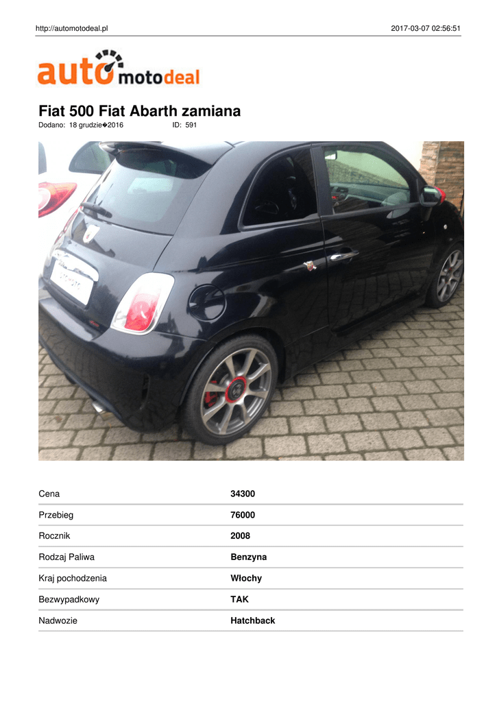 http://automotodeal.pl 2017-03-07 02:56:51 Fiat 500 Fiat Abarth zamiana Dodano: 18 grudzie�2016 ID: 591 Cena 34300 76000 2008 Benzyna Włochy TAK Hatchback Przebieg Rocznik Rodzaj Paliwa Kraj pochodzenia Bezwypadkowy Nadwozie http://automotodeal.pl Moc 2017-03-07 02:56:51 135 Na przednie koła 5 TAK TAK 1400 Czarny TAK TAK TAK TAK TAK TAK TAK TAK TAK TAK TAK TAK TAK TAK TAK TAK TAK TAK TAK TAK TAK Napęd Liczba miejsc Zarejestrowany w polsce Pierwszy właściciel Pojemność Kolor ABS CD Centralny zamek Elektryczne szyby przednie Elektrycznie ustawiane lusterka Immobilizer ASR (kontrola trakcji) Poduszka powietrzna kierowcy Poduszka powietrzna pasażera Radio fabryczne Wspomaganie kierownicy Alarm Alufelgi Bluetooth Czujnik zmierzchu Elektrochromatyczne lusterka boczne Elektrochromatyczne lusterko wsteczne ESP (stabilizacja toru jazdy) Gniazdo AUX Gniazdo SD Gniazdo USB http://automotodeal.pl 2017-03-07 02:56:51 Isofix TAK TAK TAK TAK TAK TAK TAK TAK TAK TAK TAK TAK TAK TAK TAK TAK Wrocław TAK 3 Manualna grudzień 2016 TAK Metalik TAK Klimatyzacja manualna Komputer pokładowy Kurtyny powietrzne MP3 Podgrzewana przednia szyba Podgrzewane lusterka boczne Poduszka powietrzna chroniąca kolana Poduszki boczne przednie Poduszki boczne tylne Przyciemniane szyby Światła do jazdy dziennej Światła LED Światła przeciwmgielne Tapicerka welurowa Wielofunkcyjna kierownica Lokalizacja Serwisowany w ASO Liczba drzwi Skrzynia biegów Pierwsza rejestracja Do negocjacji Opcje koloru Skórzana kierownica SZCZEGOLOWY OPIS Stan bardzo dobry opony zimowe nowy filtr i olej http://automotodeal.pl Dane kontaktowe Telefon: 513077777 Sprzedajacy: Osoba prywatna, Lokalizacja: Wroc�aw 2017-03-07 02:56:51 http://automotodeal.pl 2017-03-07 02:56:51 http://automotodeal.pl 2017-03-07 02:56:51 http://automotodeal.pl 2017-03-07 02:56:51 http://automotodeal.pl 2017-03-07 02:56:51 http://automotodeal.pl 2017-03-07 02:56:51 http://automotodeal.pl 2017-03-07 02:56:51 http://automotodeal.pl 2017-03-07 02:56:51 http://automotodeal.pl 2017-03-07 02:56:51