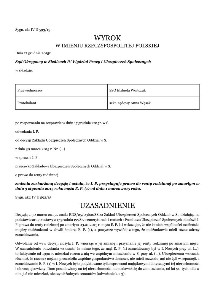 Sygn. akt IV U 593/15 WYROK W IMIENIU RZECZYPOSPOLITEJ POLSKIEJ Dnia 17 grudnia 2015r. Sąd Okręgowy w Siedlcach IV Wydział Pracy i Ubezpieczeń Społecznych w składzie: Przewodniczący SSO Elżbieta Wojtczuk Protokolant sekr. sądowy Anna Wąsak po rozpoznaniu na rozprawie w dniu 17 grudnia 2015r. w S. odwołania I. P. od decyzji Zakładu Ubezpieczeń Społecznych Oddział w S. z dnia 30 marca 2015 r. Nr (...) w sprawie I. P. przeciwko Zakładowi Ubezpieczeń Społecznych Oddział w S. o prawo do renty rodzinnej zmienia zaskarżoną decyzję i ustala, że I. P. przysługuje prawo do renty rodzinnej po zmarłym w dniu 3 stycznia 2015 roku mężu E. P. (1) od dnia 1 marca 2015 roku. Sygn. akt: IV U 593/15 UZASADNIENIE Decyzją z 30 marca 2015r. znak: RNS/25/036008800 Zakład Ubezpieczeń Społecznych Oddział w S., działając na podstawie art.70 ustawy z 17 grudnia 1998r. o emeryturach i rentach z Funduszu Ubezpieczeń Społecznych odmówił I. P. prawa do renty rodzinnej po zmarłym 03.01.2015 r. mężu E. P. (1) wskazując, że nie istniała wspólności małżeńska między małżonkami w chwili śmierci E. P. (1), a powyższe wywiódł z tego, że małżonkowie mieli różne adresy zameldowania. Odwołanie od w/w decyzji złożyła I. P. wnosząc o jej zmianę i przyznanie jej renty rodzinnej po zmarłym mężu. W uzasadnieniu odwołania wskazała, że mimo tego, że mąż E. P. (1) zameldowany był w I. Nowych przy ul. (...), to faktycznie od 1990 r. mieszkał razem z nią we wspólnym mieszkaniu w S. przy ul. (...). Ubezpieczona wskazała również, że razem z mężem prowadziła wspólne gospodarstwo domowe, nie mieli rozwodu, ani nie żyli w separacji, a zameldowanie E. P. (1) w I. Nowych było podyktowane tylko sprawami majątkowymi dotyczącymi tej nieruchomości i obroną ojcowizny. Dom posadowiony na tej nieruchomości nie nadawał się do zamieszkania, od lat 90-tych nikt w nim już nie mieszkał, nie czynił żadnych remontów (odwołanie k.1-3). W odpowiedzi na odwołanie organ rentowy wniósł o jego oddalenie powołując się na przepisy prawa i uzasadnienie zawarte w zaskarżonej decyzji (odpowiedź organu rentowego na odwołanie k.4-5). Sąd ustalił, co następuje: E. P. (1) miał ustalone prawo do emerytury na podstawie decyzji organu rentowego z dnia 03.04.2012 r. od dnia 01 lutego 2012r. (decyzja k. 30 za wnioskiem z dn. 28.02.2012 r. akt emerytalnych E. P.). E. P. (1) zmarł 3 stycznia 2015 r. w S.. Zameldowany był w N. ul. (...) gm. S. (skrócony odpis aktu zgonu k. 49 akt emerytalnych). E. P. (1) pozostawał w związku małżeńskim od 24 czerwca 1972 r. z I. P. z domu Dobosz. Małżonkowie mieli wspólność ustawową małżeńską, nie mieli orzeczonej separacji, nie żyli też przed śmiercią E. P. (1) w separacji faktycznej (zupełny odpis małżeństwa k. 11 akt rentowych). Po zawarciu związku małżeńskiego małżonkowie mieszkali na nieruchomości w I. Nowych przy ul. (...) razem z rodzicami E. P. (1). Była to nieruchomość stanowiąca własność rodziców E. P. (1). W roku 1990 r. E. i I. małż. P. nabyli mieszkanie spółdzielcze w S. przy ul. (...) i w nim wspólnie mieszkali do śmierci E. P. (1). Małżonków łączyła więź emocjonalna, wspólna troska o dzieci, mogli liczyć na siebie i wzajemne wsparcie. Z uzyskiwanych dochodów małżonkowie utrzymali wspólne mieszkanie i rodzinę. Ze względu na konflikt w rodzinie dotyczący podziału majątku po rodzicach E. P. (1) wymieniony przemeldował się z S. ponownie do I. Nowych na nieruchomość rodzinną. Powyższe było uzgodnione z rodzicami E. P. (1). Meldunek w N. przy ul. (...) miał uniemożliwić sprzedaż tej nieruchomości przez siostrę wymienionego, która miała wpływać na rodziców, aby taka transakcja została dokonana. Mimo takiego meldunku E. P. (1) faktycznie przez cały czas od 1990 r. mieszkał w S. na ul. (...). Dom na nieruchomości w N. nie nadawał się do zamieszkania, gdyż był to dom drewniany z okresu międzywojennego i od wielu tak nikt w nim nie mieszka i nie czynione są żadne nakłady na tę nieruchomość (zeznania świadka T. P. k. 9v-10, zeznania ubezpieczonej w charakterze strony k. 10v). Dnia 5 marca 2015 r. I. P. ur. (...) złożyła wniosek do organu rentowego o przyznanie jej prawa do renty rodzinnej po zmarłym mężu (wniosek k. 1-6 a.r.). W chwili śmierci męża I. P. miała skończone 50 lat. Decyzją z 30 marca 2015r. znak: RNS/25/036008800 Zakład Ubezpieczeń Społecznych Oddział w S., działając na podstawie art.70 ustawy z 17 grudnia 1998r. o emeryturach i rentach z Funduszu Ubezpieczeń Społecznych odmówił I. P. prawa do renty rodzinnej po zmarłym 03.01.2015 r. mężu E. P. (1) wskazując, że nie istniała wspólności małżeńska między małżonkami w chwili śmierci E. P. (1), z uwagi na inne adresy zamieszkania małżonków (decyzja k. 12 akt rentowych). Sąd zważył, co następuje: Odwołanie I. P. jest zasadne i zasługuje na uwzględnienie. Zgodnie z art. 70 ust.1 pkt 1 i 2 ustawy z 17 grudnia 1998r. o emeryturach i rentach z Funduszu Ubezpieczeń Społecznych (Dz.U. z 2009r. Nr 153, poz.1227 ze zm.) wdowa ma prawo do renty rodzinnej, jeżeli w chwili śmierci męża albo po śmierci męża nie później jednak niż w ciągu 5 lat od jego śmierci osiągnęła wiek 50 lat lub była niezdolna do pracy i mając na uwadze ust. 3 tego przepisu pozostawała z nim we wspólności małżeńskiej. Zgodnie zaś z art. 70 ust. 3 tej ustawy małżonka rozwiedziona lub wdowa, która do dnia śmierci męża nie pozostawała z nim we wspólności małżeńskiej, ma prawo do renty rodzinnej, jeżeli oprócz spełnienia warunków określonych w ust. 1 lub 2 miała w dniu śmierci męża prawo do alimentów z jego strony ustalone wyrokiem lub ugodą sądową. Zatem brak pozostawania we wspólności małżeńskiej, generalnie wyłącza uprawnienia do renty rodzinnej po zmarłym mężu. Okolicznością sporną w niniejszej sprawie by