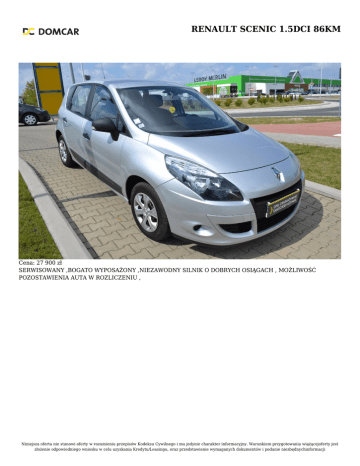RENAULT SCENIC 1.5DCI 86KM Cena: 27 900 zł SERWISOWANY ,BOGATO WYPOSAŻONY ,NIEZAWODNY SILNIK O DOBRYCH OSIĄGACH , MOŻLIWOŚĆ POZOSTAWIENIA AUTA W ROZLICZENIU , Niniejsza oferta nie stanowi oferty w rozumieniu przepisów Kodeksu Cywilnego i ma jedynie charakter informacyjny. Warunkiem przygotowania wiążącejoferty jest złożenie odpowiedniego wniosku w celu uzyskania Kredytu/Leasingu, oraz przedstawienie wymaganych dokumentów i podanie niezbędnychinformacji