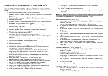SZKOŁA PODSTAWOWA NR 6 IM ZOFII KOSSAK PRZY ZESPOLE SZKÓŁ W PIEŚĆCU WYMAGANIA EDUKACYJNE I KRYTERIA OCENIANIA PRZEDMIOTU MUZYKA W KLASIE 6. Uczeń: ─ stosuje podstawowe zasady poprawnej emisji głosu i dykcji; ─ śpiewa z pamięci wybrane piosenki patriotyczne, turystyczne, młodzieżowe, popularne; ─ stosuje prawidłowe zasady gry na flecie lub dzwonkach chromatycznych; ─ gra proste melodie z nut; ─ wykonuje ćwiczenia rytmiczne z nut; rozpoznaje miarę taktu w zapisie nutowym; ─ wypowiada się na temat wysłuchanych utworów; ─ wyjaśnia znaczenie terminów: zespół wokalny, chór, unisono, wielogłos, a capella, polifonia, homofonia; ─ wymienia rodzaje zespołów wokalnych i instrumentalnych; ─ wymienia przykłady muzyki country oraz etnicznej muzyki afrykańskiej; ─ przedstawia krótko historię powstania jazzu; ─ wyjaśnia znaczenie terminu improwizacja; ─ wypowiada się na temat wysłuchanych nagrań jazzowych; ─ wyjaśnia, czym jest rock and roll, wymienia style muzyczne wywodzące się z rock and rolla; ─ wyjaśnia znaczenie terminów: recital, filharmonia, festiwal muzyczny; ─ określa, gdzie odbywają się koncerty muzyki poważnej; ─ wyjaśnia znaczenie terminów: opera, libretto, operetka, musical, uwertura; ─ opisuje budowę opery; ─ wyjaśnia, czym są muzyka ilustracyjna i muzyka programowa; ─ podaje nazwy instrumentów dętych drewnianych, blaszanych i klawiszowych, rozpoznaje instrumenty dęte po brzmieniu; ─ wymienia rodzaje zespołów kameralnych oraz orkiestr, tłumaczy, czym jest orkiestra symfoniczna, podaje nazwy instrumentów wchodzących w skład wielkiej orkiestry symfonicznej; ─ wyjaśnia znaczenie terminów: budowa okresowa utworu, zdanie muzyczne, poprzednik, następnik; ─ wyjaśnia, czym jest rondo w muzyce, zapisuje schemat ronda; ─ przedstawia różnice między muzyka polifoniczna, a homofoniczną; ─ określa ramy czasowe średniowiecza, tłumaczy, kim byli trubadurzy i truwerzy; ─ określa ramy czasowe epoki renesansu , wyjaśnia, czym jest tabulatura; ─ wymienia nazwiska polskich kompozytorów renesansowych; ─ określa ramy czasowe epoki klasycyzmu, wymienia nazwiska trzech klasyków wiedeńskich oraz ich najważniejsze utwory; ─ wylicza najważniejsze fakty z biografii Ludwiga van Beethovena; ─ ─ ─ określa czas trwania impresjonizmu, wymienia nazwiska przedstawicieli impresjonizmu; podaje nazwiska kompozytorów XX wieku; wylicza najważniejsze fakty z biografii W. Lutosławskiego i tytuły najważniejszych jego dzieł . Na lekcjach muzyki uczeń oceniany jest głównie za wysiłek wkładany w rozwój własnych możliwości oraz zaangażowanie w uzyskanie jak najlepszego wyniku. Ocenę celującą (6) otrzymuje uczeń, który: ─ opanował pełny zakres wiadomości i umiejętności przewidzianych w realizowanym programie nauczania; ─ zdobywa dodatkową wiedzę, korzystając z różnych źródeł informacji; ─ na lekcjach jest bardzo aktywny i zdyscyplinowany, inicjuje różnorodne zadania, projekty; ─ potrafi zagrać melodie przewidziane w podręczniku oraz inne proste melodie na flecie lub dzwonkach; ─ umie zaśpiewać a capella i z akompaniamentem piosenki z podręcznika oraz spoza niego; ─ opanował umiejętność łączenia wiedzy z zakresu muzyki z wiadomościami z innych przedmiotów; ─ potrafi samodzielnie formułować pytania i rozwiązywać problemy muzyczne; ─ zawsze jest przygotowany do lekcji, odrabia zadane prace domowe; ─ bierze czynny udział w przygotowaniu uroczystości szkolnych, konkursach, koncertach. Ocenę bardzo dobrą (5) otrzymuje uczeń, który: ─ opanował pełny zakres wiadomości i umiejętności przewidzianych w realizowanym programie nauczania; ─ korzysta z różnych źródeł informacji; ─ na lekcjach jest bardzo aktywny i zdyscyplinowany; ─ potrafi zagrać większość melodii przewidzianych w programie nauczania na flecie lub dzwonkach; ─ umie zaśpiewać z akompaniamentem większość piosenek przewidzianych w programie nauczania; ─ odrabia prace domowe; ─ bierze czynny udział w przygotowaniu uroczystości szkolnych, koncertach. Ocenę dobrą (4) otrzymuje uczeń, który: ─ opanował większość wiadomości i umiejętności przewidzianych w realizowanym programie nauczania; ─ korzysta z różnych źródeł informacji; ─ potrafi zagrać kilka melodii oraz akompaniamentów do piosenek na flecie lub dzwonkach; ─ umie zaśpiewać z akompaniamentem pieśni jednogłosowe poprawnie pod względem muzycznym; ─ na lekcjach jest aktywny i zdyscyplinowany; ─ odrabia prace domowe; ─ jest uważnym słuchaczem koncertów muzycznych. Ocenę dostateczną (3) otrzymuje uczeń, który: ─ opanował w podstawowym zakresie wiadomości i umiejętności przewidziane w realizowanym programie nauczania; ─ jest w stanie zrozumieć najważniejsze zagadnienia przy pomocy nauczyciela; ─ potrafi zagrać niektóre melodie przewidziane w programie nauczania na f1ecie lub dzwonkach; ─ umie zaśpiewać z akompaniamentem niektóre piosenki przewidziane w programie nauczania; ─ odrabia prace domowe; ─ nie przeszkadza innym słuchaczom podczas akademii, koncertów. Ocenę dopuszczającą (2) otrzymuje uczeń, który: ─ w niewielkim stopniu opanował wiadomości i umiejętności przewidziane w realizowanym programie nauczania; ─ jest w stanie wykonać proste ćwiczenie przy pomocy nauczyciela; ─ potrafi zagrać na instrumencie melodycznym gamę i najprostsze utwory przewidziane w programie nauczania; ─ umie zaśpiewać z akompaniamentem najprostsze piosenki przewidziane w programie nauczania; ─ odrabia proste prace domowe; ─ nie przeszkadza innym słuchaczom podczas akademii, koncertów. Ocenę niedostateczną (1) otrzymuje uczeń, który: ─ nie opanował wiadomości i umiejętności przewidzianych w realizowanym ─ programie nauczania (co uniemożliwia dalsze kształcenie); ─ nie jest w stanie wykonać prostych ćwi