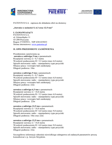 PATENTUS S.A. zaprasza do składania ofert na dostawę: dostaw „Suwnice o nośności 5, 6.3 oraz 12.5 ton” I. ZAMAWIAJĄCY PATENTUS S.A. ul. Górnośląska 11 43-200 Pszczyna Regon 273585931, NIP 6381435033 Strona internetowa: www.patentus.pl II. OPIS PRZEDMIOTU ZAMÓWIENIA Przedmiotem zamówienia są: suwnica o udźwigu 5 ton o parametrach: Rozpiętość suwnicy L= 8,7 metra Wysokość podnoszenia H= 5,5 metra (max 6,0 metra) Sposób sterowania: radio – manipulatory typu przyciski Miejsce pracy: wewnątrz trz hali zamkniętej zamkni Długość podtorza: 10m suwnica o udźwigu 5 ton o parametrach: Rozpiętość suwnicy L= 8,7 metra Wysokość podnoszenia H= 5,5 metra (max 6,0 metra) Sposób sterowania: radio – manipulatory typu przyciski Miejsce pracy: wewnątrz trz hali zamkniętej zamkni Długość podtorza: 22m suwnica o udźwigu 6,3 ton o parametrach: Rozpiętość suwnicy L= 18,8 metra Wysokość podnoszenia H= 5,5 metra (max 6,0 metra) Sposób sterowania: radio – manipulatory typu przyciski Miejsce pracy: wewnątrz trz hali zamkniętej zamkni Długość podtorza: 22m suwnica o udźwigu 12,5 ton o parametrach: Rozpiętość suwnicy L= 18,8 metra Wysokość podnoszenia H= 6,0 metra (max 9,0 metra) Sposób sterowania: radio – manipulatory typu przyciski Długość podtorza: 10m oraz 22m suwnica o udźwigu 12,5 ton o parametrach: Rozpiętość suwnicy L= 18,8 metra Wysokość podnoszenia H= 6,0 metra (max 9,0 metra) Sposób sterowania: radio – manipulatory typu przyciski Długość podtorza: 22m Szczegółowe informacje odnośnie odnoś niewielkiego odstępstwa pstwa od zadanych parametrów proszę prosz konsultować z p. Jerzym Stryjskim. III. SPOSÓB PRZYGOTOWANIA OFERTY 1. Oferta powinna zawierać: - cenę zawierającą koszty dostawy do siedziby zamawiającego, - dane oferenta: nazwa, adres, telefon, faks, - termin waŜności oferty – nie krótszy niŜ do 31 grudnia 2012 - termin dostawy – montaŜ suwnic po ukończeniu budowy hali produkcyjnej, planowany termin zakończenia robót kwiecień/maj 2013, do tego czasu urządzenia składowane u wykonawcy - warunki płatności. 2. Zamawiający dopuszcza składanie ofert w wersji elektronicznej. 3. Zamawiający nie dopuszcza składania ofert częściowych. 4. Oferta powinna obejmować: - projekt mechaniczny oraz elektryczny suwnicy i zasilania - wytworzenie, dostawę oraz kompletny montaŜ suwnicy (wraz z zapewnieniem wszystkich potrzebnych urządzeń do montaŜu) - wytworzenie, dostawę oraz kompletny montaŜ zestawu sterowania radiowego z manipulatorami - wytworzenie, dostawę oraz montaŜ linii zasilających do oferowanych suwnic - dostawę i montaŜ łącznika głównego i kabla zasilającego od łącznika głównego do szynoprzewodu - regulację, uruchomienie oraz wykonanie prób ruchowych i obciąŜeniowych suwnicy - dostawę dokumentacji techniczno-ruchowej suwnicy - wykonanie dokumentacji powykonawczej dla UDT - zgłoszenie suwnicy do odbioru UDT - uczestnictwo w odbiorze suwnicy IV. OPIS WARUNKÓW UDZIAŁU W POSTĘPOWANIU ORAZ OPIS SPOSOBU DOKONYWANIA OCENY SPEŁNIANIA TYCH WARUNKÓW O udzielenie zamówienia mogą się ubiegać oferenci, którzy spełniają warunki: 1) posiadają uprawnienia do występowania w obrocie prawnym, zgodnie z wymaganiami ustawowymi; 2) dysponują niezbędną wiedzą i doświadczeniem, a takŜe potencjałem ekonomicznym i technicznym oraz pracownikami zdolnymi do wykonania danego zamówienia; Z ubiegania się o udzielenie zamówienia wykluczeni zostaną oferenci, którzy: 1. w odniesieniu, do których wszczęto postępowanie upadłościowe, 2. dostawców lub wykonawców będących osobami fizycznymi lub wspólnikami spółek, o których powzięto informację o prawomocnym skazaniu za przestępstwo popełnione w celu osiągnięcia korzyści majątkowej. Jednocześnie Zamawiający zastrzega sobie prawo wykluczenia z postępowania oferentów, którzy w toku postępowania udzielili nieprawdziwych informacji. Wykluczenie oferenta oraz odrzucenie oferty z powodu nie spełnienia określonych wymagań moŜe nastąpić w kaŜdym stadium postępowania o udzielenie zamówienia. Ocena spełnienia warunków wymaganych od wykonawców zostanie dokonana wg formuły „spełnia – nie spełnia” w oparciu o informacje zawarte w dokumentach i oświadczeniach wymaganych niniejszą specyfikacją. V. INFORMACJE O SPOSOBIE POROZUMIEWANIA SIĘ ZAMAWIAJĄCEGO Z WYKONAWCAMI Osobą uprawnioną do kontaktów z Wykonawcami są – Jerzy Stryjski w godz. 8.oo – 16.oo, e.mail [email protected] tel.: 607 670 308 VI. MIEJSCE ORAZ TERMIN SKŁADANIA OFERT 1. Oferty naleŜy składać w siedzibie zamawiającego w sekretariacie lub na adres email: [email protected] w terminie do 9.10.2012 r. do godz. 15.00. VII. TRYB OCENY OFERT Zamawiający udzieli zamówienia Wykonawcy, którego oferta spełnia wszystkie wymagania zawarte w niniejszej Specyfikacji i zostanie oceniona jako najkorzystniejsza w oparciu o podane poniŜej kryterium: Kryterium: Cena – 100% VIII. INFORMACJE O FORMALNOŚCIACH, JAKIE POWINNY ZOSTAĆ DOPEŁNIONE PO WYBORZE OFERTY W CELU ZAWARCIA UMOWY Oferent, który wygrał przetarg, zobowiązany będzie do zawarcia umowy w terminie i miejscu oraz na warunkach określonych przez zamawiającego. IX. ISTOTNE DLA STRON POSTANOWIENIA, KTÓRE ZOSTANĄ WPROWADZONE DO TREŚCI ZAWIERANEJ UMOWY 1. Zamawiający podpisze umowę z Oferentem, który przedłoŜy najkorzystniejszą ofertę. 2. Umowa zostanie zawarta z uwzględnieniem postanowień wynikających z treści niniejszej Specyfikacji. Pszczyna, 02.10.2012 J. Duda Prezes Zarządu PATENTUS S.A.