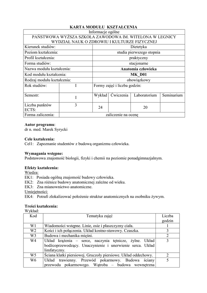 KARTA MODUŁU KSZTAŁCENIA Informacje ogólne PAŃSTWOWA WYŻSZA SZKOŁA ZAWODOWA IM. WITELONA W LEGNICY WYDZIAŁ NAUK O ZDROWIU I KULTURZE FIZYCZNEJ Kierunek studiów: Dietetyka Poziom kształcenia: studia pierwszego stopnia Profil kształcenia: praktyczny Forma studiów: stacjonarne Nazwa modułu kształcenia: Anatomia człowieka Kod modułu kształcenia: MK_D01 Rodzaj modułu kształcenia: obowiązkowy Rok studiów: I Formy zajęć i liczba godzin: Semestr: I Liczba punktów ECTS: Forma zaliczenia: 3 Wykład Ćwiczenia Laboratorium 24 Seminarium 20 zaliczenie na ocenę Autor programu: dr n. med. Marek Syrycki Cele kształcenia: Cel1: Zapoznanie studentów z budową organizmu człowieka. Wymagania wstępne: Podstawowa znajomość biologii, fizyki i chemii na poziomie ponadgimnazjalnym. Efekty kształcenia: Wiedza: EK1: Posiada ogólną znajomość budowy człowieka. EK2: Zna różnice budowy anatomicznej zależne od wieku. EK3: Zna mianownictwo anatomiczne. Umiejętności: EK4: Potrafi zlokalizować położenie struktur anatomicznych na osobniku żywym. Treści kształcenia: Wykład: Kod W1 W2 W3 W4 W5 W6 Tematyka zajęć Wiadomości wstępne. Linie, osie i płaszczyzny ciała. Kości i ich połączenia. Układ kostno-stawowy. Czaszka. Budowa i mechanika mięśni. Układ krążenia – serce, naczynia tętnicze, żylne. Układ bodźcoprzewodzący. Unaczynienie i unerwienie serca. Układ limfatyczny. Ściana klatki piersiowej. Gruczoły piersiowe. Układ oddechowy. Układ trawienny. Przewód pokarmowy. Budowa ściany przewodu pokarmowego. Wątroba – budowa wewnętrzna Liczba godzin 1 3 2 3 2 5 W7 W8 W9 W10 W11 i unaczynienie. Nerki – budowa i unaczynienie. Drogi odprowadzające mocz. Narządy płciowe żeńskie i męskie. Budowa ogólna układu dokrewnego. Układ nerwowy ośrodkowy i obwodowy. Autonomiczny układ nerwowy. Narządy zmysłów. Laboratorium: Kod L1 L2 L3 L4 L5 L6 Tematyka zajęć Budowa kręgosłupa, klatki piersiowej i kończyn. Anatomia topograficzna głowy i szyi. Anatomia topograficzna klatki piersiowej. Anatomia topograficzna jamy brzusznej i miednicy mniejszej. Topografia naczyń krwionośnych. Topografia układu nerwowego. 1 1 2 4 2 Liczba godzin 2 2 4 6 4 2 Metody kształcenia: 1. Wykład informacyjny 2. Pokaz 3. Ćwiczenia przedmiotowe Metody weryfikacji efektów kształcenia: Ocena formująca: 1. Aktywność podczas zajęć 2. Prezentacja ustna 3. Kolokwium Ocena podsumowująca: 1. Średnia ważona ocen formujących. Akceptowalny poziom osiągnięcia efektów kształcenia: EK1: Student uzyskuje 51% maksymalnej liczby punktów z kształcenia 1 kolokwium końcowego EK2: Student uzyskuje 51% maksymalnej liczby punktów z kształcenia 2 kolokwium końcowego EK3: Student uzyskuje 51% maksymalnej liczby punktów z kształcenia 3 kolokwium końcowego EK4: Student zalicza wszystkie ćwiczenia związane z efektem ocenę średnią z przygotowania do ćwiczeń 3.0 części dotyczącej efektu części dotyczącej efektu części dotyczącej efektu kształcenia 4 - otrzymuje Całkowity nakład pracy studenta: Godziny kontaktowe (wykład, ćwiczenia, laboratorium, seminarium, projekt, konsultacje, obecność na egzaminie itd.) Przygotowanie się do zajęć, w tym czytanie wskazanej literatury Przygotowanie się do kolokwium Przygotowanie się do egzaminu Przygotowanie pracy samokształceniowej 45 15 15 0 0 Inne 0 75 3 2 Razem Liczba punktów ECTS dla modułu kształcenia Liczba punktów ECTS, którą student uzyskuje w ramach godzin kontaktowych Liczba punktów ECTS, którą student uzyskuje w ramach zajęć praktycznych, laboratoryjnych, projektowych i praktyk zawodowych Procent programu modułu realizowany w ramach godzin kontaktowych Procent programu modułu realizowany w ramach zajęć praktycznych, laboratoryjnych, projektowych i praktyk zawodowych Tabela odniesień dla modułu kształcenia Efekt Odniesienie Cel kształcenia danego efektu kształcenia do efektów kierunkowych EK1 K_W02 Cel 1 Treści programowe Metody kształcenia W1 – W11 MK1, MK2, MK3 EK2 K_W02 Cel 1 W1 – W11 MK1, MK2, MK3 EK3 K_W02 Cel 1 W1 – W11 MK1, MK2, MK3 EK4 K_U20 Cel 1 L1 – L6 MK4 1 60% 27% Metody weryfikacji efektów kształcenia Prezentacja ustna Kolokwium Średnia ważona ocen formujących Prezentacja ustna Kolokwium Średnia ważona ocen formujących Prezentacja ustna Kolokwium Średnia ważona ocen formujących Aktywność podczas zajęć Kolokwium Średnia ważona ocen formujących. LITERATURA PODSTAWOWA: 1. Woźniak W. (red.): Anatomia człowieka. Urban&Partner, Wrocław 2003. 2. Sokołowska-Pituchowa J. (red.): Anatomia człowieka, PZWL Warszawa 2008. 3. Netter F.H.: Atlas anatomii człowieka. Urban&Partner, Wrocław 2008. LITERATURA UZUPEŁNIAJĄCA: 1. Bochenek A., Reicher M: Anatomia człowieka, t. I – V. PZWL Warszawa 2008. 2. Sobotta J.: Atlas anatomii człowieka, t. I-III. Urban&Partner, Wrocław 2006.