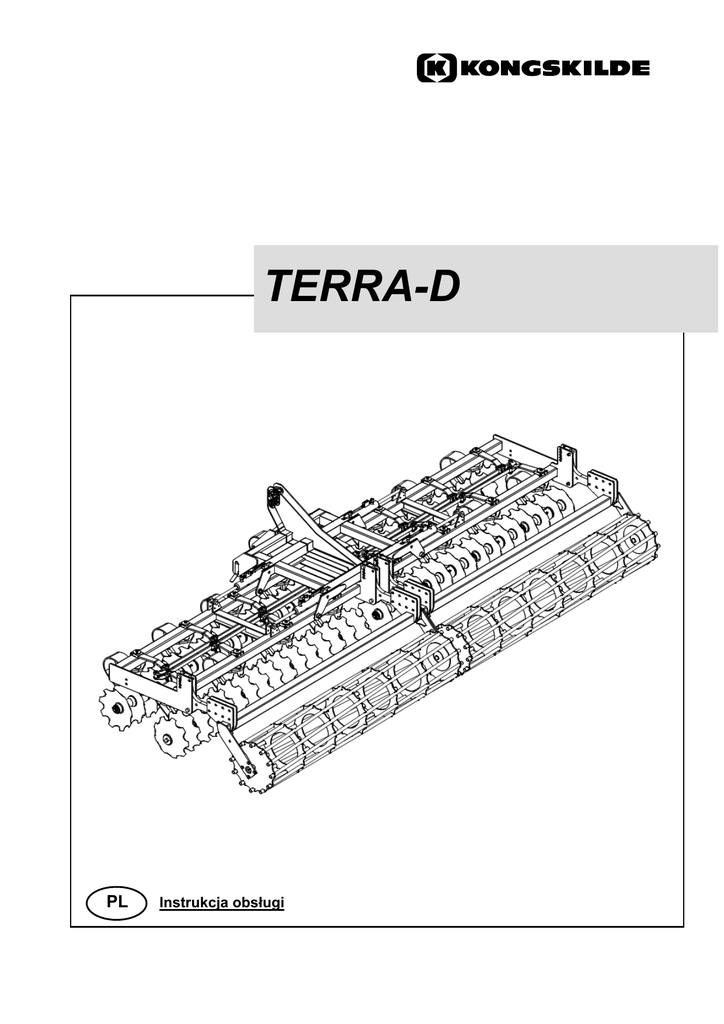 TERRA-D PL Instrukcja obsługi Spis treści Wstęp......................................................................................................................... 3 Dane identyfikacyjne ................................................................................................ 3 Bezpieczeństwo........................................................................................................ 4 Porady w zakresie bezpieczeństwa ................................................................. 4 Przyłączenie i odłączenie maszyny.................................................................. 5 Trzypunktowy układ zawieszenia ..................................................................... 5 Obsługa maszyny............................................................................................. 5 Transport /przejazd maszyny po drogach publicznych..................................... 6 Przed rozpoczęciem jazdy ............................................................................... 6 Podczas transportu .......................................................................................... 6 Po zakończeniu transportu............................................................................... 6 Konserwacja i utrzymanie maszyny ................................................................. 7 Symbole bezpieczeństwa................................................................................. 7 Doczepienie maszyny TERRA-D ..................................................................... 9 Odczepienie maszyny TERRA-D ................................................................... 10 DemontaŜ górnego sprzęgu z maszyny TERRA-D. ....................................... 10 Transport po drogach publicznych ................................................................. 10 Dane techniczne i wymiary .................................................................................... 11 Zaczepy (punkty) do podnoszenia maszyny ........................................................ 12 Obsługa i eksploatacja maszyny........................................................................... 13 Regulacja głębokości roboczej....................................................................... 13 Regulacja kąta roboczego (natarcia) talerzy .................................................. 14 Centralna regulacja kąta wychylenia talerzy .................................................. 15 Względne ustawienie przedniego i tylnego rzędu talerzy............................... 15 Regulacja centralnego zęba maszyny............................................................ 17 Regulacja listwy wyrównawczej (opcja) ......................................................... 18 Transport maszyny po drogach publicznych /bezpieczeństwo ruchu drogowego .............................................................................................................. 19 Bezpieczeństwo ruchu drogowego ................................................................ 19 Masa zestawu ................................................................................................ 19 Przed rozpoczęciem jazdy ............................................................................. 19 Podczas transportu ........................................................................................ 19 Po zakończeniu transportu............................................................................. 19 Szerokość transportowa................................................................................. 20 Bezpieczeństwo podczas transportu.............................................................. 20 Konserwacja i obsługa........................................................................................... 21 Uwagi ogólne ................................................................................................. 21 Smarowanie ................................................................................................... 21 WyposaŜenie dodatkowe (opcje) .......................................................................... 24 System skrobaków......................................................................................... 24 2 Wstęp Gratulujemy nabycia nowej maszyny KONGSKILDE TERRA-D! Maszyna KONGSKILDE TERRA-D jest urządzeniem do kultywacyjnych prac ścierniskowych. W celu uzyskania prawidłowego rozkładu obciąŜeń traktora zalecane jest zastosowanie odpowiedniego balansu z przodu ciągnika. Maszyna TERRA-D moŜe pracować na polach z duŜą ilością resztek pozostałych po wcześniejszych uprawach. Hydrauliczna regulacja kąta roboczego (kąta natarcia) talerzy ułatwia dostosowanie maszyny do rozmaitych rodzajów gleby i prędkości roboczych. Najogólniej, maszyna TERRA-D jest sposobem na obniŜenie kosztów prac polowych poprzez zmniejszenie liczby przejazdów przez pole. Firma Kongskilde Industries A/S jest przekonana, Ŝe osiągną Państwo korzyści dzięki uŜytkowaniu swojej nowej maszyny TERRA-D Dane identyfikacyjne Specyfikacje maszyny TERRA-D są umieszczone na tabliczce znamionowej. Tabliczka znajduje się po wewnętrznej stronie ramy kozła w pobliŜu otworu do mocowania górnego cięgna. TERRA-D 4000H xxx xxx xxxx 23400001 2008 3 Prosimy o przepisanie tutaj danych identyfikacyjnych maszyny z tabliczki znamionowej. Typ: Nr: __________________________________ Nazwa urządzenia. ______________________________ Numer identyfikacyjny EDP Nr seryjny:____________________________ Numer seryjny dla konkretnego urządzenia. W przypadku jakichkolwiek zapytań dotyczących maszyny TERRA-D oraz zamawiania części zamiennych, prosimy o podawanie powyŜszych danych identyfikacyjnych, zarówno numeru identyfikacyjnego, jak i numeru seryjnego. Numery części podane są w katalogu części zamiennych. Bezpieczeństwo Porady w zakresie bezpieczeństwa − Przed rozpoczęciem eksploatacji maszyny TERRA-D naleŜy