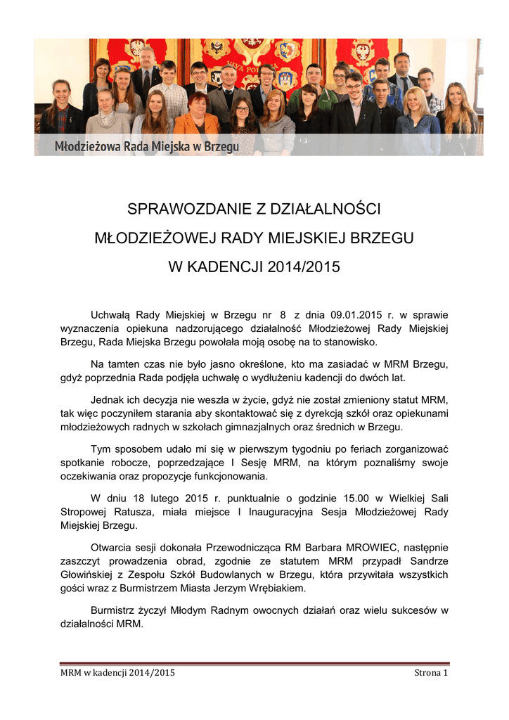 SPRAWOZDANIE Z DZIAŁALNOŚCI MŁODZIEŻOWEJ RADY MIEJSKIEJ BRZEGU W KADENCJI 2014/2015 Uchwałą Rady Miejskiej w Brzegu nr 8 z dnia 09.01.2015 r. w sprawie wyznaczenia opiekuna nadzorującego działalność Młodzieżowej Rady Miejskiej Brzegu, Rada Miejska Brzegu powołała moją osobę na to stanowisko. Na tamten czas nie było jasno określone, kto ma zasiadać w MRM Brzegu, gdyż poprzednia Rada podjęła uchwałę o wydłużeniu kadencji do dwóch lat. Jednak ich decyzja nie weszła w życie, gdyż nie został zmieniony statut MRM, tak więc poczyniłem starania aby skontaktować się z dyrekcją szkół oraz opiekunami młodzieżowych radnych w szkołach gimnazjalnych oraz średnich w Brzegu. Tym sposobem udało mi się w pierwszym tygodniu po feriach zorganizować spotkanie robocze, poprzedzające I Sesję MRM, na którym poznaliśmy swoje oczekiwania oraz propozycje funkcjonowania. W dniu 18 lutego 2015 r. punktualnie o godzinie 15.00 w Wielkiej Sali Stropowej Ratusza, miała miejsce I Inauguracyjna Sesja Młodzieżowej Rady Miejskiej Brzegu. Otwarcia sesji dokonała Przewodnicząca RM Barbara MROWIEC, następnie zaszczyt prowadzenia obrad, zgodnie ze statutem MRM przypadł Sandrze Głowińskiej z Zespołu Szkół Budowlanych w Brzegu, która przywitała wszystkich gości wraz z Burmistrzem Miasta Jerzym Wrębiakiem. Burmistrz życzył Młodym Radnym owocnych działań oraz wielu sukcesów w działalności MRM. MRM w kadencji 2014/2015 Strona 1 Osobiście pokładałem wielkie nadzieje w działalność MRM, ponieważ, jak chyba każdy z nas chciałem poznać problemy naszego miasta, widziane oczami młodzieży brzeskiej, a oni byli ich liderami. Miałem nadzieję też, że być może uda się w tej kadencji stworzyć kilka wniosków i chociaż część z nich wprowadzić do projektu budżetu na rok 2016. Pierwsza część sesji to wręczenie każdemu z młodych radnych listu gratulacyjnego z tytułu zasiadania w MRM z życzeniami sukcesu w pełnieniu tak odpowiedzialnej i zaszczytnej funkcji. Kolejnym etapem obrad było wybranie Przewodniczącego MRM. Wśród trzech zgłoszonych kandydatów, w głosowaniu tajnym, największą bezwzględną ilość głosów otrzymała Sandra GŁOWIŃSKA i to ona została Przewodniczącą MRM w kadencji 2015. Jej zastępcami zostali Bartłomiej MACHAJ oraz Wojciech MEDYK, sekretarzem, do którego należała organizacja pracy MRM, został Michał GWARDYŃSKI. Już podczas pierwszej sesji młodzi radni podjęli kilka istotnych dla funkcjonowania MRM uchwał: 1. zatwierdzenie strony internetowej MRM, dostępna ona jest pod adresem: http://www.mrm.brzeg.pl 2. wybranie osoby odpowiedzialnej za jej funkcjonowanie - wybrany został Adrian CHRUSZCZEWSKI, który już wcześniej wykazał wielką chęć i inicjatywę w utworzeniu i administrowaniu w/w strony. 3. wybranie osoby odpowiedzialnej za funkcjonowanie fanpage na portalu Facebook - została Emilia STANIEK. MRM w kadencji 2014/2015 Strona 2 Podczas obrad I sesji MRM obecni byli: Burmistrz Brzegu - Jerzy Wrębiak, radni RM (Barbara MROWIEC, Renata BISS, Janusz ŻEBROWSKI, Marcin SAMUL, Michał SIEK) oraz lokalna prasa. II sesja Młodzieżowej Rady Miejskiej w Brzegu odbyła się 17.03.2015r. Radni obradowali z udziałem Burmistrza Brzegu Jerzego Wrębiaka, Przewodniczącej Rady Miejskiej Barbary Mrowiec oraz rzecznika prasowego Tomasza Dragana. Młodzi rajcy zajmowali się podjęciem kilku uchwał oraz inicjatyw. Już wówczas wiedzieliśmy że zostanie uruchomiona strona internetowa Młodzieżowej Rady Miejskiej (http://www.mrm.brzeg.pl) dlatego też w pierwszej kolejności, sprawozdanie, w którym zaproponowano wygląd oraz treści zaprezentował Adrian CHRUSZCZEWSKI – wybrany jako osoba odpowiedzialna za funkcjonowanie witryny i współpracująca z opiekunem MRM w tej sprawie. Zaakceptowano wygląd oraz treści strony. Następnie młodzi radni, z inicjatywy m.in. Michała GWARDYŃSKIEGO, zajęli się sprawą petycji ws. powstania miejsca pamięci „Żołnierzy Wyklętych”, popartej podpisami mieszkańców. Autorzy zebrali już ponad 250 podpisów! – Stosowny wniosek został wręczony Burmistrzowi podczas Sesji Rady Miejskiej w maju w punkcie interpelacje i wnioski radnych, w obecności przedstawicieli MRM na sesji. (petycja załączona do niniejszego sprawozdania). Burmistrz Jerzy Wrębiak zapowiedział poparcie tych starań. Przedstawił również procedurę administracyjną, związaną z nadaniem nazwy dla placu, skweru czy ulicy. MRM w kadencji 2014/2015 Strona 3 – Świetny pomysł, gratuluję inicjatywy. Nasze miasto jest szczególnie związane z historią niepodległościową poprzez jego mieszkańców – mówił Burmistrz Brzegu zapowiadając pomoc w procedurze legislacyjnej związanej z realizacją wniosku MRM. Ostatecznie, Burmistrz przychylił się do wniosku, proponując skwer na wschodnim skraju Parku Nadodrzańskiego, na którym obecnie znajduje się postument, upamiętniający harcmistrza Wincentego Muchę. -Zaczął funkcjonować facebook ! Stanowił on jeden ze sposobów komunikacji młodzieży brzeskiej z MRM, wpłynął bowiem szybko wniosek jednego z kolegów poprzez fanpage o pomoc w sprawie uruchomienia skateparku w naszym mieście. Wg Burmistrza - nie jest to teraz rzecz priorytetowa, jednak spróbuje przyjrzeć się bliżej tej sprawie. Podczas obrad II sesji MRM radny Paweł WANTUCH, zgłosił propozycję, aby MRM była inicjatorem programu, zachęcającego naszych mieszkańców do aktywnego uczestniczenia w wyborach prezydenckich. Spot, zachęcający naszych mieszkańców do pójścia do urn został nakręcony kilka dni później i umieszczony na stronie internetowej MRM oraz na fanpage MRM. Młodzi radni, jak widać nie próżnowali, mieli wiele fajnych pomysłów, starali się również wspierać imprezy i inicjatywy realizowane przez nasze miasto. W dniu 01.05.2015 roku, podczas wyboru Księcia Brzeskiego w kadencji 2015-2016, radni Młodzieżowej Rady Miejskiej 