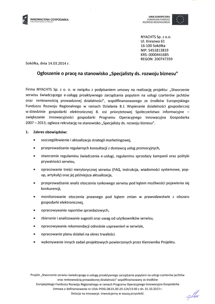 -2013, oglasza rekrutacjq na stanowisko,,Specjalisty ds. rozwoju biznesu".