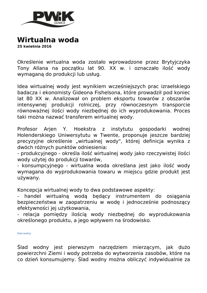 Wirtualna woda 25 kwietnia 2016 Określenie wirtualna woda zostało wprowadzone przez Brytyjczyka Tony Allana na początku lat 90. XX w. i oznaczało ilość wody wymaganą do produkcji lub usług. Idea wirtualnej wody jest wynikiem wcześniejszych prac izraelskiego badacza i ekonomisty Gideona Fishelsona, które prowadził pod koniec lat 80 XX w. Analizował on problem eksportu towarów z obszarów intensywnej produkcji rolniczej, przy równoczesnym transporcie równoważnej ilości wody niezbędnej do ich wyprodukowania. Proces taki można nazwać transferem wirtualnej wody. Profesor Arjen Y. Hoekstra z instytutu gospodarki wodnej Holenderskiego Uniwersytutu w Twente, proponuje jeszcze bardziej precyzyjne określenie „wirtualnej wody", której definicja wynika z dwóch różnych punktów odniesienia: - produkcyjnego - określa ilość wirtualnej wody jako rzeczywistej ilości wody użytej do produkcji towarów, - konsumpcyjnego - wirtualna woda określana jest jako ilość wody wymagana do wyprodukowania towaru w miejscu gdzie produkt jest używany. Koncepcja wirtualnej wody to dwa podstawowe aspekty: - handel wirtualną wodą będący instrumentem do osiągania bezpieczeństwa w zaopatrzeniu w wodę i jednocześnie podnoszący efektywności jej użytkowania, - relacja pomiędzy ilością wody niezbędnej do wyprodukowania określonego produktu, a jego wpływem na środowisko. Ślad wodny Ślad wodny jest pierwszym narzędziem mierzącym, jak dużo powierzchni Ziemi i wody potrzeba do wytworzenia zasobów, które na co dzień konsumujemy. Ślad wodny można obliczyć indywidualnie za pomocą określenia całkowitej ilości wody zużywanej przez daną osobę podczas codziennych czynności. Na definicję składają się dwa rodzaje zużycia wody: bezpośrednie, a więc takie, w którym woda wykorzystywana jest na co dzień: do prania, gotowania czy podlewania ogrodu oraz pośrednie, odnoszące się do zużycia wody potrzebnej do wyprodukowania dóbr konsumenckich jak żywność, ubrania, sprzęt codziennego użytku. Im bardziej skomplikowany proces produkcji, tym większy ślad wodny. Na pełny obraz śladu wodny składa się: woda niebieska – woda pochodząca z rzek, jezior, stawów, zbiorników podziemnych, woda zielona - woda deszczowa, która jest dostępna w warstwie gleby na głębokości do 50 cm, woda szara - do niej zaliczne są zaliczane są ścieki i wody zanieczyszczone. Ślad wodny umożliwia wyliczenie, jaka część udziału należy się każdemu z nas, a z jakiej w rzeczywistości korzystamy. Dzięki temu możliwe jest monitorowanie, czy podział dóbr środowiskowych jest na świecie sprawiedliwy. Na stronie www.waterfootprint.org wyliczono wartości "śladu wodnego" dla wielu produktów codziennego użytku, głównie spożywczych. Można tam sprawdzić, że wyhodowanie jednego niedużego jabłka wymaga w sumie zużycia 125 litrów wody, dużego pomidora - 50 litrów. Produkcja kilograma keczupu to 530 litrów a kilograma przecieru pomidorowego 710 litrów. Wyprodukowanie jednego kilograma pszenicy wymaga 1331 litrów wody, ryżu – 2291 litrów, ziemniaków – 225 litrów, wołowiny - 15500 litrów, sera 5000 lirów, mleka – 1000 litrów, kawy – 1120 litrów. Źródło: wirtualwater.eu, waterfoodprint.org Powered by TCPDF (www.tcpdf.org)