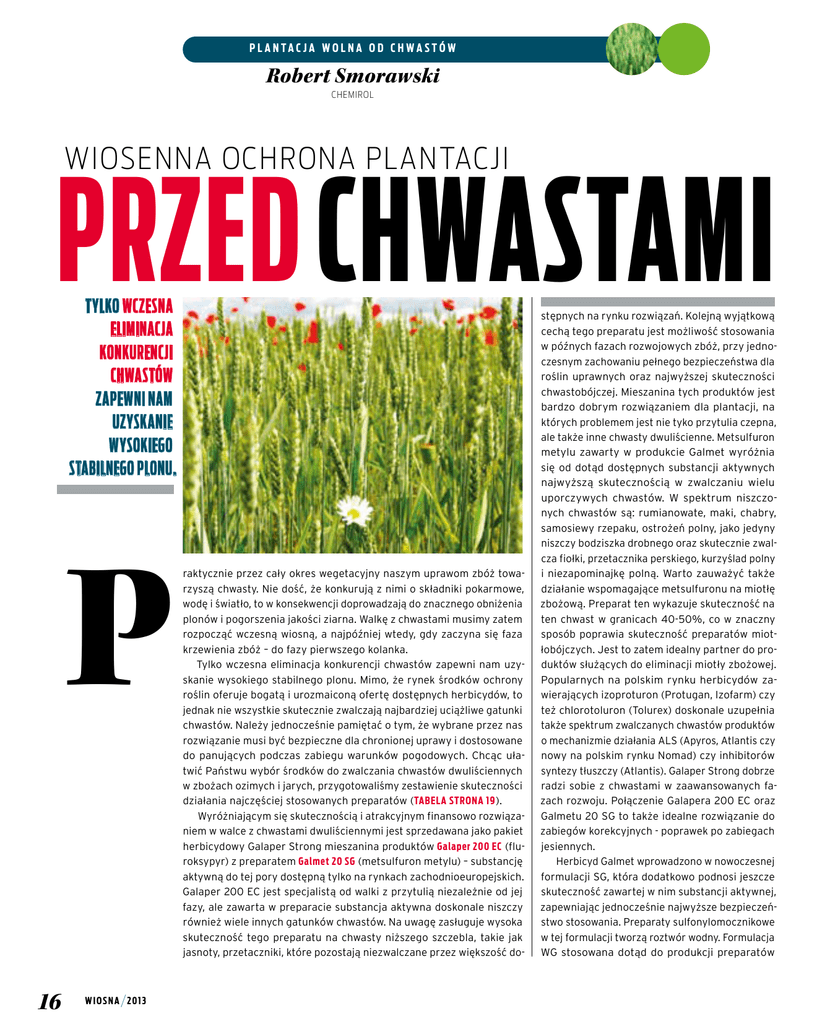 P L A N TAC JA W O L N A O D C H WA ST Ó W Robert Smorawski CHEMIROL WIOSENNA OCHRONA PLANTACJI PRZED CHWASTAMI TYLKO WCZESNA ELIMINACJA KONKURENCJI CHWASTÓW ZAPEWNI NAM UZYSKANIE WYSOKIEGO STABILNEGO PLONU. P 16 W I O S N A /2 0 1 3 raktycznie przez cały okres wegetacyjny naszym uprawom zbóż towarzyszą chwasty. Nie dość, że konkurują z nimi o składniki pokarmowe, wodę i światło, to w konsekwencji doprowadzają do znacznego obniżenia plonów i pogorszenia jakości ziarna. Walkę z chwastami musimy zatem rozpocząć wczesną wiosną, a najpóźniej wtedy, gdy zaczyna się faza krzewienia zbóż – do fazy pierwszego kolanka. Tylko wczesna eliminacja konkurencji chwastów zapewni nam uzyskanie wysokiego stabilnego plonu. Mimo, że rynek środków ochrony roślin oferuje bogatą i urozmaiconą ofertę dostępnych herbicydów, to jednak nie wszystkie skutecznie zwalczają najbardziej uciążliwe gatunki chwastów. Należy jednocześnie pamiętać o tym, że wybrane przez nas rozwiązanie musi być bezpieczne dla chronionej uprawy i dostosowane do panujących podczas zabiegu warunków pogodowych. Chcąc ułatwić Państwu wybór środków do zwalczania chwastów dwuliściennych w zbożach ozimych i jarych, przygotowaliśmy zestawienie skuteczności działania najczęściej stosowanych preparatów (TABELA STRONA 19 ). Wyróżniającym się skutecznością i atrakcyjnym finansowo rozwiązaniem w walce z chwastami dwuliściennymi jest sprzedawana jako pakiet herbicydowy Galaper Strong mieszanina produktów Galaper 200 EC (fluroksypyr) z preparatem Galmet 20 SG (metsulfuron metylu) – substancję aktywną do tej pory dostępną tylko na rynkach zachodnioeuropejskich. Galaper 200 EC jest specjalistą od walki z przytulią niezależnie od jej fazy, ale zawarta w preparacie substancja aktywna doskonale niszczy również wiele innych gatunków chwastów. Na uwagę zasługuje wysoka skuteczność tego preparatu na chwasty niższego szczebla, takie jak jasnoty, przetaczniki, które pozostają niezwalczane przez większość do- stępnych na rynku rozwiązań. Kolejną wyjątkową cechą tego preparatu jest możliwość stosowania w późnych fazach rozwojowych zbóż, przy jednoczesnym zachowaniu pełnego bezpieczeństwa dla roślin uprawnych oraz najwyższej skuteczności chwastobójczej. Mieszanina tych produktów jest bardzo dobrym rozwiązaniem dla plantacji, na których problemem jest nie tyko przytulia czepna, ale także inne chwasty dwuliścienne. Metsulfuron metylu zawarty w produkcie Galmet wyróżnia się od dotąd dostępnych substancji aktywnych najwyższą skutecznością w zwalczaniu wielu uporczywych chwastów. W spektrum niszczonych chwastów są: rumianowate, maki, chabry, samosiewy rzepaku, ostrożeń polny, jako jedyny niszczy bodziszka drobnego oraz skutecznie zwalcza fiołki, przetacznika perskiego, kurzyślad polny i niezapominajkę polną. Warto zauważyć także działanie wspomagające metsulfuronu na miotłę zbożową. Preparat ten wykazuje skuteczność na ten chwast w granicach 40-50%, co w znaczny sposób poprawia skuteczność preparatów miotłobójczych. Jest to zatem idealny partner do produktów służących do eliminacji miotły zbożowej. Popularnych na polskim rynku herbicydów zawierających izoproturon (Protugan, Izofarm) czy też chlorotoluron (Tolurex) doskonale uzupełnia także spektrum zwalczanych chwastów produktów o mechanizmie działania ALS (Apyros, Atlantis czy nowy na polskim rynku Nomad) czy inhibitorów syntezy tłuszczy (Atlantis). Galaper Strong dobrze radzi sobie z chwastami w zaawansowanych fazach rozwoju. Połączenie Galapera 200 EC oraz Galmetu 20 SG to także idealne rozwiązanie do zabiegów korekcyjnych - poprawek po zabiegach jesiennych. Herbicyd Galmet wprowadzono w nowoczesnej formulacji SG, która dodatkowo podnosi jeszcze skuteczność zawartej w nim substancji aktywnej, zapewniając jednocześnie najwyższe bezpieczeństwo stosowania. Preparaty sulfonylomocznikowe w tej formulacji tworzą roztwór wodny. Formulacja WG stosowana dotąd do produkcji preparatów kontrola 1 Toto 75 SG + Aminopielik Super 464 SL + Partner+ 2 4 3 FOT. 1. ORAZ 4. >> Toto - działanie zestawu handlowego FOT. 2. >> Galaper Strong, działanie – przytulia, fiołek polny, inne chwasty dwuliścienne kontrola Toto 75 SG + Aminopielik Super 464 SL + Partner+ FOT. 3. >> Galaper Strong, działanie - chaber bławatek sulfonylomocznikowych tworzyła zawiesinę substancji w wodzie, co mogło prowadzić do osadzania się jej w opryskiwaczu a później do jej niekontrolowanego uwalniania. Nowością wprowadzoną w tym roku na rynku jest preparat TOTO 75 SG oparty na dwóch substancjach aktywnych z grupy pochodnych sulfonylomocznika: tifensulfuronie metylu – 68,2 % i metsulfuronie metylu- 6,8%. Jest to pierwszy herbicyd na polskim rynku zawierający te dwie substancje w innowacyjnej, w pełni rozpuszczalnej formulacji SG, która znacząco poprawia wnikanie substancji aktywnych w głąb roślin chwastów oraz odporność na zmywanie. Tifensulfuron metylu i metsulfuron metylu działają systemicznie, pobierane są głównie przez liście, częściowo przez korzenie. W roślinie przemieszczają się szybko, wstrzymując wzrost i rozwój chwastów wkrótce po zabiegu. Chwasty tracą zdolność konkurencji i częściowo zamierają. Pełny efekt chwastobójczy jest widoczny po upływie 3-4 tygodni od zasto- sowania. Zawarte w preparacie TOTO 75 SG substancje skutecznie eliminują chwasty rumianowate, maki, miotłę zbożową, chwasty z rodziny krzyżowych (w tym samosiewy rzepaku), ostrożeń polny. Wyróżniają się także skutecznością w zwalczaniu chwastów niższego szczebla takich jak: bodziszki, fiołki, przetaczniki, kurzyślad polny, jasnoty i niezapominajka polna (TABELA STRONA 19 ). Substancje aktywne mogą być stosowane od fazy 3 liści do fazy pierwszego kolanka na wszystkich glebach, na których uprawia się zboża. Kompletną opcją wiosen