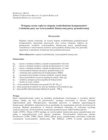 Rynkiewicz Marek∗ Zakład U ytkowania Maszyn i Urz dze Rolniczych Akademia Rolnicza w Szczecinie Wst pna ocena wpływu stopnia rozdrobnienia komponentów i ci nienia pary na wytrzymało kinetyczn paszy granulowanej Streszczenie Badania własne wykazały, e wzrost stopnia rozdrobnienia granulowanych komponentów mieszanek paszowych oraz wzrost ci nienia wpływa na polepszenie wyników wytrzymało ci kinetycznej paszy granulowanej. Umo liwia to sterowaniem warto ci wytrzymało ci kinetycznej, bez potrzeby ingerencji w parametry techniczne linii granulowania pasz. Słowa kluczowe: stopie rozdrobnienia, wytrzymało kinetyczna Oznaczenia: d06 – pasza o redniej rednicy cz stek komponentów 0,6 mm d07 – pasza o redniej rednicy cz stek komponentów 0,7 mm d1.6 – pasza o redniej rednicy cz stek komponentów 1,6 mm Pdi – wytrzymało kinetyczna paszy granulowanej [%] Pk – ci nienie pary podawanej do kondycjonera [MPa] – geometryczna rednia wa ona wielko cz stek [mm] dg Wi – masa pozostało ci na poszczególnych sitach i dnie [g] dzi – rednica zast pcza poszczególnych frakcji [mm] n – liczba sit wraz z dnem Pdi – wytrzymało kinematyczna granul [%] (P→Pmax), mi – masa granul pozostałych na sicie po badaniu wytrzymało ci [g], m – masa próbki laboratoryjnej badanych granul - 500 g. Wst p: Du e zapotrzebowanie rynku na produkty pochodzenia zwierz cego o wysokiej jako ci (mi sa, mleka, jaj oraz ich przetworów), wymaga stosowania w chowie zwierz t odpowiednich pasz. Pełnoporcjowe mieszanki paszowe, o składzie zapewniaj cym dostarczanie składników pokarmowych s niezb dne do zaspokajania potrzeb ywieniowych zwierz t. Badania prowadzone w ró nych o rodkach wskazuj , e zwierz ta uzyskuj wi ksze przyrosty, je eli karmione s paszami granulowanymi odpowiedniej jako ci. Audet [1995] i Payne [1997] podaj , e wytrzymało kinetyczna paszy granulowanej jest jedn z najwa niejszych cech jako ci granulatu. Wytrzymało kinetyczn opisuje Grochowicz [1996, 1998]. Payne [1994] jako paszy granulowanej, uto samia wył cznie z pomiarem wytrzymało ci kinetycznej. Mc Ellhiney [1995] w swoim opracowaniu 207 dotycz cym kontroli jako ci pasz, pod poj ciem jako ci paszy granulowanej wymienia równie tylko wytrzymało kinetyczn . Wysoka warto wytrzymało ci kinetycznej oznacza, e pasza granulowana jest bardziej trwała tzn. granule nie ulegaj uszkodzeniu podczas transportu od producenta do hodowcy oraz w transporcie wewn trznym. W trakcie transportu granule mog by poddawane cieraniu i łamaniu. Behnke [1996] podaje nast puj cy procentowy udział wpływu czynników procesu granulacji na jako paszy granulowanej: u yte składniki w 40%, stopie rozdrobnienia oraz proces kondycjonowania po 20%, parametry matrycy w 15%, a najmniejszy wpływ ma proces chłodzenia - 5%. Celem pracy była ocena wpływu stopnia rozdrobnienia komponentów mieszanek paszowych i ci nienia pary podawanej do kondycjonera granulatora wytrzymało kinetyczn paszy granulowanej. Metodyka bada Badania przeprowadzono na granulatorze DPAA z matryc pier cieniow , o poziomej osi, z dwoma rolkami prasuj cymi. rednica otworów matrycy wynosiła 4 mm. Granulowana mieszanka składała si z nast puj cych komponentów: kukurydza – 33,4%, pszenica 33,2%, soja 23,1%, ruta rzepakowa 3,0%, olej ro linny 1,3% i koncentrat 6,0%. Komponenty mieszanki paszowej były rozdrabniane w rozdrabniaczu bijakowym przy wykorzystaniu sit o rednicy otworów 2mm, 2,5 mm 3,5 mm. Sita rozdrabniacza o ró nych rednicach oczek umo liwiły rozdrobnienie komponentów do redniej rednicy cz stek: 0,6 mm, 0,7mm i 1,6mm. Mieszanki te, w zale no ci od stopnia rozdrobnienia oznaczono odpowiednio d06, d07 i d1.6. Proces produkcji paszy granulowanej przeprowadzono na granulatorze, do kondycjonera którego podawano par wodn pod ci nieniem od 0,20; 0,25; 0,30; 0,35; 0,40 i 0,45 MPa. Temperatura mieszanki po kondycjonowaniu wynosiła 80 ± 100C, a wydajno granulatora 11500 kg/h. Oznaczanie stopnia rozdrobnienia komponentów przeprowadzono dla próbek laboratoryjnych o masie 100 g badanej paszy. Pasz wsypywano na górne sito przesiewacza laboratoryjnego (stosowano sita o rednicy oczek: 10,0; 8,0; 6,0; 5,0; 4,0; 3,0; 2,0; 1,0; 0,5; 0,2 i 0,1 mm) i przesiewano 3 minuty z cz stotliwo ci 100 Hz i amplitudzie równej 130 mm (zgodnie z PN– 89/R–64798). Po 3 min. przerywano przesiewanie, ostukiwano boki ramek i ponownie przesiewano przez 1 min. Po zako czeniu ka d frakcj wa ono z dokładno ci do 0,1 g. Na tej podstawie obliczano redni geometryczn wa on wielko cz stek według wzoru: dg = 10x (1) i =n w którym x = i −1 Wi lg d zi i =n i =1 (2) Wi W dalszej cz ci pracy redni geometryczn wa on wielko podawano jako redni rednic cz stek mieszanki paszowej. cz stek mieszanki paszowej Pomiar wytrzymało ci kinetycznej paszy granulowanej przeprowadzono przy wykorzystaniu testera mechanicznego ZU-05. Tester ZU-05 (rys. 1) zbudowany jest z komory stalow o wymiarach 285 x 285 x 120 mm, w której po przek tnej umieszczona jest płytka stalowa o wymiarach 230 x 50 x 2 mm (PN-R-64834). Komora testera obracana jest wokół swojej osi z pr dko ci 50 obr/min. Do pomiarów przygotowano próbki o masie co najmniej 3 kg z 208 próbek pierwotnych. Z próbki ogólnej odsiewano rozkruszone cz ci na sicie o rednicy otworów mniejszej o 1 mm od rednicy granul, a nast pnie pobierano trzy próbki laboratoryjne o masie 500 ± 0,5g ka da. Próbk umieszczano w komorze, któr wirowano przez 10 min. Po zatrzymaniu testera próbk odsiewano na sicie o oczkach o rednicy otworów mniejszej o 1 mm od rednicy granul, a pozostało na sicie wa ono. Wytrzymało kinetyczn paszy granulowanej obliczano wg wzoru: Pdi = mi ⋅ 100 m (3) Analiz statystyczn przeprowadzono przy pomocy programu Statistica i Excel. Dla wszystkich parametrów sprawdzono ich zgodno z rozkładem normalnym. Do zbadania rozkładu badanych cech posłu ono si testem Shapiro – Wilka. Jako krytyczny poziom istotno ci przyj to p = 0,05. Dla parametrów 