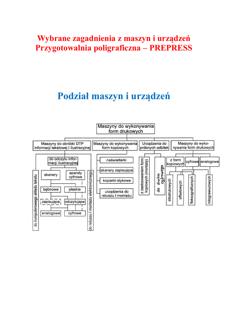 Wybrane zagadnienia z maszyn i urządzeń Przygotowalnia poligraficzna – PREPRESS Podział maszyn i urządzeń Naświetlarki CtF, CtP i CtPress Naświetlarka, fotonaświetlarka – urządzenie wykorzystywane w poligrafii do nanoszenia metodą optyczną obrazu drukowego bezpośrednio na formę drukową lub na formę kopiową służącą później do wykonania formy drukowej. Wyróżnia się kilka typów naświetlarek W technologii CtF wykorzystuje się naświetlarki laserowe, służące do naświetlania klisz (czyli form kopiowych), które później będą wykorzystywane do naświetlania metodą stykową form drukowych w rozmaitych technikach druku. W zależności od docelowej techniki druku, obraz na kliszach może być naświetlany pozytywowo lub negatywowo, oraz prawo- lub lewoczytelnie (czyli w odbiciu lustrzanym). W technologii CtP wykorzystuje się naświetlarki praktycznie takie same jak w CtF, ale dostosowane do naświetlania bezpośrednio płaskich form drukowych w postaci tzw. blach. Metoda ta wykorzystywana jest do przygotowywania druku offsetowego. W technologii CtPress wykorzystywane są naświetlarki diodowe (LED) usytuowane bezpośrednio, w każdym z zespołów drukujących na maszynie drukarskiej. Naświetlają one formy drukowe bezpośrednio w tym miejscu, z którego za chwilę będzie odbywał się druk. W technologiach CtF i CtP spotykane są dwa rozwiązania naświetlarek Naświetlarka bębnowa – w której klisza lub płyta offsetowa (ta druga zazwyczaj z cienkiej blachy aluminiowej) rozciągnięta jest na wycinku obwodu specjalnego bębna warstwą światłoczułą do wewnątrz, a przesuwający się powoli wzdłuż osi bębna (a jednocześnie szerokości kliszy) laser z wirującym zwierciadłem oświetla po obwodzie kolejne fragmenty bębna Naświetlarka liniowa (kapstanowa) – w której klisza jest ze stałą prędkością przesuwana przed nieruchomym laserem, którego światło za pomocą wirującego zwierciadła omiata kolejne poprzeczne fragmenty kliszy. W obu powyższych rozwiązaniach, na kliszy lub płycie powstaje w wyniku naświetlenia obraz utajony, który trzeba następnie poddać obróbce chemicznej w celu wywołania i utrwalenia obrazu. Konstrukcja naświetlarek bębnowych ma przewagę nad liniowymi ze względu na dokładność i powtarzalność naświetlanego rysunku, gdyż naświetlana powierzchnia nie porusza się. Skutkuje to m.in. tym, że poszczególne wyciągi barwne można w dowolny sposób rozkładać na arkuszu filmu bez obawy o późniejsze ich spasowanie. Wadą jest ograniczenie wielkości naświetlanego materiału do wielkości (szerokości i obwodu) bębna. W naświetlarkach liniowych zaś można naświetlać powierzchnie ograniczone szerokością filmu, za to długość jest teoretycznie ograniczona tylko długością filmu w rolce. Jednak ze względu na gorszą geometrię naświetlarek liniowych kolejne wyciągi barwne dla danego użytku muszą być naświetlane szeregowo (a więc nie można ich np. naświetlać parami na kliszy obok siebie), a ponadto rozwijanie filmu i jego późniejsze zwijane w kasecie odbiorczej dodatkowo pogarsza geometrię obrazu. Stąd w naświetlarkach liniowych cały wielokolorowy użytek musi być naświetlany na wspólnym kawałku filmu, a jeśli film skończy się przed ostatnim kolorem, to trzeba od początku naświetlać wszystkie kolory z nowej rolki. W naświetlarkach bębnowych tego rodzaju problemy w zasadzie nie powstają. Prędkość naświetlarek liniowych jest zazwyczaj większa od naświetlarek bębnowych. Naświetlarki do klisz są z reguły użytkowane bezpośrednio w studiach DTP lub w ogólnodostępnych punktach usługowych, natomiast naświetlarki do blach, choć są użytkowane w punktach usługowych współpracujących bezpośrednio z konkretnymi drukarniami, to jednak częściej spotykane są na miejscu w drukarniach pracując na potrzeby własne. Natomiast konstrukcja, zastosowanie i reguły rządzące się naświetlarkami w technologii CtP, są zupełnie inne od dwu wymienionych wcześniej i trudno tu, o jakieś porównania. Schemat działania naświetlarek z lampami CRT 1. Układ sterowania 5. Kasety 2. Lampa CRT 6. Rolki prowadzące 3. Układ optyczny korygujący 4. Materiał światłoczuły 7. Mechanizm tnący Schemat działania naświetlarek laserowych 1. Układ sterowania 5. Blok formowania promienia 2. Laser 6. Zwierciadło 3. Modulator 7. Blok optyki korekcyjnej 4. Filtr gęstości optycznej 8. Materiał światłoczuły Schemat budowy naświetlarek laserowych CtF i CtP Naświetlarki bębnowe z bębnem wewnętrznym Budowa urządzenia 1. laser, 2. lustro, 3. układ optyczny, 4. zwierciadło wirujące, 5. materiał światłoczuły, Naświetlarki bębnowe z bębnem wewnętrznym Budowa urządzenia 1. laser, 2. lustro, 3. układ optyczny, 4. zwierciadło wirujące, 5. materiał światłoczuły, Naświetlarki kapstanowe-liniowe Budowa urządzenia 1. laser, 2. modulator, 3. układ optyczny, 4. zwierciadło wielościenne, 5. układ optyczny korygujący, 6. lustro, 7. materiał światłoczuły, Naświetlarka laserowa z bębnem wewnętrznym firmy AGFA + wywoływarka I – naświetlanie płyt drukowych, II – automatyczne wywoływanie form drukowych, Naświetlarka bębnowa z laserem termicznym 1. Stół podający płyty drukowe 2. Proces naświetlania (naświetlarka) 3. Pomost transportujący 4. Proces wywoływania płyt drukowych (wywoływarka) 5. Środki chemiczne wywoływarki 6. Wykładak form drukowych Wywoływarka – urządzenie poligraficzne uczestniczące w procesie wytwarzania form drukowych Schemat blokowy wywoływarki Etapy pracy wywoływarki Wywoływanie, Utrwalanie, Płukanie, Suszenie, Ogólne informacje dotyczące naświetlarek Naświetlarka AGFA - parametry Agfa :Xcalibur 45S Agfa :Xcalibur 45S naświetlarka termiczna do płyt formatu B1 System naświetlania: termiczny w podczerwieni 830 nm z użyciem modułu Grating Light Valve™ (GLV™) Minimalny wymiar płyty: 450 x 25