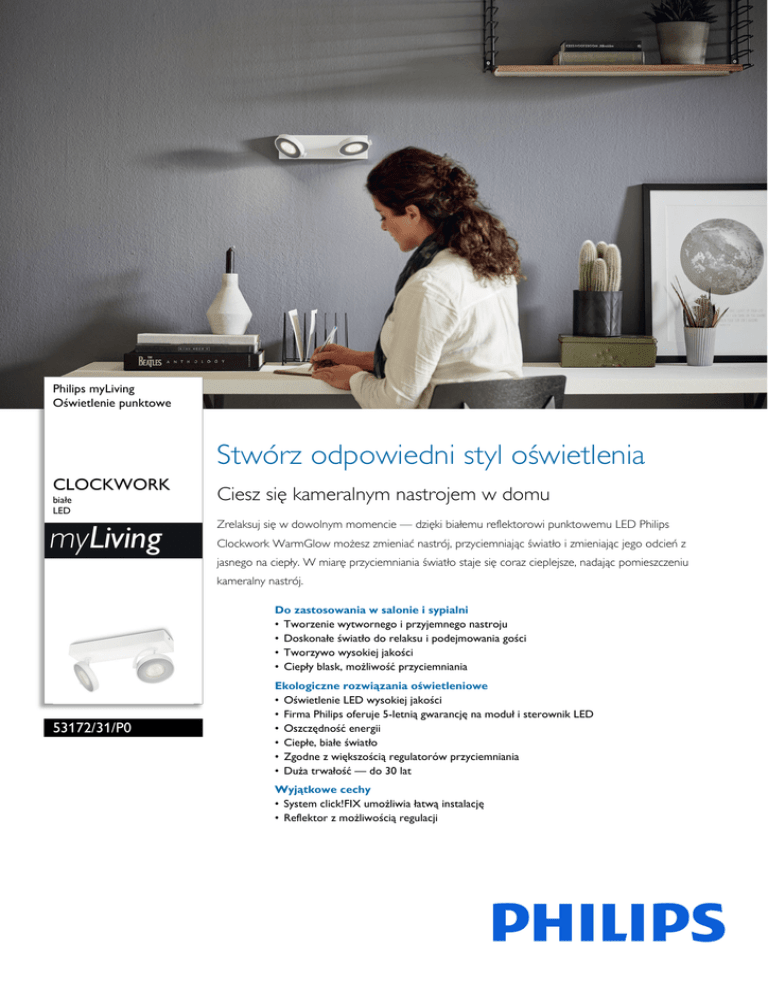 Philips myLiving Oświetlenie punktowe Stwórz odpowiedni styl oświetlenia CLOCKWORK białe LED myLiving Ciesz się kameralnym nastrojem w domu Zrelaksuj się w dowolnym momencie — dzięki białemu reflektorowi punktowemu LED Philips Clockwork WarmGlow możesz zmieniać nastrój, przyciemniając światło i zmieniając jego odcień z jasnego na ciepły. W miarę przyciemniania światło staje się coraz cieplejsze, nadając pomieszczeniu kameralny nastrój. Do zastosowania w salonie i sypialni • Tworzenie wytwornego i przyjemnego nastroju • Doskonałe światło do relaksu i podejmowania gości • Tworzywo wysokiej jakości • Ciepły blask, możliwość przyciemniania 53172/31/P0 Ekologiczne rozwiązania oświetleniowe • Oświetlenie LED wysokiej jakości • Firma Philips oferuje 5-letnią gwarancję na moduł i sterownik LED • Oszczędność energii • Ciepłe, białe światło • Zgodne z większością regulatorów przyciemniania • Duża trwałość — do 30 lat Wyjątkowe cechy • System click!FIX umożliwia łatwą instalację • Reflektor z możliwością regulacji 5317231P0 Oświetlenie punktowe CLOCKWORK białe, LED Zalety Oświetlenie LED wysokiej jakości zwanych kelwinami (K). Lampy o niskiej wartości kelwinów zapewniają ciepłe, bardziej przytulne światło, natomiast lampy o wysokiej wartości kelwinów dają chłodne, bardziej pobudzające światło. Ta lampa firmy Philips rzuca ciepłe, białe światło, które zapewnia przytulną atmosferę. System łatwego mocowania click!FIX Reflektor z możliwością regulacji Technologia LED zastosowana w tej lampie firmy Philips to wyjątkowe rozwiązanie opracowane przez firmę Philips. Natychmiast się włącza, pozwala na uzyskanie optymalnej wydajności oświetlenia oraz podkreśla i ożywia kolory w Twoim domu. Lampa LED wykorzystuje system click!FIX, czyli nowy, rewolucyjny system mocowania opatentowany przez firmę Philips. Korzystając z systemu click!FIX, można łatwo zamontować lampę w 4 prostych krokach. To proste i szybkie! 5 lat gwarancji na system LED Oszczędność energii Skieruj światło w wybrane miejsce, obracając lub nachylając reflektor. Zgodne z większością regulatorów przyciemniania Oprócz standardowej 2-letniej gwarancji na tę lampę firma Philips oferuje 5-letnią gwarancję na system LED, czyli moduł i sterownik LED zastosowany w lampie. Ciepłe, białe światło Światło może mieć różne temperatury barwowe oznaczane za pomocą jednostek Ta energooszczędna lampa firmy Philips zużywa mniej energii niż tradycyjne źródła światła, co pozwala zmniejszyć rachunki za prąd i przyczynia się do ochrony środowiska. Ta lampa LED firmy Philips jest wyposażona w najnowszą technologię LED, która współpracuje z większością regulatorów przyciemniania. Możesz użyć posiadanego regulatora lub dowolnego regulatora innego typu! Tworzenie wytwornego nastroju Ta lampa została stworzona w oparciu o nowoczesne poczucie smaku, trendy i style życia. Doskonale wtapia się w wystrój wnętrza i pozwala stworzyć wymarzony, niepowtarzalny nastrój. 5317231P0 Oświetlenie punktowe CLOCKWORK białe, LED Dane techniczne Stylistyka i wykończenie • Materiał: metal • Kolor: biały Dodatkowe funkcje/akcesoria w zestawie • Zgodność ze wszystkimi regulatorami przyciemniania • Wbudowane diody LED • Precyzyjne wiązki światła • System mocowania click!FIX • Reflektor z możliwością regulacji • 5 lat gwarancji na moduł LED • Ciepły blask i możliwość przyciemniania światła Wymiary i waga produktu • • • • Wysokość: 9,0 cm Długość: 25,5 cm Szerokość: 9,3 cm Waga netto: 0,690 kg • Barwa światła: ciepła biel • Łączna moc strumienia świetlnego oprawy w lumenach: 1000 lm • Oprawa z możliwością przyciemniania • LED • Maksymalny okres eksploatacji: 30 000 godz. • Współczynnik IP: IP20, ochrona przed przedmiotami powyżej 12,5 mm, brak ochrony przed wodą • Klasa ochronności: I — uziemienie • Źródło światła odpowiadające tradycyjnej żarówce o mocy: 41 W Serwis • Gwarancja: 5 lat Wymiary i waga opakowania • • • • Dane techniczne • Zasilanie sieciowe: Przedział 220–240 V, 50–60 Hz • Technologia źródła światła: LED, Bezpieczne, bardzo niskie napięcie • Liczba źródeł światła: 2 • Moc źródła światła w zestawie: 4,5 W Wysokość: 29,8 cm Długość: 11,3 cm Szerokość: 11,3 cm Waga: 0,835 kg Różne • Opracowano z myślą o: Salon i sypialnia • Styl: Nowoczesna • Typ: Oświetlenie punktowe • Data wydania 2016-06-28 © 2016 Koninklijke Philips N.V. Wszelkie prawa zastrzeżone. Wersja: 1.0.1 Dane techniczne mogą ulec zmianie bez powiadomienia. Znaki towarowe są własnością Koninklijke Philips N.V. lub własnością odpowiednich firm. 12 NC: 9150 053 06001 EAN: 87 18696 15451 9 www.philips.com