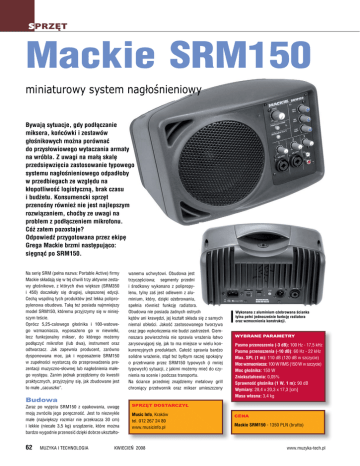 SPRZĘT Mackie SRM150 miniaturowy system nagáoĞnieniowy Bywajð sytuacje, gdy podãðczanie miksera, koýcówki i zestawów gãoćnikowych moēna porównaç do przysãowiowego wytaczania armaty na wróbla. Z uwagi na maãð skalõ przedsiõwziõcia zastosowanie typowego systemu nagãoćnieniowego odpadãoby w przedbiegach ze wzglõdu na kãopotliwoćç logistycznð, brak czasu i budēetu. Konsumencki sprzõt przenoćny równieē nie jest najlepszym rozwiðzaniem, choçby ze uwagi na problem z podãðczeniem mikrofonu. Cóē zatem pozostaje? Odpowiedđ przygotowana przez ekipõ Grega Mackie brzmi nastõpujðco: siõgnðç po SRM150. Na seriõ SRM (peãna nazwa: Portable Active) firmy Mackie skãadajð siõ w tej chwili trzy aktywne zestawy gãoćnikowe, z których dwa wiõksze (SRM350 i 450) doczekaãy siõ drugiej, ulepszonej edycji. Cechð wspólnð tych produktów jest lekka polipropylenowa obudowa. Takð teē posiada najmniejszy model SRM150, któremu przyjrzymy siõ w niniejszym tećcie. Oprócz 5,25-calowego gãoćnika i 100-watowego wzmacniacza, wyposaēono go w niewielki, lecz funkcjonalny mikser, do którego moēemy podãðczyç mikrofon (lub dwa), instrument oraz odtwarzacz. Jak zapewnia producent, zarówno dysponowana moc, jak i wyposaēenie SRM150 w zupeãnoćci wystarczð do przeprowadzenia prezentacji muzyczno-sãownej lub nagãoćnienia maãego wystõpu. Zanim jednak przejdziemy do kwestii praktycznych, przyjrzyjmy siõ, jak zbudowane jest to maãe „cacuszko”. Budowa Zaraz po wyjõciu SRM150 z opakowania, uwagõ mojð zwróciãa jego porõcznoćç. Jest to niezwykle maãe (najwiõkszy rozmiar nie przekracza 30 cm) i lekkie (niecaãe 3,5 kg) urzðdzenie, które moēna bardzo wygodnie przenosiç dziõki dobrze uksztaãto- 62 MUZYKA I TECHNOLOGIA wanemu uchwytowi. Obudowa jest trzyczõćciowa; segmenty przedni i ćrodkowy wykonano z polipropylenu, tylny zać jest odlewem z aluminium, który, dziõki oēebrowaniu, speãnia równieē funkcjõ radiatora. Obudowa nie posiada ēadnych ostrych kðtów ani krawõdzi, jej ksztaãt skãada siõ z samych niemal obãoćci. Jakoćç zastosowanego tworzywa oraz jego wykoýczenia nie budzi zastrzeēeý. Ciemnoszara powierzchnia nie sprawia wraēenia ãatwo zarysowujðcej siõ, jak to ma miejsce w wielu konkurencyjnych produktach. Caãoćç sprawia bardzo solidne wraēenie, stðd teē byãbym raczej spokojny o przetrwanie przez SRM150 typowych (i mniej typowych) sytuacji, z jakimi moēemy mieç do czynienia na scenie i podczas transportu. Na ćciance przedniej znajdziemy metalowy grill chroniðcy przetwornik oraz mikser umieszczony Wykonana z aluminium oēebrowana ćcianka tylna peãni jednoczećnie funkcjõ radiatora oraz wzmocnienia konstrukcji. WYBRANE PARAMETRY Pasmo przenoszenia (-3 dB): 100 Hz - 17,5 kHz Pasmo przenoszenia (-10 dB): 60 Hz - 22 kHz Max. SPL (1 m): 110 dB (120 dB w szczycie) Moc wzmacniacza: 100 W RMS (150 W w szczycie) Moc gãoćnika: 150 W Znieksztaãcenia: 0,05% Sprawnoćç gãoćnika (1 W, 1 m): 90 dB Wymiary: 28,4 x 20,3 x 17,3 [cm] Masa wãasna: 3,4 kg SPRZČT DOSTARCZYâ Music Info, Kraków tel. 012 267 24 80 www.musicinfo.pl KWIECIEü 2008 CENA Mackie SRM150 - 1350 PLN (brutto) www.muzyka-tech.pl system nagłośnieniowy w nieznacznym wgãõbieniu. Stosowne wgãõbienie zastosowano równieē z tyãu, aby zabezpieczyç znajdujðce siõ tam wãðczniki i gniazda. Rozplanowanie poszczególnych elementów miksera charakteryzuje siõ duēð przejrzystoćcið. Gaãki potencjometrów, wyjõte „ēywcem” z duēych konsolet Mackie, zostaãy zróēnicowane pod wzglõdem wielkoćci oraz kolorystyki, co uãatwia korzystanie z nich w warunkach sãabej widocznoćci. To samo dotyczy przycisków – prosty patent z dwukolorowym oznaczeniem zapewnia sprawnð ocenõ wzrokowð ich aktualnego poãoēenia. Dostawcð gniazd przyãðczeniowych jest firma Neutrik, co gwarantuje ich dãugoletnið bezproblemowð pracõ. Zajrzyjmy do Ĥrodka Za przetwarzanie dđwiõku odpowiada gãoćnik o ćrednicy 5,25’’ i mocy 150 W, opracowany wspólnie z firmð EAW. Przetwornik posiada neodymowy magnes oraz cewkõ o ćrednicy zaledwie 1’’ (25,4 mm). Konstruktorzy postawili przed gãoćnikiem nieãatwe zadanie przetwarzania caãoćci pasma akustycznego, bez wspomagania dodatkowym przetwornikiem wysokotonowym. Rzecz jasna, trudno od tak maãego gãoćnika oczekiwaç skutecznego przetwarzania basu, zwãaszcza przy zachowaniu ultrakompaktowych rozmiarów obudowy. Czõćciowo braki w tym zakresie udaão siõ konstruktorom wypeãniç przy pomocy ukãadu bass-reflex. Wspóãpracujðca z gãoćnikiem komora nie zostaãa wyãoēona ēadnymi materiaãami wytãumiajðcymi, co prawdopodobnie nie byão konieczne ze wzglõdu na jej nieregularny ksztaãt. W osobnej komorze zamkniõto ukãady elektroniczne, w tym wzmacniacz pracujðcy w klasie D oraz impulsowy zasilacz. Wzmacniacz zostaã zabezpieczony przed zbyt wysokim sygnaãem (ukãad limitera) oraz przegrzaniem – w przypadku wystðpienia takowego, odpowiedni ukãad odãðcza obciðēenie. Prosty mikser umoēliwia wspóãpracõ z instrumentami, odtwarzaczami oraz mikrofonami – zarówno dynamicznymi, jak i pojemnoćciowymi. W kwestii osiðgów ukãadu wzmacniacz-gãoćnik, w materiaãach producenta wystõpujð pewne rozbieēnoćci. Na stronie internetowej jest mowa o 116 dB uzyskanych z odlegãoćci 1 metra, podczas gdy instrukcja urzðdzenia mówi o 110 decybelach w pracy ciðgãej i 120 dB w szczycie (peak). Jakby na to nie patrzeç, sð to doćç spore wartoćci jak na urzðdzenie o tak niewielkich gabarytach. Generowany poziom SPL pozwala na korzystanie z SRM150 w roli odsãuchu scenicznego. Tak maãy gãoćniczek nie bõdzie naturalnie w stanie zastðpiç duēego podãogowego monitora, jednak po umieszczeniu go na statywie mikrofonowym, a wiõc na wysokoćci uszu muzyka, uzyskana gãoćnoćç moēe okazaç siõ caãkowicie wystarczajðca. R E K L A M A Mikser Wbudowany prosty 3-kanaãowy m