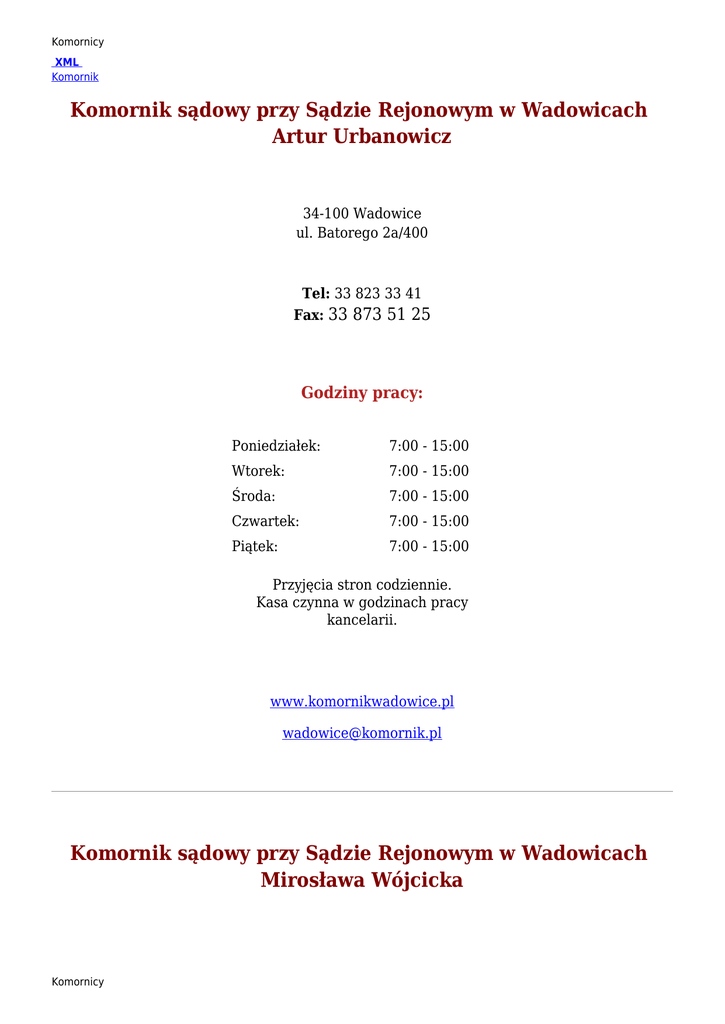 Komornicy XML Komornik Komornik sądowy przy Sądzie Rejonowym w Wadowicach Artur Urbanowicz 34-100 Wadowice ul. Batorego 2a/400 Tel: 33 823 33 41 Fax: 33 873 51 25 Godziny pracy: Poniedziałek: 7:00 - 15:00 Wtorek: 7:00 - 15:00 Środa: 7:00 - 15:00 Czwartek: 7:00 - 15:00 Piątek: 7:00 - 15:00 Przyjęcia stron codziennie. Kasa czynna w godzinach pracy kancelarii. www.komornikwadowice.pl [email protected] Komornik sądowy przy Sądzie Rejonowym w Wadowicach Mirosława Wójcicka Komornicy Komornicy 34-100 Wadowice ul. Mickiewicza 27 / 7 Tel: 33 873 26 65 Tel. kom. 535-957-990 Godziny urzędowania Poniedziałek - Piątek: 7.30 - 15.30 Przyjęcia stron przez Komornika Wtorek: 10.00 - 12.00 Czwartek: 14.00 - 16.30 www.komornik.wadowice.pl [email protected] Rachunek bankowy Bank Pekao S.A. o/Wadowice 83 1240 4197 1111 0010 2228 0560 Komornik Sądowy przy Sądzie Rejonowym w Wadowicach Olgierd Urbanowicz 34-100 Wadowice ul.Żwirki i Wigury 8/3 Komornicy Komornicy Tel: 33 873 26 95 e-mail: [email protected] www.komornikurbanowicz.pl Godziny otwarcia: Poniedziałek: 7.30 - 17.00 Wtorek - Piątek: 7.30 - 15.30 Komornik przyjmuje interesantów: Poniedziałk: 12.00 - 17.00 Konto do wpłat: Bank Gospodarki Żywnościowej SA nr konta: 37 2030 0045 1110 0000 0386 0330 Komornik Sądowy przy Sądzie Rejonowym w Wadowicach Tomasz Młodzikowski 34-100 Wadowice ul. Batorego 22 Tel/Fax: 33 874 47 82 e-mail: [email protected] www.komornik-wadowice.pl Godziny otwarcia: Komornicy Komornicy Poniedziałek: 8.00 - 17.00 Wtorek - Piątek: 8.00 - 15.30 Komornik przyjmuje strony: poniedziałek: 1400 - 1600 czwartek: 900 - 1200 Kasa czynna: w czasie urzędowania kancelarii Nr rachunku bankowego - Bank BGŻ: 70 2030 0045 1110 0000 0259 1170 Podmiot publikujący Sąd Rejonowy w Wadowicach Wytworzył Sąd Rejonowy w Wadowicach 2008-12-12 Publikujący Łukasz Polak 2008-12-12 15:03 Modyfikacja Łukasz Polak 2016-03-09 13:27 Rejestr zmian Komornicy