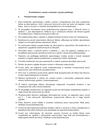 Przedmiotowe zasady oceniania z języka polskiego I. Postanowienia wstępne 1. Prace kontrolne, sprawdziany z nauki o języku i ortograficzne oraz testy znajomości lektur są obowiązkowe. Jeśli z przyczyn losowych uczeń nie może ich napisać z całą klasą, musi to uczynić w terminie dwutygodniowym od rozdania prac. 2. W przypadku otrzymania oceny niedostatecznej poprawa prac, o których mowa w punkcie 1., jest obowiązkowa. Odbywa się w ustalonym terminie (do dwóch tygodni od rozdania prac). Poprawę uczeń pisze tylko raz. 3. Przy poprawianiu pracy i pisaniu w drugim terminie kryteria oceny nie zmieniają się. 4. Każdorazowo przed omawianiem dłuższej lektury odbywają się krótkie sprawdziany mające na celu sprawdzenie znajomości tekstu. 5. Po omówieniu lektury przeprowadza się obowiązkowy sprawdzian lub kartkówkę ze znajomości zagadnień analizowanych na lekcjach. 6. Wszystkie prace, o których mowa w punkcie 1., oraz ich poprawy znajdują się w posiadaniu nauczyciela, przechowywane są w szkole i stanowią jej dokumentację. 7. Poprawie nie podlegają kartkówki sprawdzające wiedzę ucznia z trzech ostatnich tematów (wyjątek stanowią kartkówki ze znajomości lektur szkolnych). 8. O liczbie kartkówek oraz prac pisemnych w trakcie semestru decyduje nauczyciel. 9. Rodzic ma prawo wglądu do pracy ucznia w obecności nauczyciela. 10. Uczeń, który nie poprawił oceny niedostatecznej w terminie wyznaczonym przez nauczyciela, traci możliwość jej poprawienia. 11. Dwa razy w semestrze uczeń może zgłosić brak przygotowania do lekcji (nie dotyczy to prac zapowiedzianych wcześniej). 12. Dłuższa nieobecność w szkole nie zwalnia ucznia z obowiązku znajomości tekstu lektury realizowanej zgodnie z harmonogramem. 13. W trakcie omawiania lektury obowiązuje znajomość wszystkich tematów z nią związanych (nie tylko trzech ostatnich). 14. W przypadku nieobecności na zajęciach uczeń ma obowiązek uzupełnienia notatek w ciągu trzech dni od powrotu do szkoły. 15. Wypracowania domowe podlegają obowiązkowej ocenie, na napisanie pracy uczeń ma 2 – 5 dni roboczych. Sprawdzanie wypracowań odbywa się w ciągu dwóch tygodni. 16. Prace domowe uczeń oddaje w terminie ustalonym przez nauczyciela. Brak pracy skutkuje oceną niedostateczną. 17. Uczeń ma obowiązek prowadzenia notatek z lekcji w zeszycie w linie z marginesem w dogodnym dla siebie formacie oraz posiadania na zajęciach podręczników. 18. Uczeń jest zobowiązany do noszenia zeszytu ćwiczeń na każdą lekcję (oraz wypełniania go zgodnie z zaleceniami nauczyciela). Jego brak jest równoznaczny z nieprzygotowaniem do lekcji i skutkuje oceną niedostateczną. Strona 1 z 42 19. Pracą domową jest również przeczytanie zadanego tekstu literackiego z podręcznika, jej niewykonanie skutkuje oceną niedostateczną. 20. Wszelkie prace domowe, a głównie wypracowania ściągnięte z Internetu traktowane są jako plagiat, skutkują oceną niedostateczną bez możliwości jej poprawienia. 21. Ocena roczna wystawiona na koniec klasy trzeciej nie stanowi podsumowania pracy ucznia w ciągu trzech lat jego nauki w gimnazjum. 22. Przedmiotowe Zasady Oceniania z języka polskiego uwzględniają zalecenia poradni psychologiczno – pedagogicznej dla uczniów z dysfunkcjami. Nauczyciel dostosowuje przedmiotowe zasady oceniania do indywidualnych potrzeb ucznia, np. odpytywanie poza klasą, zwolnienie z pamięciowego opanowania tekstu, zróżnicowanie prac domowych, dyktanda tylko z wyrazów wcześniej ćwiczonych. II. Standardy wymagań Według podstawy programowej. III. Obszary aktywności podlegające ocenianiu 1. Wypowiedzi ustne: a. kilkuzdaniowa wypowiedź, b. dialog, c. opowiadanie, d. recytacja, e. prezentacja, f. głos w dyskusji, g. czytanie tekstów, h. aktywność na lekcji. 2. Wypowiedzi pisemne: a. odpowiedź na pytania, b. rozwiązywanie zadań, c. wykonanie ćwiczeń, d. redagowanie form wypowiedzi przewidzianych w podstawie programowej, e. dyktando. 3. Zadania praktyczne z wykorzystaniem: a. albumów, b. słowników, Strona 2 z 42 c. map, d. słuchowisk, e. filmu. 4. Przekłady intersemiotyczne. 5. Inne a. Osiągnięcia w konkursach przedmiotowych. IV. Kryteria i sposoby oceniania 1. Wypowiedzi ustne Uczeń mówi zgodnie z tematem; zachowuje odpowiednią kompozycję wypowiedzi (pamięta o wstępie, rozwinięciu, zakończeniu, łączy tekst w logiczną całość, unika powtarzania myśli); zwraca uwagę na poprawność językową (stosuje bogate słownictwo, włącza w wypowiedź związki frazeologiczne, przysłowia, porównania, cytaty); dba o odpowiedni akcent; dostosowuje tempo mówienia do tematu i formy wypowiedzi, pamięta o płynności. Uczeń może otrzymać ocenę bardzo dobrą za aktywny udział w lekcji lub kolejnych zajęciach, jeżeli przynajmniej pięć razy zgłosi się do odpowiedzi, a jego wypowiedzi będą poprawne merytorycznie i językowo, samodzielne i wyczerpujące temat, poparte cytatami z tekstu. W ocenie recytacji pod uwagę bierze się: a. pamięciowe opanowanie tekstu, b. zrozumienie treści, c. wyraźną artykulację, d. właściwe przestankowanie, e. logiczne akcentowanie, f. odpowiednią barwę dźwiękową (modulację), g. trafność interpretacji głosowej. Ocenę celującą otrzymuje uczeń, który spełni wszystkie kryteria. Ocenę dopuszczającą otrzymuje uczeń za pamięciowe opanowanie tekstu. Strona 3 z 42 2. Wypowiedzi pisemne W pracach pisemnych ucznia ocenie podlega poziom merytoryczny pracy (zgodność treści pracy z tematem, dobór materiału i jego wykorzystanie w pracy, umiejętność wnioskowania, uzasadniania sądów, wartościowania), jej poziom kompozycyjny (właściwe proporcje wstępu, rozwinięcia i zakończenia, posługiwanie się określoną formą wypowiedzi, spójność i logika tekstu), poziom językowy pracy (posługiwanie się fleksją, frazeologią i składnią, dobór słownictwa), poprawność ortograficzna i interpunkcyjna 