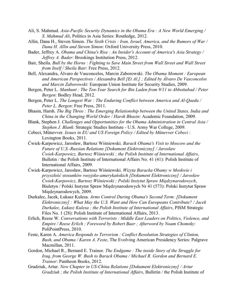 Ali, S. Mahmud. Asia-Pacific Security Dynamics in the Obama Era : A New World Emerging / S. Mahmud Ali, Politics in Asia Series: Routledge, 2012. Allin, Dana H., Steven Simon. The Sixth Crisis : Iran, Israel, America, and the Rumors of War / Dana H. Allin and Steven Simon: Oxford University Press, 2010. Bader, Jeffrey A. Obama and China's Rise : An Insider's Account of America's Asia Strategy / Jeffrey A. Bader: Brookings Institution Press, 2012. Bair, Sheila. Bull by the Horns : Fighting to Save Main Street from Wall Street and Wall Street from Itself / Sheila Bair: Free Press, 2012. Bell, Alexandra, Álvaro de Vasconcelos, Marcin Zaborowski. The Obama Moment : European and American Perspectives / Alexandra Bell [Et Al.] ; Edited by Álvaro De Vasconcelos and Marcin Zaborowski: European Union Institute for Security Studies, 2009. Bergen, Peter L. Manhunt : The Ten-Year Search for Bin Laden from 9/11 to Abbottabad / Peter Bergen: Bodley Head, 2012. Bergen, Peter L. The Longest War : The Enduring Conflict between America and Al-Qaeda / Peter L. Bergen: Free Press, 2011. Bhasin, Harsh. The Big Three : The Emerging Relationship between the United States, India and China in the Changing World Order / Harsh Bhasin: Academic Foundation, 2009. Blank, Stephen J. Challenges and Opportunities for the Obama Administration in Central Asia / Stephen J. Blank: Strategic Studies Institute - U.S. Army War College, 2009. Cebeci, Münevver. Issues in EU and US Foreign Policy / Edited by Münevver Cebeci : Lexington Books, 2011. Ćwiek-Karpowicz, Jarosław, Bartosz Wiśniewski. Barack Obama's Visit to Moscow and the Future of U.S.-Russian Relations [Dokument Elektroniczny] / Jarosław Ćwiek-Karpowicz, Bartosz Wiśniewski ; the Polish Institute of International Affairs, Bulletin / the Polish Institute of International Affairs No. 41 (41): Polish Institute of International Affairs, 2009. Ćwiek-Karpowicz, Jarosław, Bartosz Wiśniewski. Wizyta Baracka Obamy w Moskwie i przyszłość stosunków rosyjsko-amerykańskich [Dokument Elektroniczny] / Jarosław Ćwiek-Karpowicz, Bartosz Wiśniewski ; Polski Instytut Spraw Międzynarodowych, Biuletyn / Polski Instytut Spraw Międzynarodowych Nr 41 (573): Polski Instytut Spraw Międzynarodowych, 2009. Durkalec, Jacek, Łukasz Kulesa. Arms Control During Obama's Second Term: [Dokument Elektroniczny] : What May the U.S. Want and How Can Europeans Contribute? / Jacek Durkalec, Łukasz Kulesa ; the Polish Institute of International Affairs, PISM Strategic Files No. 1 (28): Polish Institute of International Affairs, 2013. Erlich, Reese W. Conversations with Terrorists : Middle East Leaders on Politics, Violence, and Empire / Reese Erlich ; Foreword by Robert Baer ; Afterword by Noam Chomsky: PoliPointPress, 2010. Feste, Karen A. America Responds to Terrorism : Conflict Resolution Strategies of Clinton, Bush, and Obama / Karen A. Feste, The Evolving American Presidency Series: Palgrave Macmillan, 2011. Gordon, Michael R., Bernard E. Trainor. The Endgame : The inside Story of the Struggle for Iraq, from George W. Bush to Barack Obama / Michael R. Gordon and Bernard E. Trainor: Pantheon Books, 2012. Gradziuk, Artur. New Chapter in US-China Relations [Dokument Elektroniczny] / Artur Gradziuk ; the Polish Institute of International Affairs, Bulletin / the Polish Institute of International Affairs No. 32 (108): Polish Institute of International Affairs, 2010. Górka-Winter, Beata. Missile Defense Program: Obama Administration's New Approach [Dokument Elektroniczny] / Beata Górka-Winter ; the Polish Institute of International Affairs, Bulletin / the Polish Institute of International Affairs No. 52 (52): Polish Institute of International Affairs, 2009. Górka-Winter, Beata. Program obrony przeciwrakietowej – nowe założenia administracji Baracka Obamy [Dokument Elektroniczny] / Beata Górka-Winter ; Polski Instytut Spraw Międzynarodowych, Biuletyn / Polski Instytut Spraw Międzynarodowych Nr 52 (584): Polski Instytut Spraw Międzynarodowych, 2009. Hao, Yufan. Sino-American Relations : Challenges Ahead / Edited by Yufan Hao: Ashgate, 2010. Hinnebusch, Raymond. Syrian Foreign Policy and the United States : From Bush to Obama / Raymond Hinnebusch [Et Al.], St Andrews Papers on Contemporary Syria: University of St Andrews Centre for Syrian Studies. School of International Relations, 2010. Ifill, Gwen. The Breakthrough : Politics and Race in the Age of Obama / Gwen Ifill: Doubleday, 2009. Indyk, Martin, Kenneth Guy Lieberthal, Michael E. O'Hanlon. Bending History : Barack Obama's Foreign Policy / Martin S. Indyk, Kenneth G. Lieberthal, Michael E. O'hanlon, Brookings Focus Books: Brookings Institution Press, 2012. Koulish, Robert Edwin. Immigration and American Democracy : Subverting the Rule of Law / Robert Koulish: Routledge, 2010. Kownacki, Rafał. Kwestie prawne związane z realizacją decyzji USA o zamknięciu więzienia w Guantanamo [Dokument Elektroniczny] / Rafał Kownacki ; Polski Instytut Spraw Międzynarodowych, Biuletyn / Polski Instytut Spraw Międzynarodowych Nr 12 (544): Polski Instytut Spraw Międzynarodowych, 2009. Kownacki, Rafał. Legal Questions Raised by Implementation of Guantanamo Closure Decision [Dokument Elektroniczny] / Rafał Kownacki ; the Polish Institute of International Affairs, Bulletin / the Polish Institute of International Affairs No. 12 (12): Polish Institute of International Affairs, 2009. Kulesa, Łukasz. Impact of U.S. Nuclear Reductions on European Security [Dokument Elektroniczny] / Łukasz Kulesa ; the Polish Institute of International Affairs, Bulletin / the Polish Institute of International Affairs No. 26 (479): Polish Institute of International Affairs, 2013. Kuttner, Robert. Obama's Challenge : America's Economic Crisis and the Power of a Transformative Presidency / Robert Kuttner: Chelsea Green Publishing, 2008. Körber, Stiftung. Grenzen der Macht: Europa und Amerika in einer neuen Weltordnung [Dokument Elektroniczny] : 145. Bergedo