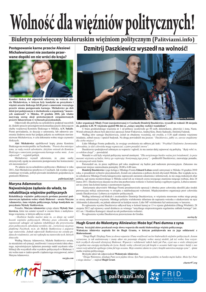 Wolność dla więźniów politycznych! Biuletyn poświęcony białoruskim więźniom politycznym (Palitviazni.info) Postępowanie karne przeciw Alesiowi Michalewiczowi nie zostanie przerwane dopóki on nie wróci do kraju? Komitet śledczy dał odpowiedź odmowną na wniosek Alesia Michalewicza, w którym były kandydat na prezydenta i więzień aresztu śledczego KGB prosi o umorzenie wszczętego przeciw niemu postępowania karnego. Michalewicz po dziś dzień jest podejrzanym w dochodzeniu o organizację “masowych zamieszek” w Mińsku, 19 grudnia 2010, jak władze nazywają szereg akcji protestacyjnych zorganizowanych przeciw fałszerstwom w wyborach prezydenckich. Odpowiedź dla polityka na uchodźstwie podpisał naczelnik ds. śledztw przeciw przestępstwom komunikacyjnym i dotyczącym służby wojskowej Komitetu Śledczego w Mińsku, A.N. Sukało. Pismo powiadamia, że decyzja o umorzeniu, lub odmowie umorzenia śledztwa może być podjęta jedynie za osobistym stawiennictwem Michalewicza, w celu dokonania wobec niego czynności śledczych. Aleś Michalewicz opublikował kopię pisma Komitetu Śledczego na swoim profilu na Facebooku. “Prawie dwa miesiące temu, za radą swoich adwokatów, złożyłem wniosek do Komitetu Śledczego o umorzenie postępowania karnego wobec mnie. A oto odpowiedź” – wyjaśnił polityk. Michalewicz wyraził zdziwienie, że „inne osoby otrzymywały zgodę na umorzenie postępowania bez konieczności ich stawiennictwa”. Po udaniu się na uchodźstwo polityczne z Białorusi w roku 2011, Aleś Michalewicz przebywa w Czechach. Jak wynika z jego ostatniego wywiadu, polityk prowadzi działalność gospodarczą za granicami Białorusi. palitviazni.info Maryna Adamowicz: Najważniejsze żądanie do władz, to rehabilitacja więźniów politycznych Rehabilitacja więźniów politycznych powinna pozostać podstawowym żądaniem wobec władz Białorusi – uważa Maryna Adamowicz, żona więźnia politycznego, byłego kandydata na prezydenta Mykoły Statkiewicza. Ponadto, Maryna Adamowicz cytuje zdanie Mykoły Statkiewicza, które ten ostatni wyraził w swoim liście z mohylewskiego więzienia, w którym odbywa wyrok: - Osobiście bardzo martwi mnie to, co dzieje się wokół kwestii więźniów politycznych. Obrońcy praw człowieka zaproponowali odstąpić od żądania rehabilitacji dla przywrócenia praw politycznych, odwołania wyroków, itd.., zwróciwszy się przez platformę Facebook, m.in. do Mykoły Statkiewicza o poparcie tego stanowiska. Jednak odpowiedź Statkiewicza nie została podana do wiadomości, ani nie wpłynęła na stanowisko tych, których dotyczyła. Według Maryny Adamowicz, Mykoła Statkiewicz uważa, że niezależnie od sytuacji, możliwości i rzeczywistości dnia obecnego, najważniejszym żądaniem pozostaje nadal uzyskanie rehabilitacji dla wszystkich ofiar wyroków politycznych w Białorusi. I nie wolno nam w żaden sposób z żądania tego zrezygnować, mówi Maryna Adamowicz. racyja.com Dzmitrij Daszkiewicz wyszedł na wolność! Lider organizacji Młody Front (zarejestrowanej w Czechach) Dzmitrij Daszkiewicz, wyszedł na wolność 28 sierpnia ok. godziny 6.20. W więzieniu spędził 986 dni za „rażący umyślny rozbój i wandalizm”. U bram grodnieńskiego więzienia nr 1 od północy oczekiwało go 50 osób, dziennikarze, aktywiści i żona, Nasta. Wśród zebranych obecni byli aktywiści opozycji Artutr Finkiewicz, Andrej Kim, Denis Sadouski, Dzmitrij Fedoruk. Według słów samego Daszkiewicza, został on obudzony wcześniej, niż zwykle, o 5.30 zjadł ostatnie więzienne śniadanie, zebrał rzeczy i opuścił budynek. Na drogę powiedzieli mu jeszcze: “Daszkiewicz, jakby co, zawsze znajdziemy dla ciebie miejsce”. Lider Młodego Frontu podkreśla, że swojego uwolnienia nie odbiera jak łaski: “Przykład Uladzimira Jaromienaka udowadnia, że dziś człowieka mogą wypuszczać, a jutro posadzić znowu”. Daszkiewicz podziękował zebranym za wsparcie i ogłosił, że ma zamiar dalej zajmować się polityką. “Będę robić to, co robiłem dotąd”, - powiedział. Warunki w celi były więzień polityczny nazwał znośnymi. “Dla uwięzionego bardzo ważna jest świadomość, że poza murami więzienia są ludzie, którzy go wspierają i kontynuują jego pracę”, - podkreślił Daszkiewicz, zauważając ponadto, że otrzymywał wiele listów. Potwierdził on, że przez najbliższe pół roku znajdować się będzie pod nadzorem prewencyjnym. Zakazano mu opuszczać miejsce zamieszkania pomiędzy 20.00 a 6.00 rano. Dzmitrij Daszkiewicz i jego kolega z Młodego Frontu Eduard Lobau zostali zatrzymani w Mińsku 18 grudnia 2010 roku, w przeddzień wyborów prezydenckich. Zostali oni oskarżenia o pobicie dwóch obywateli Mińska. Bez względu na to, że członkowie Młodego Frontu kategorycznie zaprzeczali zarzutom oskarżenia i informowali, że nie znają rzekomych ofiar pobicia, sąd rejonu moskiewskiego w Mińsku uznał ich za winnych czynu noszącego znamiona rażącego rozboju, dnia 24 marca 2011. Daszkiewicza skazano na dwa lata pozbawienia wolności w kolonii karnej o ogólnym rygorze, Lobawa natomiast na cztery lata kolonii karnej o zaostrzonym rygorze. Zatrzymanie aktywistów Młodego Frontu przedstawiciele opozycji i obrońcy praw człowieka określili jako środek prewencyjny milicji zastosowany w związku z nadchodzącymi wyborami. Międzynarodowe organizacje praw człowieka uznały Daszkiewicza i Lobawa za więźniów politycznych. Według informacji od bliskich i zwolenników Dzmitrija Daszkiewicza, w więzieniu stosowano wobec niego presję ze strony administracji więzienia. Młodego polityka wielokrotnie skłaniano do napisania wniosku o ułaskawienie na ręce Aleksandra Łukaszenki, on jednak odmawiał za każdym razem. Lider MF wielokrotnie był umieszczany w karcerze. Po ogłoszeniu wyroku Daszkiewicz odbywał karę w kolonii karnej nr 13 w rejonie głubokskim (Okręg Witebski). 28 sie