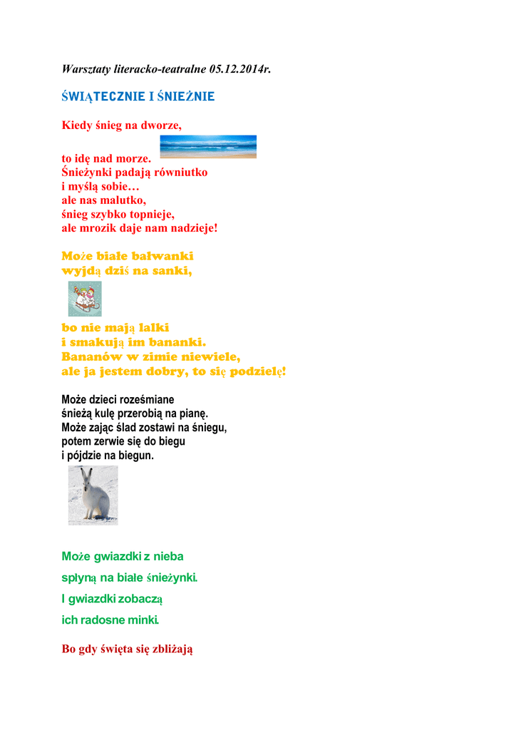 Warsztaty literacko-teatralne 05.12.2014r. ŚWIĄTECZNIE I ŚNIEŻNIE Kiedy śnieg na dworze, to idę nad morze. Śnieżynki padają równiutko i myślą sobie… ale nas malutko, śnieg szybko topnieje, ale mrozik daje nam nadzieje! Może białe bałwanki wyjdą dziś na sanki, bo nie mają lalki i smakują im bananki. Bananów w zimie niewiele, ale ja jestem dobry, to się podzielę! Może dzieci roześmiane śnieżą kulę przerobią na pianę. Może zając ślad zostawi na śniegu, potem zerwie się do biegu i pójdzie na biegun. Może gwiazdki z nieba spłyną na białe śnieżynki. I gwiazdki zobaczą ich radosne minki. Bo gdy święta się zbliżają wtedy drzewa je witają, wtedy swoje życie mają. Czas to piękny i magiczny już układam stroik śliczny. Czas pokoju i tej ciszy, co mamusia ją usłyszy. Czas świąteczny dla rodziny lubią chłopcy i dziewczyny! Autorzy: Oliwia-lat 6, Brygida-lat 5, Eryk-lat 6, Lena-lat6, Danuta-lat 5, Michał-lat 6.