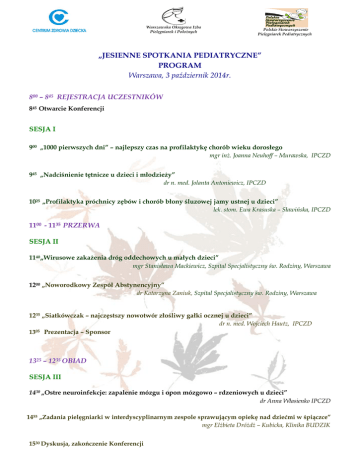 Warszawska Okręgowa Izba Pielęgniarek i Położnych Polskie Stowarzyszenie Pielęgniarek Pediatrycznych „JESIENNE SPOTKANIA PEDIATRYCZNE” PROGRAM Warszawa, 3 październik 2014r. 800 – 845 REJESTRACJA UCZESTNIKÓW 845 Otwarcie Konferencji SESJA I 900 „1000 pierwszych dni” – najlepszy czas na profilaktykę chorób wieku dorosłego mgr inż. Joanna Neuhoff – Murawska, IPCZD 945 „Nadciśnienie tętnicze u dzieci i młodzieży” dr n. med. Jolanta Antoniewicz, IPCZD 1025 „Profilaktyka próchnicy zębów i chorób błony śluzowej jamy ustnej u dzieci” lek. stom. Ewa Krasuska – Sławińska, IPCZD 1100 - 1135 PRZERWA SESJA II 1140„Wirusowe zakażenia dróg oddechowych u małych dzieci” mgr Stanisława Mackiewicz, Szpital Specjalistyczny św. Rodziny, Warszawa 1200 „Noworodkowy Zespół Abstynencyjny” dr Katarzyna Zaniuk, Szpital Specjalistyczny św. Rodziny, Warszawa 1235 „Siatkówczak – najczęstszy nowotwór złośliwy gałki ocznej u dzieci” dr n. med. Wojciech Hautz, IPCZD 1305 Prezentacja – Sponsor 1325 – 1235 OBIAD SESJA III 1430 „Ostre neuroinfekcje: zapalenie mózgu i opon mózgowo – rdzeniowych u dzieci” dr Anna Własienko IPCZD 1455 „Zadania pielęgniarki w interdyscyplinarnym zespole sprawującym opiekę nad dziećmi w śpiączce” mgr Elżbieta Dróżdż – Kubicka, Klinika BUDZIK 1530 Dyskusja, zakończenie Konferencji