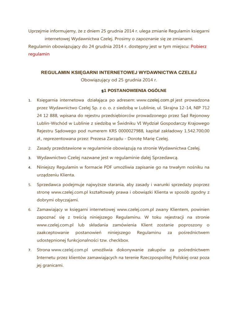 Uprzejmie informujemy, że z dniem 25 grudnia 2014 r. ulega zmianie Regulamin księgarni internetowej Wydawnictwa Czelej. Prosimy o zapoznanie się ze zmianami. Regulamin obowiązujący do 24 grudnia 2014 r. dostępny jest w tym miejscu: Pobierz regulamin REGULAMIN KSIĘGARNI INTERNETOWEJ WYDAWNICTWA CZELEJ Obowiązujący od 25 grudnia 2014 r. §1 1. POSTANOWIENIA OGÓLNE Księgarnia internetowa działająca po adresem: www.czelej.com.pl jest prowadzona przez Wydawnictwo Czelej Sp. z o. o. z siedzibą w Lublinie, ul. Skrajna 12-14, NIP 712 24 12 888, wpisana do rejestru przedsiębiorców prowadzonego przez Sąd Rejonowy Lublin-Wschód w Lublinie z siedzibą w Świdniku VI Wydział Gospodarczy Krajowego Rejestru Sądowego pod numerem KRS 0000027988, kapitał zakładowy 1.542.700,00 zł., reprezentowana przez: Prezesa Zarządu - Dorotę Marię Czelej. 2. Zasady przedstawione w regulaminie obowiązują na stronie Wydawnictwa Czelej. 3. Wydawnictwo Czelej nazwane jest w regulaminie dalej Sprzedawcą. 4. Niniejszy Regulamin w formacie PDF umożliwia zapisanie go na trwałym nośniku na urządzeniu Klienta. 5. Sprzedawca podejmuje najwyższe starania, aby zasady i warunki sprzedaży poprzez stronę www.czelej.com.pl kształtowały prawa i obowiązki Klienta w sposób zgodny z dobrymi obyczajami. 6. Zamawiający w księgarni internetowej www.czelej.com.pl zwany Klientem, powinien zapoznać się z treścią niniejszego Regulaminu. W toku rejestracji na stronie www.czelej.com.pl lub składania zamówienia Klient zostanie poproszony o zaakceptowanie postanowień niniejszego Regulaminu za pośrednictwem udostępnionej funkcjonalności tzw. checkbox. 7. Strona www.czelej.com.pl umożliwia dokonywanie zakupów za pośrednictwem Internetu przez klientów zamawiających na terenie Rzeczpospolitej Polskiej oraz poza jej granicami. 8. Sprzedający nie pobiera żadnych opłat za komunikację z nim z wykorzystaniem środków porozumiewania na odległość, a Klient poniesie jej koszty w wysokości wynikającej z umowy jaką zawarł z osobą trzecią świadczącą na jego rzecz określoną usługę umożliwiającą porozumiewanie na odległość. §2 1. INFORMACJE O PRODUKTACH Informacje o produktach dostępnych w asortymencie Sprzedającego stanowią zaproszenie do zawarcia umowy w rozumieniu art. 71 Kodeksu cywilnego. 2. Ceny książek i innych produktów znajdujących się w księgarni internetowej Sprzedawcy: a) są podane w złotych polskich i zawierają podatek VAT, b) nie zawierają kosztów dostawy. Koszty dostawy zależą od sposobu dostarczenia produktu, od wartości oraz wielkości zamówienia i podawane są przy wyborze sposobu dostawy produktu przez Klienta. Informacja na temat całkowitej wartości zamówienia jest prezentowana w podsumowaniu zamówienia po wybraniu przez Klienta formy dostawy i płatności. Przed zatwierdzeniem zamówienia Klient powinien samodzielnie sprawdzić koszt dostawy na stronie: Rabaty, koszty - dotyczy wysyłki Pocztą Polską Warunki zakupu Warunki zakupu dla prenumeratorów* Kwota zakupu Koszty wysyłki Rabat Koszty wysyłki Rabat do 200 PLN przedpłata płatność on-line 12,00 PLN 0% 12,00 PLN 15% do 200 za pobraniem 16,00 PLN 0% 16,00 PLN 15% 0,00 PLN 0% 0,00 PLN 15% PLN powyżej 200 PLN Rabaty, koszty - dotyczy wysyłki pocztą kurierską Warunki zakupu Kwota zakupu Warunki zakupu dla prenumeratorów* Koszty wysyłki Rabat Koszty wysyłki Rabat do 200 PLN przedpłata płatność on-line 13,00 PLN 0% 13,00 PLN 15% do 200 za pobraniem 16,00 PLN 0% 16,00 PLN 15% 0,00 PLN 0% 0,00 PLN PLN powyżej 200 PLN *) dla prenumeratorów czasopism: 3. 1. Dermatologia Praktyczna 2. Medycyna i pasje 3. Magazyn stomatologiczny 4. Neurologia Praktyczna 5. Gastroenterologia Praktyczna Sprzedający zastrzega sobie prawo do dokonywania na bieżąco zmian w cenach produktów oraz do przeprowadzania i odwoływania wszelkiego rodzaju akcji promocyjnych. Przy czym odwołanie akcji promocyjnych, nie ma wpływu na zamówienia złożone przed datą wejścia w życie zmiany ceny, warunków akcji promocyjnych lub wyprzedaży. 4. Promocje w księgarni internetowej www.czelej.com.pl nie podlegają łączeniu, o ile regulamin danej promocji nie stanowi inaczej. §3 1. ZASADY ZAMAWIANIA Zamówienia składane za pośrednictwem strony www.czelej.com.pl oraz adresu email: [email protected] można składać 24 godziny na dobę, 7 dni w tygodniu. Natomiast w przypadku zamówień telefonicznych zamówienia są przyjmowane w dni robocze w godzinach 8:00-16:00. 2. Sprzedający dopuszcza istnienie przerw technicznych, wyłączających księgarnię internetową z przyjmowania i realizacji zamówień Klientów, na temat których zamieści stosowną informację na stronie internetowej www.czelej.com.pl. 3. Sprzedawca nie ponosi odpowiedzialności za zakłócenia i przerwy w funkcjonowaniu księgarni internetowej niedozwolonym Wydawnictwa działaniem osób Czelej, trzecich spowodowane lub siłą niekompatybilność wyższą, księgarni internetowej Sprzedawcy z oprogramowaniem Klienta. 4. Realizacja zamówień następuje w dni robocze, z wyłączeniem dni zamkniętych magazynu księgarni Sprzedającego (np. na czas przeprowadzenia inwentaryzacji, przerwy techniczne). 5. Przez złożenie zamówienia za pośrednictwem strony www.czelej.com.pl należy rozumieć dodanie do Koszyka produktów z oferty księgarni internetowej, następnie wypełnienie "Formularza zamówienia" zgodnie z informacjami podanymi w w/w formularzu (wybór rodzaju i miejsca dostawy, formy płatności) oraz kliknięcie przycisku potwierdzającego zamówienie i obowiązek płatności. 6. Zamówienie za pośrednictwem strony www.czelej.com.pl może być dokonane w jednej z dwóch form: a) po zarejestrowaniu się - w przypadku nowego Klienta, lub zalogowaniu - w przypadku Klienta, który ma już konto Klienta w księgarni internetowej Sprzedającego, b) bez zalogowania (szybkie zakupy). 7. Dopuszcza się również złożenie zamówienia przez