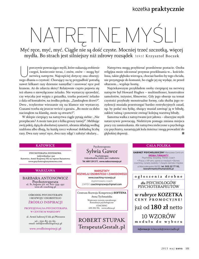 kozetka praktycznie Natrętne myśli Myć ręce, myć, myć. Ciągle nie są dość czyste. Mocniej trzeć szczotką, więcej mydła. Bo strach jest silniejszy niż zdrowy rozsądek te k s t K r z y sz tof Boczek U porczywie powracające myśli, które nakazują zrobienie czegoś, koniecznie teraz, i znów, znów – mogą być nerwicą natręctw. Najczęściej dotyczy ona obsesyjnego dbania o czystość. Chorujący na tę przypadłość potrafią nawet kilkaset razy dziennie namydlać i szorować ręce pod kranem. Aż do zdarcia skóry! Relatywnie często pojawia się też obawa o niewyłączone żelazko. Nie wystarczy sprawdzić, czy wtyczka jest wyjęta z gniazdka, trzeba postawić żelazko z dala od kontaktów, na środku pokoju. „Zamknąłem drzwi?”. Dwu-, trzykrotne wieszanie się na klamce nie wystarczy. Czasami trzeba się jeszcze wrócić z garażu. „Bo może za słabo nacisnąłem na klamkę, może są otwarte?”. W sklepie cierpiący na natręctwa ciągle pytają siebie: „Nie przepłacam? A może tam jest o kilka groszy taniej?”. Meblując swój pokój, dążą do absolutnej symetrii, ubrania składają według szablonu albo dbają, by każdą rzecz wykonać dokładną liczbę razy. Dwa razy umyć ręce, dwa razy zdjąć i założyć okulary... katowice Psychoterapia systemowa indywidualna i par Katowice, Armii Krajowej 192 na wprost Bażantowa www.psychoterapiasystemowa.com Natręctwa mogą przybierać przedziwne postacie. Osoba religijna może odczuwać przymus przeklinania w... kościele. Inna, także głęboko wierząca, chociaż bardzo by tego chciała, nie przystępuje do komunii, bo ciągle jej się wydaje, że przed ołtarzem... wypluje hostię. Najciekawszym przykładem osoby cierpiącej na nerwicę natręctw był Howard Hughes – multimilioner, konstruktor samolotów, inżynier, filmowiec. Gdy jego obsesje na temat czystości przybrały monstrualne formy, cała służba jego rezydencji musiała przestrzegać bardzo restrykcyjnych zasad, np. by podać mu łyżkę, służący musiał zawinąć ją w bibułę, zakleić taśmą i ponownie owinąć kolejną warstwą bibuły. Samotna walka z natręctwami jest jałowa – obsesyjne myśli natarczywie powracają. Niektórym pomaga zmiana miejsca pracy czy zamieszkania. Ale natręctwa nieleczone u psychologa czy psychiatry, narastają jak kula śnieżna i mogą prowadzić do głębokiej depresji. Psychoterapeuta Sylwia Gawor Psychoterapia: Indywidualna, rodzin, par i małżeństw Tel. 609 129 377, www.radoscrozwoju.pl Warszawa WARSZTATY ROZWOJU OSOBISTEGO I ZAWODOWEGO BARBARA ANTONOWICZ Psychoterapeuta www.coaching-rozwoju.pl dyplomowany coach ZAPISY: [email protected] ul. St.Augusta 5A tel. 601-334-441 www.ab-coaching.pl Ośrodek Psychoterapii i Rozwoju Osobistego Źródło Inspiracji PROFESJONALNA PSYCHOTERAPIA W CENTRUM WARSZAWY al. Armii ludowej 6 lok.42,Warszawa tel.: 530-85-55-65, email: [email protected] www.zrodloinspiracji.pl Centrum Rozwoju Kompetencji SOFTENA Anna Tychmańska Wspieranie rozwoju zawodowego Konsultacje psychologiczne COACHING 695-392-701, www.softena.pl ROBERT STUPAK TerapeutaGestalt.pl cała polska Gabinet Psychologiczny Warszawa Centrum IWONA FIRMANTY Psycholog, Socjolog, Trener, Coach • Praca z VIP-ami, opinie w mediach • Biznes coaching, rozwój osobisty • Związki damsko-męskie ul.Marszałkowska 84/92; tel. 505 22 77 93, [email protected] ogłoszenia drobne dla PSYCHOLOGÓW PSYCHOTERAPEUTÓW w rubryce KOZETKA CE N Y PRO M OC Y J N E ! już od 180 zł netto 10 WZORÓW modułu do wyboru informacje: [email protected] 2013 maj sens 101