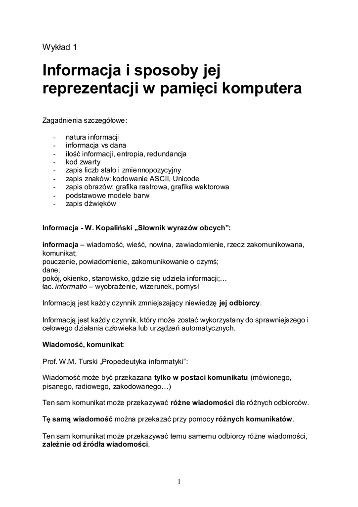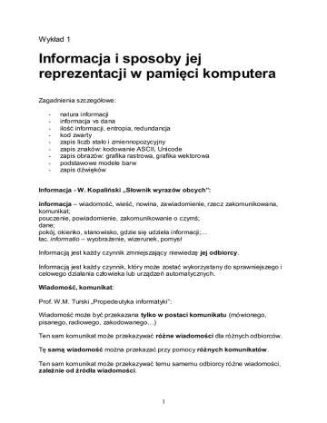 Wykład 1 Informacja i sposoby jej reprezentacji w pamięci komputera Zagadnienia szczegółowe: - natura informacji informacja vs dana ilość informacji, entropia, redundancja kod zwarty zapis liczb stało i zmiennopozycyjny zapis znaków: kodowanie ASCII, Unicode zapis obrazów: grafika rastrowa, grafika wektorowa podstawowe modele barw zapis dźwięków Informacja - W. Kopaliński „Słownik wyrazów obcych”: informacja – wiadomość, wieść, nowina, zawiadomienie, rzecz zakomunikowana, komunikat; pouczenie, powiadomienie, zakomunikowanie o czymś; dane; pokój, okienko, stanowisko, gdzie się udziela informacji;… łac. informatio – wyobrażenie, wizerunek, pomysł Informacją jest każdy czynnik zmniejszający niewiedzę jej odbiorcy. Informacją jest każdy czynnik, który może zostać wykorzystany do sprawniejszego i celowego działania człowieka lub urządzeń automatycznych. Wiadomość, komunikat: Prof. W.M. Turski „Propedeutyka informatyki”: Wiadomość może być przekazana tylko w postaci komunikatu (mówionego, pisanego, radiowego, zakodowanego…) Ten sam komunikat może przekazywać różne wiadomości dla różnych odbiorców. Tę samą wiadomość można przekazać przy pomocy różnych komunikatów. Ten sam komunikat może przekazywać temu samemu odbiorcy różne wiadomości, zależnie od źródła wiadomości. 1 Różne określenia informacji: N. Winer wprowadzając pojęcie informacji stwierdza, że „... Jest ona jak gdyby nazwą treści pochodzącą ze świata ze wnętrznego w miarę, jak do niego przystosujemy swoje zmysły...”. R. Aschby uważa, że „...informacja to przekazy wanie różnorodności”. W. Głuszkow określa informację „...jako wszelkie wiadomości o procesach i stanach dowolnej natury, które mogą być odbierane przez organy zmysłowe człowieka lub przyrodę..”. A. Mazurkiewicz „Informacją nazywamy wielkość abstrakcyjną, która może być przecho wywana w pe wnych obiektach, przesyłana między pewnymi obiektami, przetwarzana w pe wnych obiektach i stosowana do stero wania pe wnymi obiektami, przy czym przez obiekty rozumie się organizmy żywe, urządzenia techniczne oraz systemy takich obiektów.” W. Flakiewicz określa informację jako: „... czynnik, który zwiększa naszą wiedzę o otaczającej nas rzeczy wistości”. E. Niedzielska przytacza francuskie przysłowie, które głosi : „bez materii nie ma nic, bez energii wszystko jest nieruchome, bez informacji jest chaos”. Informacja vs dana: Informacja to obiekt abstrakcyjny, który w postaci zakodowanej (jako dana) może być przechowywany (na nośniku danych), przesyłany (np. głosem, falą elektromagnetyczną), przetwarzany (w wyniku operacji arytmetycznych lub logicznych wykonywanych np. w trakcie realizacji algorytmu) i może służyć do sterowania (np. komputera, którym steruje program będący zakodowaną informacją). Dana to formalna reprezentacja określonej treści (informac ji) nadająca się do przechowywania, przesyłania i przetwarzania (np. imię, nazwisko, wzrost, waga, data ur.) Abstrakcyjna informacja jest przekazywana za pomocą konkretnej danej (informacja jest wynikiem interpretacji danej). Sposoby przekazywania informacji: - dane liczbowe (różne formaty danych) - dane tekstowe (ciągi znaków) - obrazy (rysunki, schematy, mapy, fotografie czarno-białe lub kolorowe) - animacje - filmy i nagrania video - dźwięki Teoria informacji: Teoria informacji zajmuje się teoretycznymi aspektami informacji. Twórcą podstaw teorii informacji był Claude Shannon (1916-2001). Teoria informacji jest działem cybernetyki (dział nauki zajmujący się sterowaniem), 2 powstała w okresie II wojny światowej na skutek badań nad budową sieci łączności oraz nad urządzeniami i metodami kryptografii (do szyfrowania wiadomości). Ilość informacji: Komunikat (czyli odpowiednio zakodowane i przedstawione dane), którego prawdopodobieństwo wystąpienia wynosi p, zawiera 1 k log 2 p jednostek ilości informacji zwanych bitami. Dany komunikat zawiera tym więcej informacji, im mniejsze jest prawdopodobieństwo wystąpienia sytuacji w nim opisanej. Zauważmy, że gdy źródło nadaje tylko jeden komunikat, którego prawdopodobieństwo wynosi 1, to niesie on 0 bitów informacji. Bity i bajty: Gdy prawdopodobieństwo wystąpienia komunikatu wynosi 1/2 (np. wynik rzutu monetą), to niesie on 1 bit informacji. Stąd też umownie pozycję, na której z równym prawdopodobieństwem (wynoszącym 1/2) może wystąpić 0 lub 1 nazywa się bitem. Bit jest również jednostką pojemności pamięci komputerów. 8 bitów = 1 bajt (B) odpowiada jednemu znakowi (wg ASCII). 1024 B = 1 KB (kilobajt) 1024 KB = (1024)2 B = 1 048 576 B = 1 MB (1 megebajt) 3 1024 MB = (1024) B = 1 073 741 824 B = 1 GB (1 gigabajt) 1024 GB = (1024)4 B = 1 099 511 627 776 B = 1 TB (1 terabajt). Entropia informacyjna źródła: Jeśli źródło nadaje n różnych komunikatów z prawdopodobieństwami pi (i=1,..., n), to średnia ważona ilość informacji w komunikatach z tego źródła wyrażana wzorem: n 1 H pi log 2 i 1 pi nosi nazwę entropii informacyjnej źródła informacji. Zauważmy, że: H > 0 (H=0, gdy p=1) H < log2n (H= log2n, gdy pi =1/n (i=1,..., n)) Redundancja: Jeśli komunikatom, które występują z prawdopodobieństwami pi (i=1,..., n), przypisano słowa kodowe o długościach N i (i=1,..,n), to wielkość: 3 n L pi N i i 1 nazywamy średnią długością słowa kodowego. Różnicę R = L - H nazywamy redundancją kodu (nadmiarowością), a wielkość 1H/L nazywamy względną redundancją kodu. Twierdzenie Shannona: Przy każdym sposobie kodowania zachodzi nierówność H < L. Zatem R > 0. Kod zwarty: Dla każdego zbioru komunikatów można zbudować różne kody. Szczególne znaczenie mają kody: - jednoznaczny - zwarty - o równej długości słów kodowych. Kod jednoznaczny to kod, w którym żaden ciąg kodowy nie jest początkiem innego ciągu. Kod zwarty to