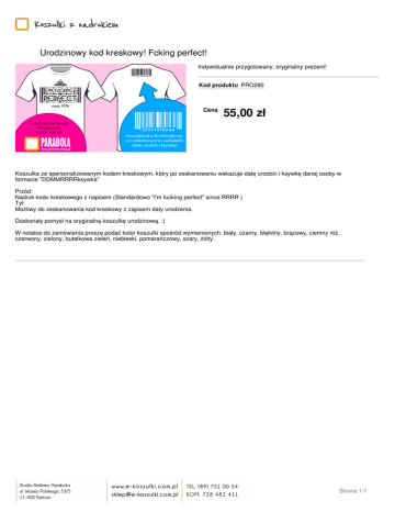 Urodzinowy kod kreskowy! Fcking perfect! Indywidualnie przygotowany, oryginalny prezent! Kod produktu PRO280 Cena 55,00 zł Koszulka ze spersonalizowanym kodem kreskowym, który po zeskanowaniu wskazuje datę urodzin i ksywkę danej osoby w formacie "DDMMRRRRksywka" Przód: Nadruk kodu kreskowego z napisem (Standardowo "I'm fucking perfect" since RRRR ) Tył: Możliwy do zeskanowania kod kreskowy z zapisem daty urodzenia. Doskonały pomysł na oryginalną koszulkę urodzinową. :) W notatce do zamówienia proszę podać kolor koszulki spośród wymienionych: biały, czarny, błękitny, brązowy, ciemny róż, czerwony, zielony, butelkowa zieleń, niebieski, pomarańczowy, szary, żółty. Strona 1/1