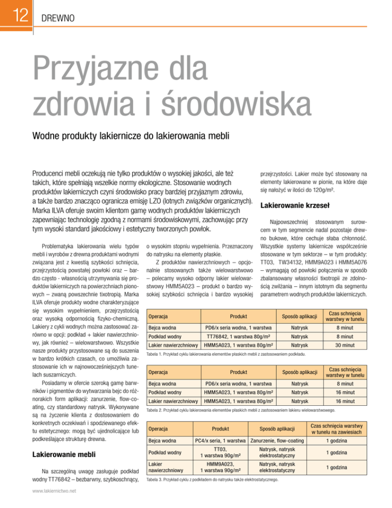 12 drewno Przyjazne dla zdrowia i środowiska Wodne produkty lakiernicze do lakierowania mebli Producenci mebli oczekują nie tylko produktów o wysokiej jakości, ale też przejrzystości. Lakier może być stosowany na elementy lakierowane w pionie, na które daje takich, które spełniają wszelkie normy ekologiczne. Stosowanie wodnych się nałożyć w ilości do 120g/m². produktów lakierniczych czyni środowisko pracy bardziej przyjaznym zdrowiu, a także bardzo znacząco ogranicza emisję LZO (lotnych związków organicznych). Lakierowanie krzeseł Marka ILVA oferuje swoim klientom gamę wodnych produktów lakierniczych zapewniając technologię zgodną z normami środowiskowymi, zachowując przy Najpowszechniej stosowanym surowtym wysoki standard jakościowy i estetyczny tworzonych powłok. cem w tym segmencie nadal pozostaje drewProblematyka lakierowania wielu typów mebli i wyrobów z drewna produktami wodnymi związana jest z kwestią szybkości schnięcia, przejrzystością powstałej powłoki oraz – bardzo często - własnością utrzymywania się produktów lakierniczych na powierzchniach pionowych – zwaną powszechnie tixotropią. Marka ILVA oferuje produkty wodne charakteryzujące się wysokim wypełnieniem, przejrzystością oraz wysoką odpornością fizyko-chemiczną. Lakiery z cykli wodnych można zastosować zarówno w opcji: podkład + lakier nawierzchniowy, jak również – wielowarstwowo. Wszystkie nasze produkty przystosowane są do suszenia w bardzo krótkich czasach, co umożliwia zastosowanie ich w najnowocześniejszych tunelach suszarniczych. Posiadamy w ofercie szeroką gamę barwników i pigmentów do wytwarzania bejc do różnorakich form aplikacji: zanurzenie, flow-coating, czy standardowy natrysk. Wykonywane są na życzenie klienta z dostosowaniem do konkretnych oczekiwań i spodziewanego efektu estetycznego: mogą być ujednolicające lub podkreślające strukturę drewna. Lakierowanie mebli Na szczególną uwagę zasługuje podkład wodny TT76842 – bezbarwny, szybkoschnący, www.lakiernictwo.net o wysokim stopniu wypełnienia. Przeznaczony do natrysku na elementy płaskie. Z produktów nawierzchniowych – opcjonalnie stosowanych także wielowarstwowo – polecamy wysoko odporny lakier wielowarstwowy HMM5A023 – produkt o bardzo wysokiej szybkości schnięcia i bardzo wysokiej no bukowe, które cechuje słaba chłonność. Wszystkie systemy lakiernicze współcześnie stosowane w tym sektorze – w tym produkty: TT03, TW34132, HMM9A023 i HMM5A076 – wymagają od powłoki połączenia w sposób zbalansowany własności tixotropii ze zdolnością zwilżania – innym istotnym dla segmentu parametrem wodnych produktów lakierniczych. Produkt Sposób aplikacji Czas schnięcia warstwy w tunelu Bejca wodna PD6/x seria wodna, 1 warstwa Natrysk 8 minut Podkład wodny TT76842, 1 warstwa 80g/m² Natrysk 8 minut HMM5A023, 1 warstwa 80g/m² Natrysk 30 minut Operacja Lakier nawierzchniowy Tabela 1. Przykład cyklu lakierowania elementów płaskich mebli z zastosowaniem podkładu. Operacja Produkt Sposób aplikacji Czas schnięcia warstwy w tunelu Bejca wodna PD6/x seria wodna, 1 warstwa Natrysk 8 minut Podkład wodny HMM5A023, 1 warstwa 80g/m² Natrysk 16 minut Lakier nawierzchniowy HMM5A023, 1 warstwa 80g/m² Natrysk 16 minut Tabela 2. Przykład cyklu lakierowania elementów płaskich mebli z zastosowaniem lakieru wielowarstwowego. Operacja Bejca wodna Produkt Sposób aplikacji PC4/x seria, 1 warstwa Zanurzenie, flow-coating Czas schnięcia warstwy w tunelu na zawiesiach 1 godzina Podkład wodny TT03, 1 warstwa 90g/m² Natrysk, natrysk elektrostatyczny 1 godzina Lakier nawierzchniowy HMM9A023, 1 warstwa 90g/m² Natrysk, natrysk elektrostatyczny 1 godzina Tabela 3. Przykład cyklu z podkładem do natrysku także elektrostatycznego. drewno Innym przykładem produktu o zbalansowanej równowadze parametrów tixotropia/ rozciągliwość jest produkt HMM9A013 dedykowany do atomizacji rotacyjnej – z zastosowaniem urządzeń rotacyjnych takich jak dyski i dzwony. Wszystkie przedstawione cykle wodne mogą być zastosowane w odniesieniu do siedzisk i oparć ze sklejek – w tym i giętych. Uzyskana powłoka odznacza się doskonałą jednorodnością, przejrzystością i zalewaniem mikroszczelin. Przedstawione cykle lakiernicze w tabelach 1-5 z dużym powodzeniem stosowane są też przez producentów drzwi wewnętrznych. Wodny system doboru emalii kryjących Marka ILVA oferuje gamę wodnych produktów lakierniczych zapewniając technologię zgodną z normami środowiskowymi i wysoki standard. Może on być wykorzystywany w sektorze frontów z MDF i mebli lakierowanych systemami kryjącymi. Propozycja emalii wodnych marki ILVA stanowi odpowiedź na zapotrzebowanie producentów mebli kuchennych i łazienkowych, producentów mebli dziecięcych oraz zabawek. Emalie wodne marki ILVA gwarantują możliwość dobrania lakieru o odpowiedniej barwie spośród standardowych palet kolorystycznych RAL i NCS. Na potrzeby wodnego systemu doboru kolorów opracowano i określono optymalne właściwości fizyko-chemiczne, jak lepkość i ciężary właściwe każdego z elementów systemu: tak 16 past barwiących, jak i grupy lakierów bazowych zwanych konwerterami. Pigmentowane elementy systemu przebadano pod kątem ich własności barwienia, pływalności i sposobu układania się w warstwie filmu lakierniczego, a także pod kątem stałości wybarwienia i odporności na czynniki niszczące. Wartym podkreślenia jest fakt, iż od wielu lat IVM Chemicals nie stosuje w produkowanych przez siebie pastach związków ołowiu i chromu sześciowartościowego, spełniając tym samym wymogi europejskiej normy EN 71-3. W dobie wdrażania technologii lakierniczych mających na celu ochronę środowiska pracy i ochronę środowiska naturalnego prezentujemy wodną linię obejmującą: Produkt Sposób aplikacji Czas schnięcia warstwy w tunelu na zawiesiach PC43/x seria, 1 warstwa Natrysk 1 