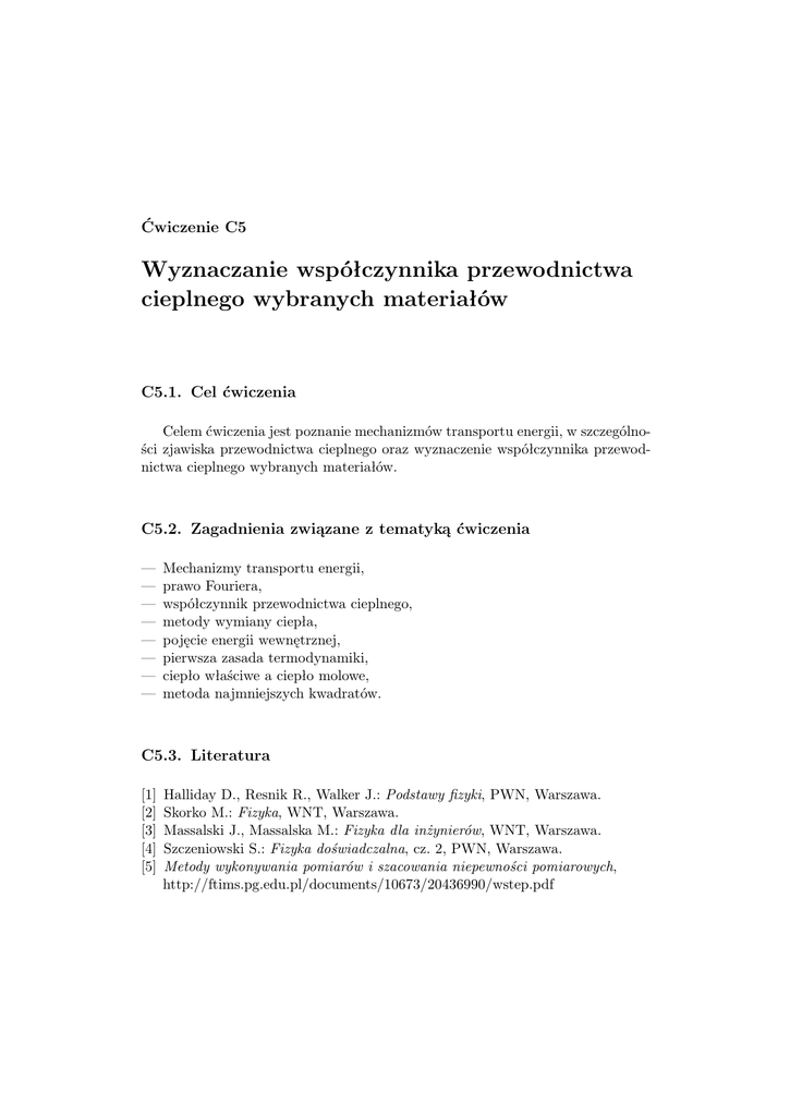 Ćwiczenie C5 Wyznaczanie współczynnika przewodnictwa cieplnego wybranych materiałów C5.1. Cel ćwiczenia Celem ćwiczenia jest poznanie mechanizmów transportu energii, w szczególności zjawiska przewodnictwa cieplnego oraz wyznaczenie współczynnika przewodnictwa cieplnego wybranych materiałów. C5.2. Zagadnienia związane z tematyką ćwiczenia — — — — — — — — Mechanizmy transportu energii, prawo Fouriera, współczynnik przewodnictwa cieplnego, metody wymiany ciepła, pojęcie energii wewnętrznej, pierwsza zasada termodynamiki, ciepło właściwe a ciepło molowe, metoda najmniejszych kwadratów. C5.3. Literatura [1] [2] [3] [4] [5] Halliday D., Resnik R., Walker J.: Podstawy fizyki, PWN, Warszawa. Skorko M.: Fizyka, WNT, Warszawa. Massalski J., Massalska M.: Fizyka dla inżynierów, WNT, Warszawa. Szczeniowski S.: Fizyka doświadczalna, cz. 2, PWN, Warszawa. Metody wykonywania pomiarów i szacowania niepewności pomiarowych, http://ftims.pg.edu.pl/documents/10673/20436990/wstep.pdf 36 Ćwiczenie 5 C5.4. Przebieg ćwiczenia i zadania do wykonania Układ doświadczalny Rysunek C5.1 przedstawia schemat, zaś rysunek C5.2 zdjęcie układu pomiarowego, na który składają się: 1 – parownik, 2 – grzejnik, 3 – komora grzejna, której temperaturę mierzymy czujnikiem T2, 4 – badany materiał (dysk o grubości d), 5 – metalowy dysk, którego temperaturę mierzymy czujnikiem T1, 6 – statyw, 7 – urządzenie pomiarowe, pozwalające na pomiar temperatury T1 i T2 (max. 100o C) oraz czasu (max. 1 h). W skład zestawu pomiarowego wchodzą również suwmiarka i rękawice ochronne (niezbędne przy manipulowaniu gorącą komorą grzejną). Rysunek C5.1. Schemat układu pomiarowego Przebieg doświadczenia Powyższy zestaw pomiarowy pozwala na wyznaczenie współczynnika przewodnictwa cieplnego materiałów będących słabymi przewodnikami ciepła za pomocą metody Lee. Metoda polega na doprowadzeniu układu do stanu, w którym metalowy dysk jest w równowadze cieplnej (ciepło pobierane przez dysk jest równe ciepłu traconemu, wtedy temperatura dysku stabilizuje się, T1 ≈ const.). Pomiary należy przeprowadzić w następujący sposób: Wyznaczanie współczynnika przewodnictwa cieplnego wybranych materiałów 37 Rysunek C5.2. Zdjęcie układu pomiarowego 1. Sprawdzić poziom wody w parowniku (powinien on być wypełniony co najmniej do połowy swojej wysokości). 2. Za pomocą suwmiarki zmierzyć średnicę powierzchni grzejnej (2r) i grubość dysku wykonanego z badanego materiału (d) – pomiary powtórzyć kilkukrotnie. 3. Zanotować masę metalowego dysku (M ) i jego ciepło właściwe (Cw ) – dane dostępne na stanowisku pomiarowym. 4. Zestawić układ według schematu pokazanego na Rysunku C5.1: — dysk wykonany z badanego materiału umieścić pomiędzy komorą grzejną i metalowym dyskiem; — sprawdzić czy wylot gorącego strumienia wody z komory grzejnej znajduje się nad zlewką; — podłączyć czujniki temperatury: T1 do metalowego dysku, T2 do komory grzejnej. 5. Włączyć grzejnik. 6. Poczekać około 15-20 minut, gorący strumień wody przepływając przez komorę grzejną sprawi, że jej temperatura T2 zacznie wzrastać. 7. Wymiana ciepła między komorą grzejną i metalowym dyskiem poprzez dysk wykonany z badanego materiału sprawi, że zacznie również rosnąć temperatura T1 metalowego dysku. 38 Ćwiczenie 5 8. Poczekać do momentu kiedy temperatura metalowego dysku ustabilizuje się (będzie prawie stała w czasie), co wyznacza stan równowagi cieplnej metalowgo dysku. 9. Zanotować temperatury T1 i T2 jako temperatury równowagi cieplnej T1R i T2R . 10. Założyć rękawice, ostrożnie podnieść komorę grzejną i wyjąć cienki izolujący krążek wykonany z badanego materiału. UWAGA: zachować szczególną ostrożność – wysoka temperatura zbiornika i wody. 11. Komorę grzejną postawić bezpośrednio na metalowy dysk. 12. Podgrzać metalowy dysk do temperatury około 10o C powyżej T1R . 13. Następnie założyć rękawice, komorę grzejną odłączyć od czujnika temperatury i zdjąć ją z metalowego dysku. UWAGA: zachować szczególną ostrożność przy zdejmowaniu komory grzejnej – wysoka temperatura zbiornika i wody. 14. Wyłączyć grzejnik. 15. Po około 2-3 min. przykryć metalowy dysk krążkiem wykonanym z badanego materiału. 16. Włączyć pomiar czasu i zarejestrować charakterystykę T1 (t) odczytując T1 co 30 s aż do temperatury około 10o C poniżej T1R . 17. Wykreślić T1 (t) i metodą graficzną lub najmniejszych kwadratów wyznaczyć dT1 dt (w zależności od zakresu temperatury będzie to nachylenie stycznej do krzywej T1 (t) w punkcie T1R lub nachylenie otrzymanej prostej T1 (t)). Zadania do wykonania C5.1. Wyznaczyć współczynnik przewodnictwa cieplnego wybranego materiału będącego słabym przewodnikiem ciepła. Uzupełnienie do zadania C5.1 Ciepło pobierane (Qp ) przez metalowy dysk będący w temperaturze T1R jest dostarczane z komory grzejnej będącej w temperaturze T2R na drodze przewodzenia ciepła przez badany (izolujacy) materiał o grubości d. Dlatego możemy zapisać, że w jednostce czasu: Qp = K T2R − T1R πr2 , d (C5.1) gdzie r jest promieniem powierzchni, przez którą ciepło jest wymieniane, zaś K jest współczynnikiem przewodzenia ciepła badanego materiału. Wyznaczanie współczynnika przewodnictwa cieplnego wybranych materiałów 39 Jednocześnie w procesie wymiany ciepła z otoczeniem (głównie przez promieniowanie cieplne) metalowy dysk traci ciepło (Qt ). Możemy je wyznaczyć poprzez pomiar szybkości chłodzenia dysku w okolicy temperatury jego równowagi cieplnej 1 T1R . Mając dT dt oraz masę dysku (M ) i jego ciepło właściwe (Cw ) możemy zapisać, że w jednostce czasu: dT1 Qt = M Cw . (C5.2) dt Wiedząc, że w stanie równowagi cieplnej w jednostce czasu metalowy dysk tyle samo ciepła pobiera od strony komory grzejnej (Qp ) ile traci od swojej s