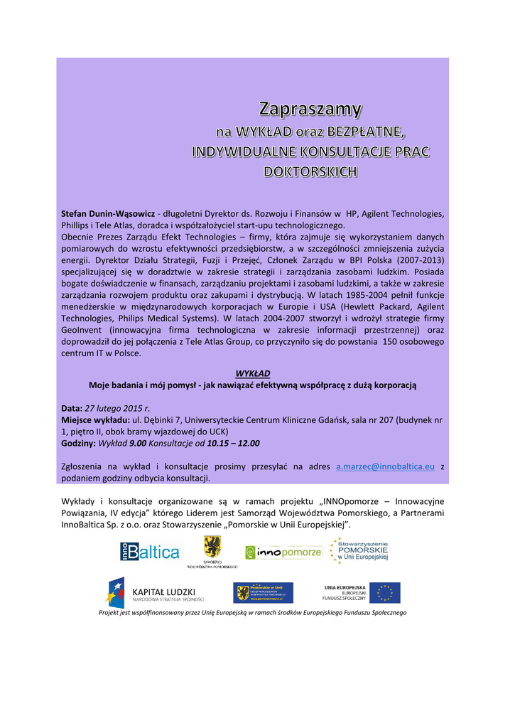 Stefan Dunin-Wąsowicz - długoletni Dyrektor ds. Rozwoju i Finansów w HP, Agilent Technologies, Phillips i Tele Atlas, doradca i współzałożyciel start-upu technologicznego. Obecnie Prezes Zarządu Efekt Technologies – firmy, która zajmuje się wykorzystaniem danych pomiarowych do wzrostu efektywności przedsiębiorstw, a w szczególności zmniejszenia zużycia energii. Dyrektor Działu Strategii, Fuzji i Przejęć, Członek Zarządu w BPI Polska (2007-2013) specjalizującej się w doradztwie w zakresie strategii i zarządzania zasobami ludzkim. Posiada bogate doświadczenie w finansach, zarządzaniu projektami i zasobami ludzkimi, a także w zakresie zarządzania rozwojem produktu oraz zakupami i dystrybucją. W latach 1985-2004 pełnił funkcje menedżerskie w międzynarodowych korporacjach w Europie i USA (Hewlett Packard, Agilent Technologies, Philips Medical Systems). W latach 2004-2007 stworzył i wdrożył strategie firmy GeoInvent (innowacyjna firma technologiczna w zakresie informacji przestrzennej) oraz doprowadził do jej połączenia z Tele Atlas Group, co przyczyniło się do powstania 150 osobowego centrum IT w Polsce. WYKŁAD Moje badania i mój pomysł - jak nawiązać efektywną współpracę z dużą korporacją Data: 27 lutego 2015 r. Miejsce wykładu: ul. Dębinki 7, Uniwersyteckie Centrum Kliniczne Gdańsk, sala nr 207 (budynek nr 1, piętro II, obok bramy wjazdowej do UCK) Godziny: Wykład 9.00 Konsultacje od 10.15 – 12.00 Zgłoszenia na wykład i konsultacje prosimy przesyłać na adres [email protected] z podaniem godziny odbycia konsultacji. Wykłady i konsultacje organizowane są w ramach projektu „INNOpomorze – Innowacyjne Powiązania, IV edycja” którego Liderem jest Samorząd Województwa Pomorskiego, a Partnerami InnoBaltica Sp. z o.o. oraz Stowarzyszenie „Pomorskie w Unii Europejskiej”. Projekt jest współfinansowany przez Unię Europejską w ramach środków Europejskiego Funduszu Społecznego