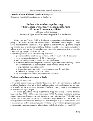 Uczenie się i egzamin w oczach nauczyciela Urszula Mazur, Elżbieta Tyralska-Wojtycza Okręgowa Komisja Egzaminacyjna w Krakowie Budowanie zaufania społecznego w kontekście współpracy z egzaminatorami i komunikowania wyników - refleksje z doświadczeń Pracowni Egzaminu Gimnazjalnego OKE w Krakowie Każdy rok współpracy OKE w Krakowie z potencjalnymi odbiorcami naszej pracy – uczniami, rodzicami nauczycielami, władzami oświatowymi… rodzi nowe doświadczenia i refleksje. Współpraca ta dotyczy wielu aspektów, których nie sposób ująć w niniejszym tekście, dlatego autorki opracowania ograniczyły zakres analiz jedynie do komunikowania wyników egzaminacyjnych uczniów i poprzedzającego go oceniania ich prac. Oto lista zagadnień, jakie chciałybyśmy poruszyć: »» poziom zaufania społecznego w kraju, czyli w jakich realiach działamy, »» wybrane zadania statutowe OKE w Krakowie, »» emocje towarzyszące egzaminowi gimnazjalnemu, »» działania podejmowane przez Pracownię Egzaminu Gimnazjalnego celem budowania i wzmacniania zaufania adresatów do naszej pracy: • współpraca z egzaminatorami, • komunikowanie wyników i udostępnianie prac do wglądów, • informacje o osiągnięciach uczniów, »» co można jeszcze zrobić, aby wzmocnić zaufanie? Poziom zaufania społecznego w kraju Czym jest zaufanie? Najogólniej rzecz ujmując, zaufanie tłumaczone jest jako zawierzenie, nadzieja, aprobata. Zaufany człowiek to ktoś, na kim można polegać, którego jest się pewnym, osoba sprawdzona, wypróbowana. Zaufać, to znaczy mieć przeświadczenie, że można zdać się na kogoś. W sferze prywatnej Polacy najbardziej ufają najbliższej i dalszej rodzinie (odpowiednio 99% i 90%) oraz znajomym (88%). W sferze publicznej nieomal powszechnym zaufaniem cieszą się instytucje charytatywne, jak Wielka Orkiestra Świątecznej Pomocy (85%) i Caritas (80%) oraz wojsko (84%). Od roku 2002 systematycznie wrasta zaufanie do instytucji państwowych. Czy tak samo ma się rzecz z zaufaniem do instytucji takich, jak na przykład okręgowe komisje egzaminacyjne, zwłaszcza że pierwsze egzaminy gimnazjalne odbyły się właśnie w roku 2002? 601 XIV Konferencja Diagnostyki Edukacyjnej, Opole 2008 Nie udzielimy odpowiedzi na to pytanie, lecz postaramy się przedstawić niektóre symptomy zaufania naszych bezpośrednich odbiorców do nas a także sposoby budowania tego pożądanego stanu rzeczy. Wybrane zadania statutowe OKE w Krakowie a zaufanie Zgodnie z § 5 Statutu OKE w Krakowie do zadań Wydziału Sprawdzianów, Egzaminów Gimnazjalnych i Matur w interesującej nas kwestii należy: • opracowywanie sprawozdań z przeprowadzonych (...) egzaminów gimnazjalnych (...), • opracowywanie materiałów pomocniczych dla doskonalenia nauczycieli w zakresie diagnozowania, oceniania, egzaminowania i badania osiągnięć edukacyjnych uczniów, • współpraca z innymi okręgowymi komisjami egzaminacyjnymi, Centralną Komisją Egzaminacyjną oraz kuratorami oświaty właściwymi ze względu na zasięg terytorialny Komisji, • wykonywanie zadań wynikających z przepisów w sprawie warunków i sposobu oceniania, klasyfikowania i promowania uczniów i słuchaczy oraz przeprowadzania egzaminów i sprawdzianów w szkołach publicznych. Zakres działań statutowych komisji jest szeroki i określa wszystkie konieczne działania związane z egzaminem zewnętrznym. W zasadzie można zapytać, po co w ogóle mówić o budowaniu zaufania, skoro egzaminy są obowiązkowe, a zatem każdy z uczestników tego przedsięwzięcia – szkoły, uczniowie i komisje egzaminacyjne – musi w nim uczestniczyć. A przecież każda ze stron powinna wykonywać swoje obowiązki solidnie – czyż to nie wystarczy? Jesteśmy po prostu zdani na współpracę, a zaufanie to jakiś superkomfort, stan hiperluksusowy – może w tej sytuacji zbędny? Jeśli jednak uświadomimy sobie, że Zaufanie wzmaga współpracę, a ta z kolei zwiększa poziom zaufania. Następuje sprzężenie zwrotne. (...) zaufanie to „zasób moralny”, którego ilość wzrasta, im bardziej się z niego korzysta, a który nieużywany zanika… (Serwis internetowy Civicpedia), to z pewnością nikt nie powinien mieć wątpliwości, że współdziałanie stron we wzajemnym zaufaniu jest po prostu niezbędne. Emocje towarzyszące egzaminowi gimnazjalnemu Można przypuszczać, że zdający doskonale znają formułę egzaminu gimnazjalnego, mimo to każdego roku egzamin budzi u wielu z nich spory dreszczyk emocji. Pewien poziom adrenaliny jest bardzo przydatny. Wiadomo powszechnie, że działa on mobilizująco. Nie powinien jednak budzić lęku. Tak więc uczniowie powinni być do niego należycie przygotowani. Uświadomienie sobie tych emocji pozwala przedsięwziąć odpowiednie kroki, tak by pomóc wszystkim uczestnikom egzaminu uwieńczyć sukcesem ten etap swojego życia. 602 Uczenie się i egzamin w oczach nauczyciela Co na przykład może budzić emocje egzaminacyjne uczniów? • Formuła egzaminu zewnętrznego a także związana z tym atmosfera podniosłości i odświętności. • Niepowtarzalność egzaminu, czyli brak możliwości poprawy uzyskanego wyniku. • Ocenianie prac przez egzaminatorów zewnętrznych. • Złożoność egzaminu – w części humanistycznej dotyczy umiejętności i wiadomości zdobywanych podczas lekcji z 3 przedmiotów i 3 ścieżek edukacyjnych, a w części matematyczno-przyrodniczej umiejętności i wiadomości z 5 przedmiotów i 7 ścieżek edukacyjnych. • Niepewność zdających, czy poradzą sobie z zadaniami. • Konieczność zmierzenia się z egzaminem, którego wyniki mają istotny wpływ na dalszą karierę szkolną. Co może budzić egzaminacyjne emocje nauczycieli/egzaminatorów? • Rodzaj sprawdzanych umiejętności a tym samym wymagania zawarte w zadaniach egzaminacyjnych. • Poziom przygotowania uczniów do egzaminu. • Sposób rozwiązywania przez uczniów zadań otwartych. • Wy