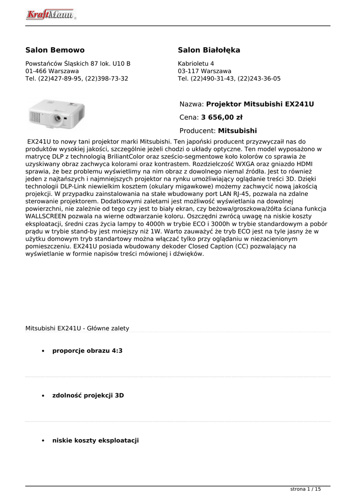 Salon Bemowo Salon Białołęka Powstańców Śląskich 87 lok. U10 B 01-466 Warszawa Tel. (22)427-89-95, (22)398-73-32 Kabrioletu 4 03-117 Warszawa Tel. (22)490-31-43, (22)243-36-05 Nazwa: Projektor Mitsubishi EX241U Cena: 3 656,00 zł Producent: Mitsubishi EX241U to nowy tani projektor marki Mitsubishi. Ten japoński producent przyzwyczaił nas do produktów wysokiej jakości, szczególnie jeżeli chodzi o układy optyczne. Ten model wyposażono w matrycę DLP z technologią BriliantColor oraz sześcio-segmentowe koło kolorów co sprawia że uzyskiwany obraz zachwyca kolorami oraz kontrastem. Rozdzielczość WXGA oraz gniazdo HDMI sprawia, że bez problemu wyświetlimy na nim obraz z dowolnego niemal źródła. Jest to również jeden z najtańszych i najmniejszych projektor na rynku umożliwiający oglądanie treści 3D. Dzięki technologii DLP-Link niewielkim kosztem (okulary migawkowe) możemy zachwycić nową jakością projekcji. W przypadku zainstalowania na stałe wbudowany port LAN RJ-45, pozwala na zdalne sterowanie projektorem. Dodatkowymi zaletami jest możliwość wyświetlania na dowolnej powierzchni, nie zależnie od tego czy jest to biały ekran, czy beżowa/groszkowa/żółta ściana funkcja WALLSCREEN pozwala na wierne odtwarzanie koloru. Oszczędni zwrócą uwagę na niskie koszty eksploatacji, średni czas życia lampy to 4000h w trybie ECO i 3000h w trybie standardowym a pobór prądu w trybie stand-by jest mniejszy niż 1W. Warto zauważyć że tryb ECO jest na tyle jasny że w użytku domowym tryb standartowy można włączać tylko przy oglądaniu w niezacienionym pomieszczeniu. EX241U posiada wbudowany dekoder Closed Caption (CC) pozwalający na wyświetlanie w formie napisów treści mówionej i dźwięków. Mitsubishi EX241U - Główne zalety proporcje obrazu 4:3 zdolność projekcji 3D niskie koszty eksploatacji strona 1 / 15 niska waga 2,5kg Mitsubishi EX241U - Parametry strona 2 / 15 Technologia: DLP strona 3 / 15 Jasno?? Std / Eco : 2600 ANSI Lumenów strona 4 / 15 Rozdzielczo?? rzeczywista: strona 5 / 15 XGA 1024x768 Rozdzielczo?? maksymalna: strona 6 / 15 UXGA 1600x1200 Kontrast: strona 7 / 15 2700:1 Format obrazu: strona 8 / 15 4:3 Ilo?? kolorów: strona 9 / 15 16,7 mln Cz?stotliwo?? pozioma: strona 10 / 15 31-99 khz Cz?stotliwo?? pionowa: strona 11 / 15 48-120 Hz Kompatybilno?? Video: strona 12 / 15 NTSC/NTSC 4.43/PAL (including PAL-M, N) / SECAM/PAL-60, Component Video; 480i/p (525i/p), 576i/p (625i/p), 720p (750p), 1080i/p (1125i/p 60Hz), 1080i/p (1125i/p 50Hz) strona 13 / 15 Gwarancja: 3 lata na projektor i 1 rok lub 500 godzin na lamp? strona 14 / 15 strona 15 / 15 Powered by TCPDF (www.tcpdf.org)